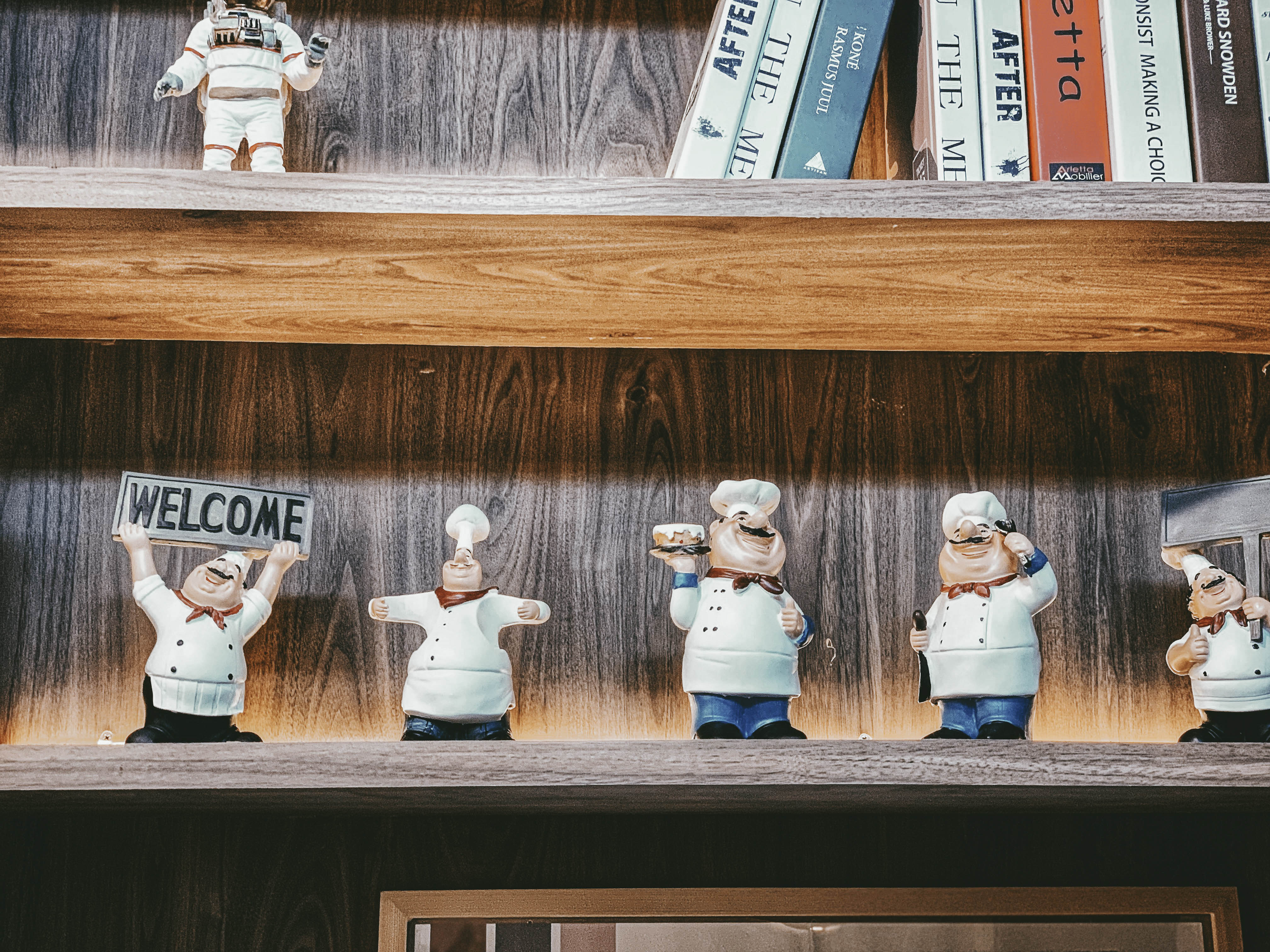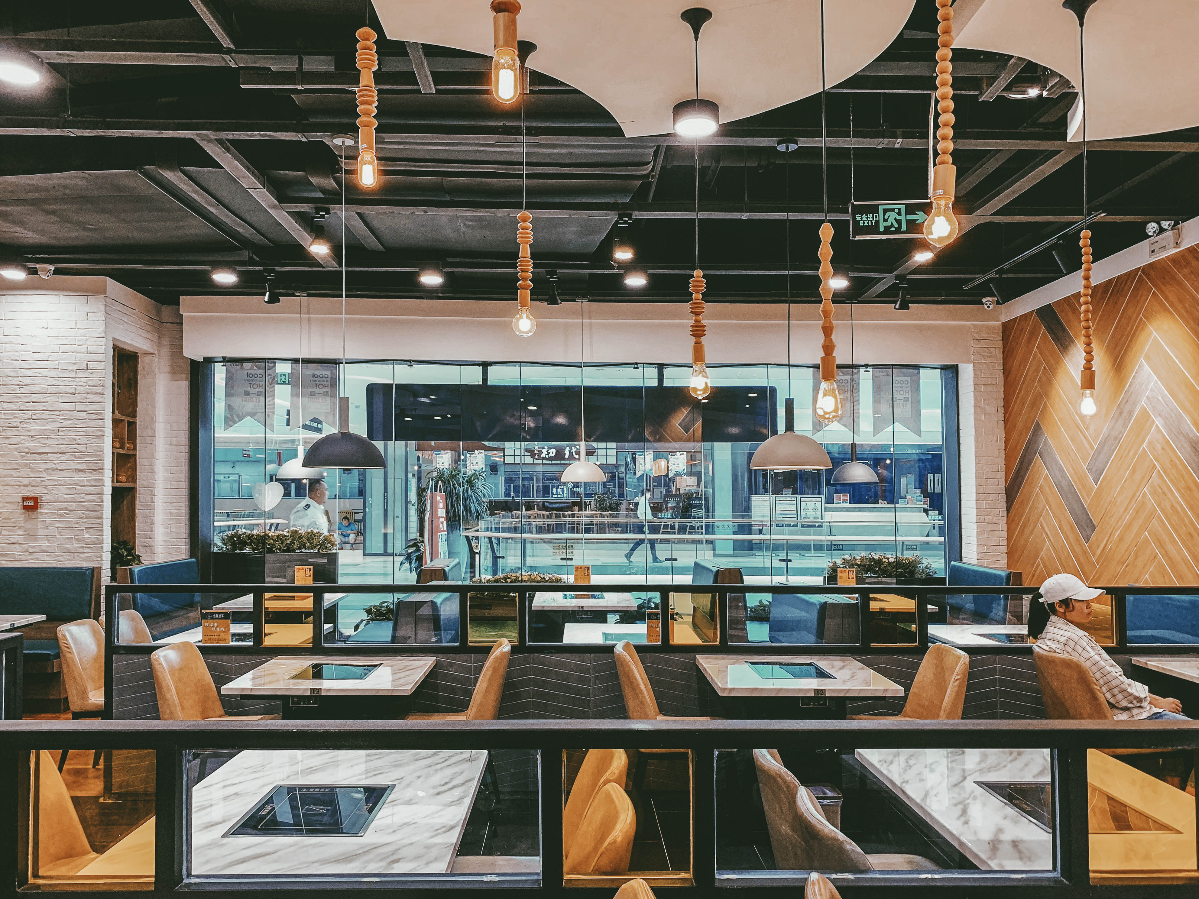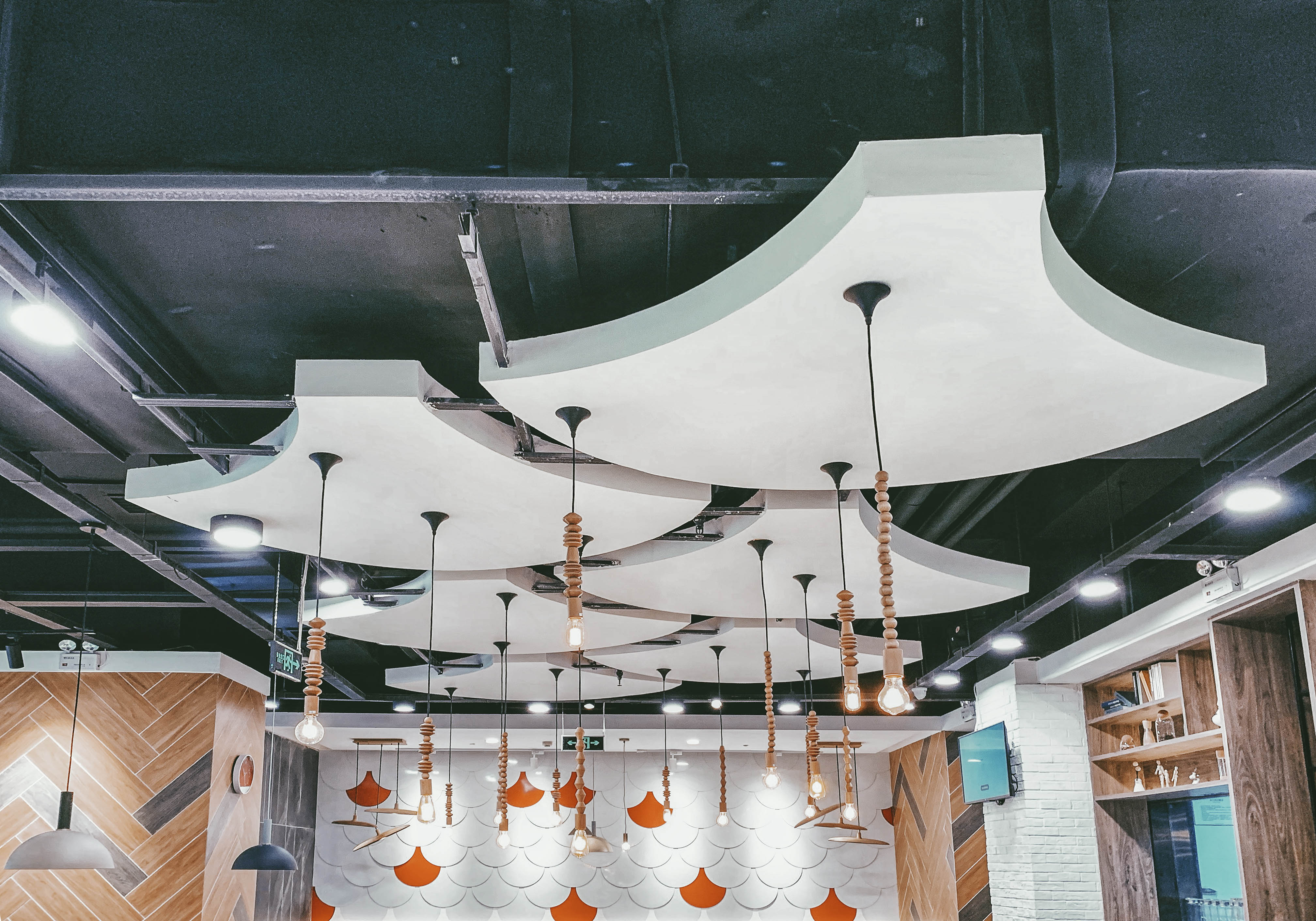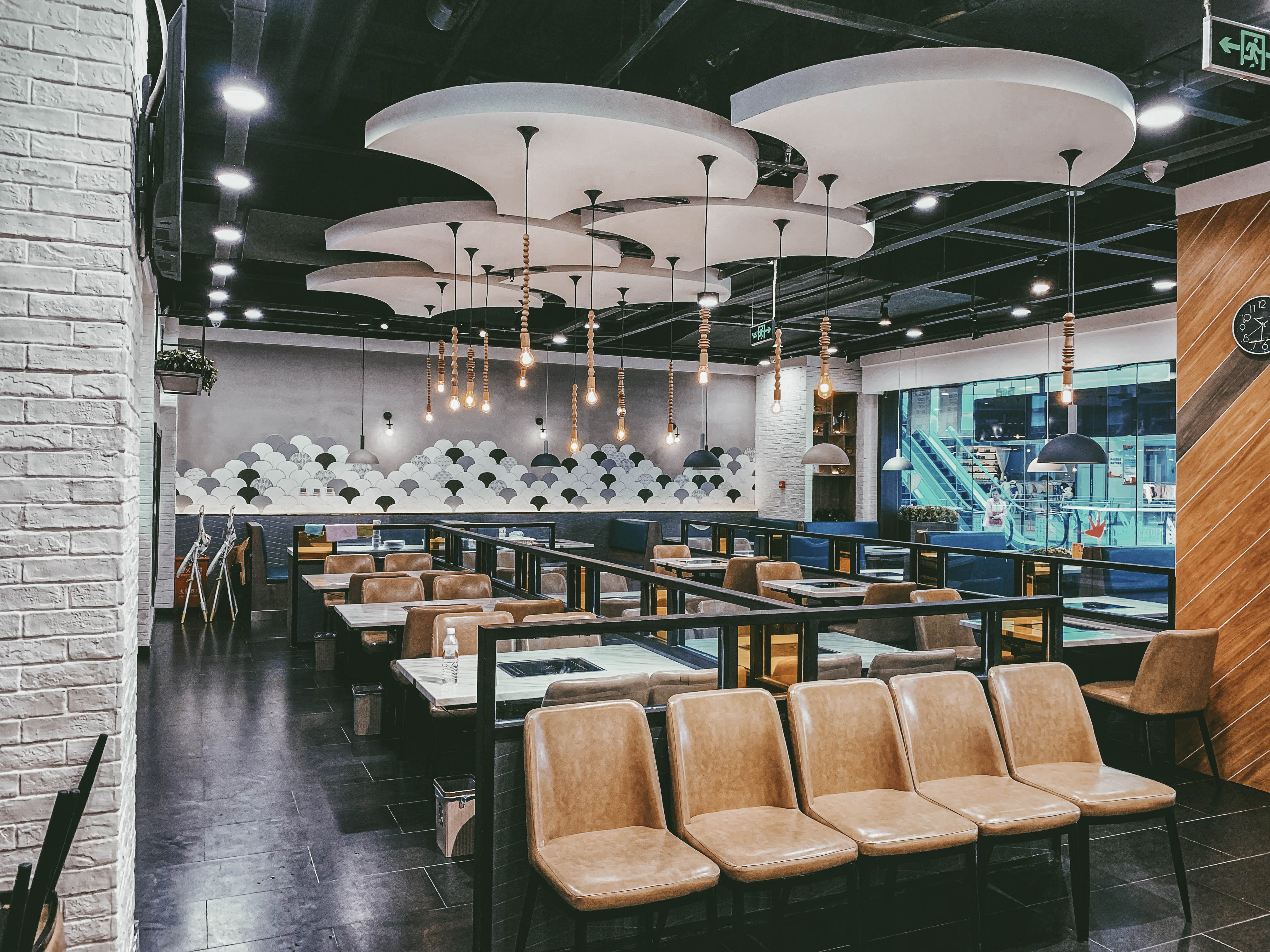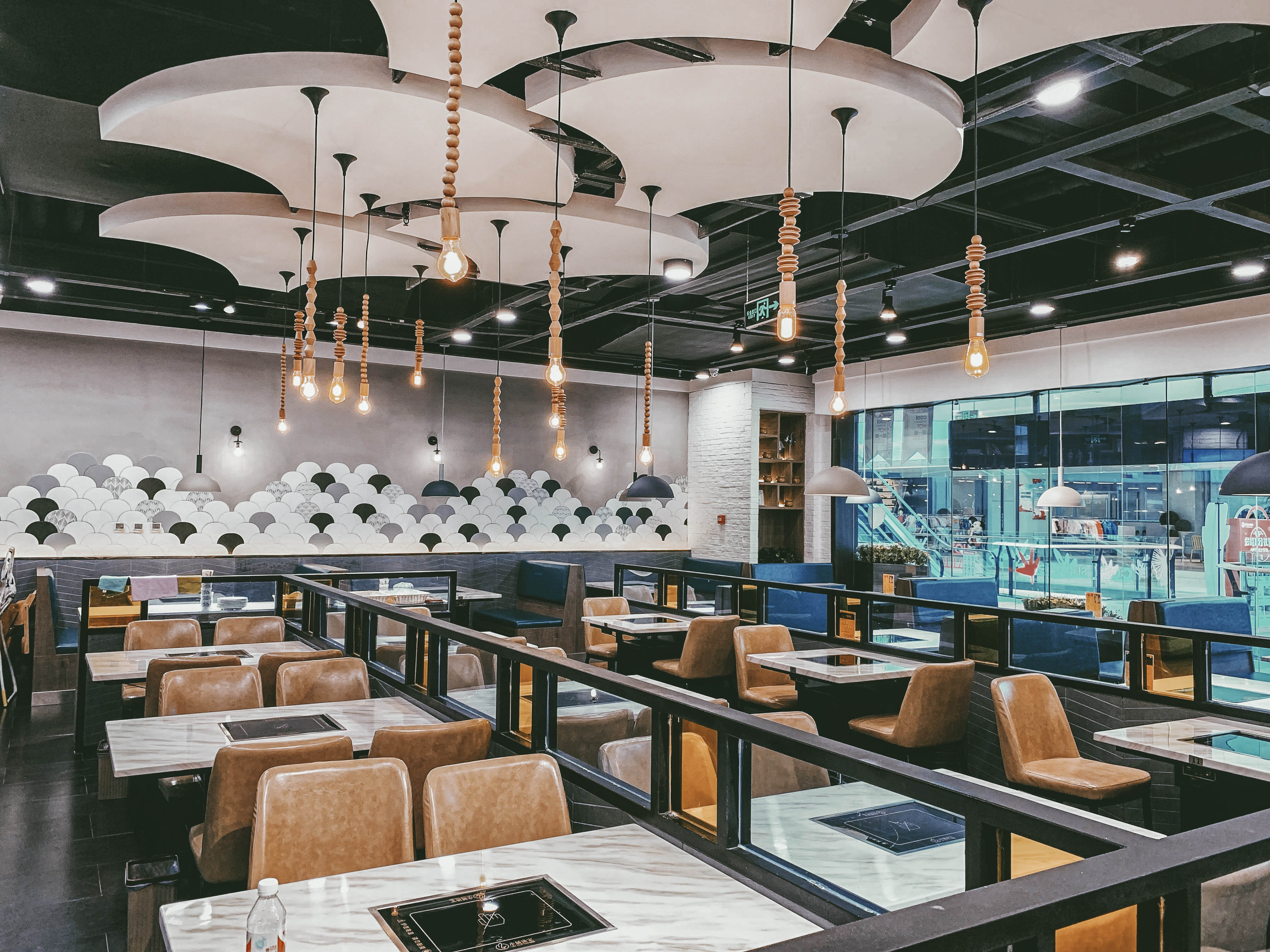 设计选材:为了反应美食烤鱼的元素应用的鱼骨的拼贴方式、灰色的大块面石头纹理偏爱自然材质的江南审美,设计强化了内部平坦与空白的空间。