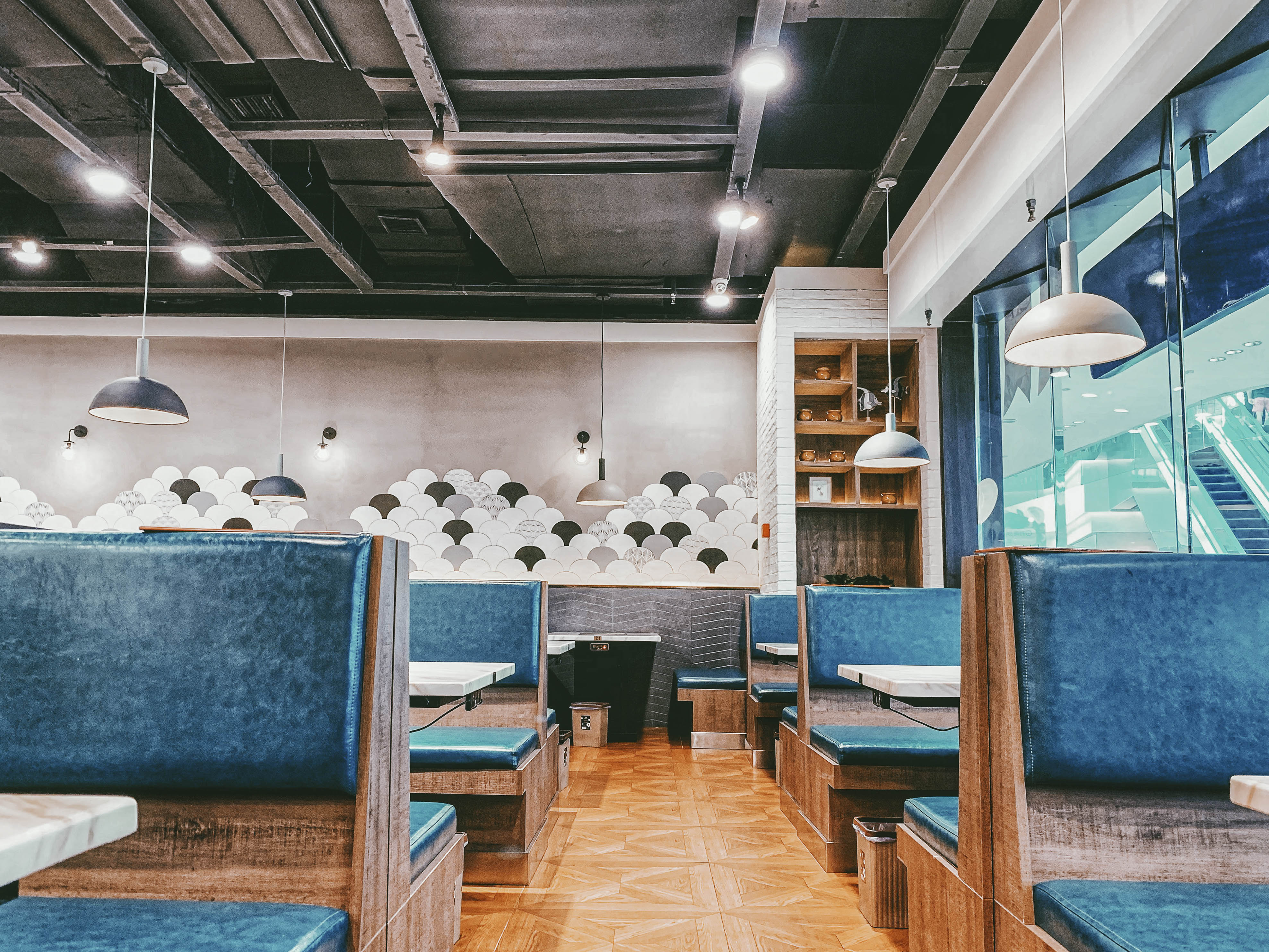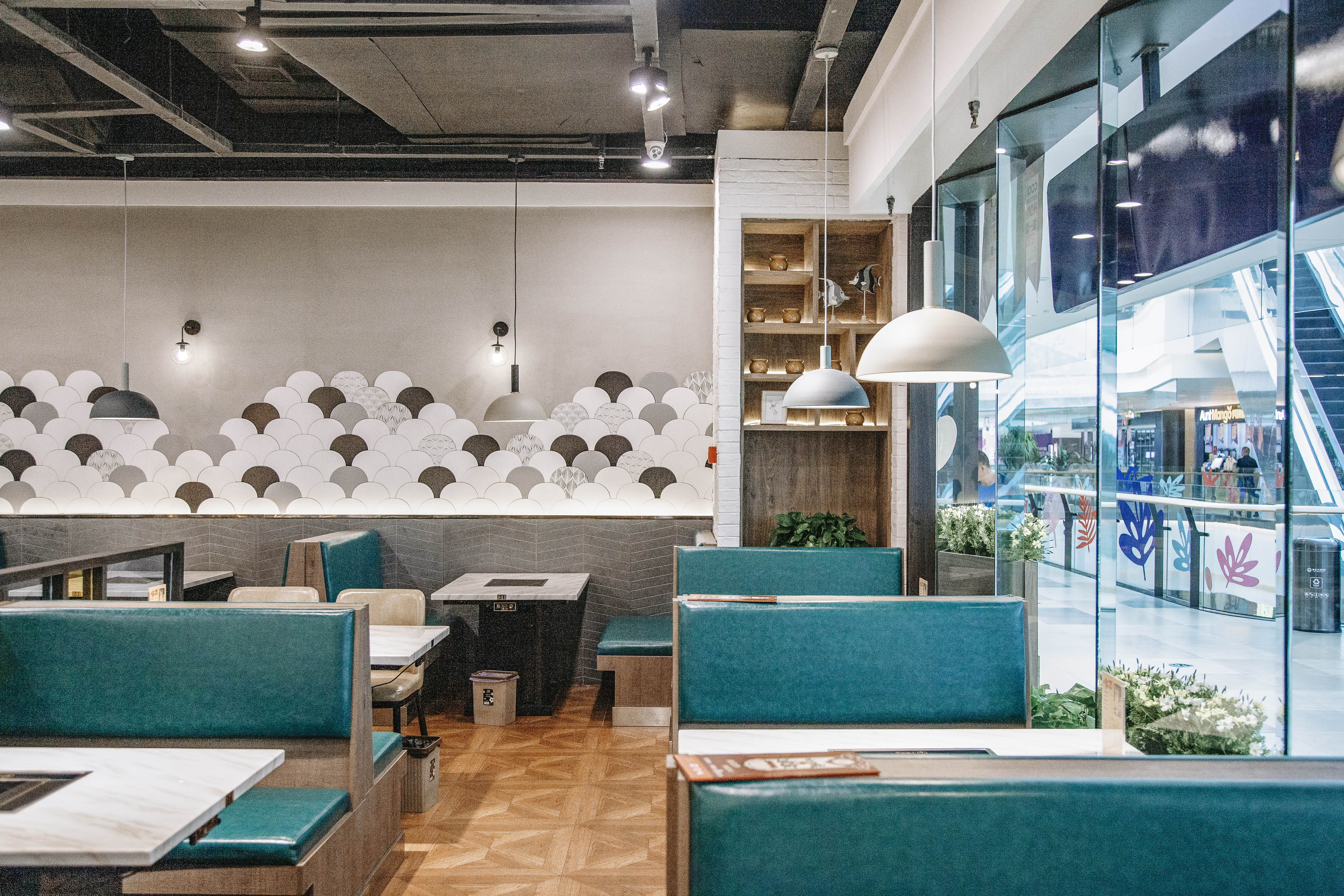 项目定位:推开小城渔家的金属大门,入眼便是明亮的色块碰撞。饱和度偏低的蓝色为主色调,让客人即刻被水乡温柔的氛围包裹。暖色与冷色互相中和,不同材质发生对话,丰富了空间的层次感。通过视角的变换以及不同弧形,鱼鳞元素的应用,强调主题的变化性和和谐感