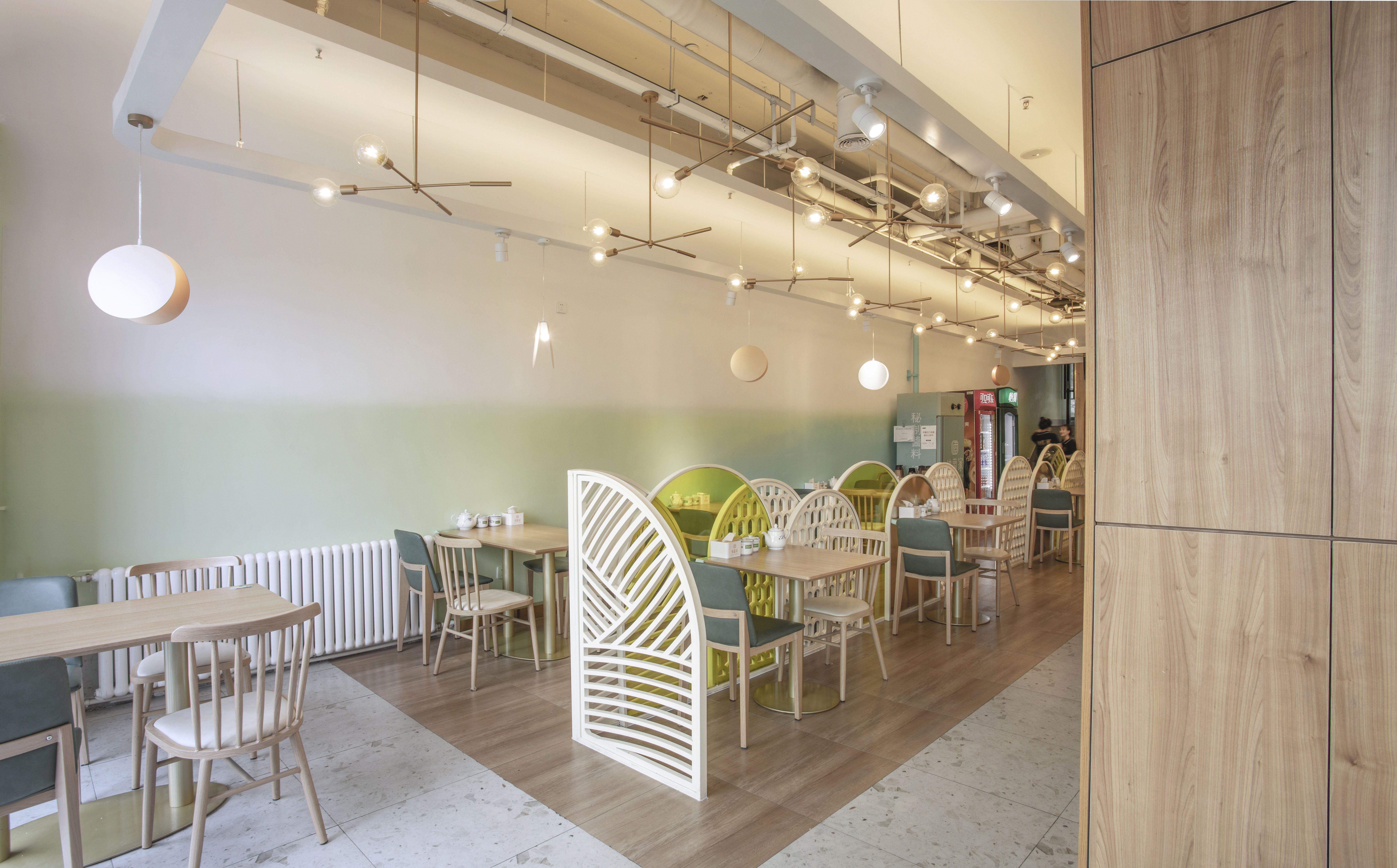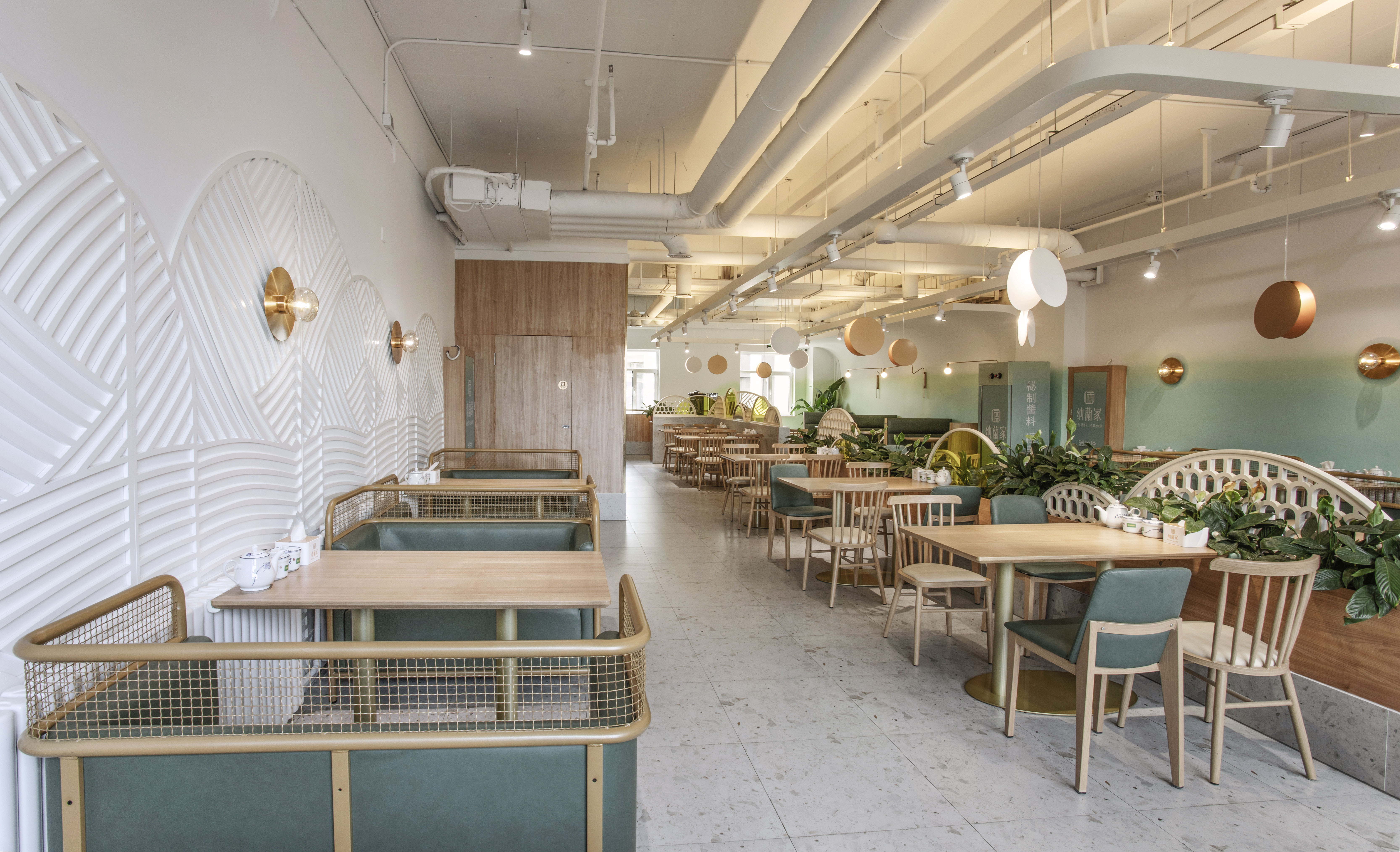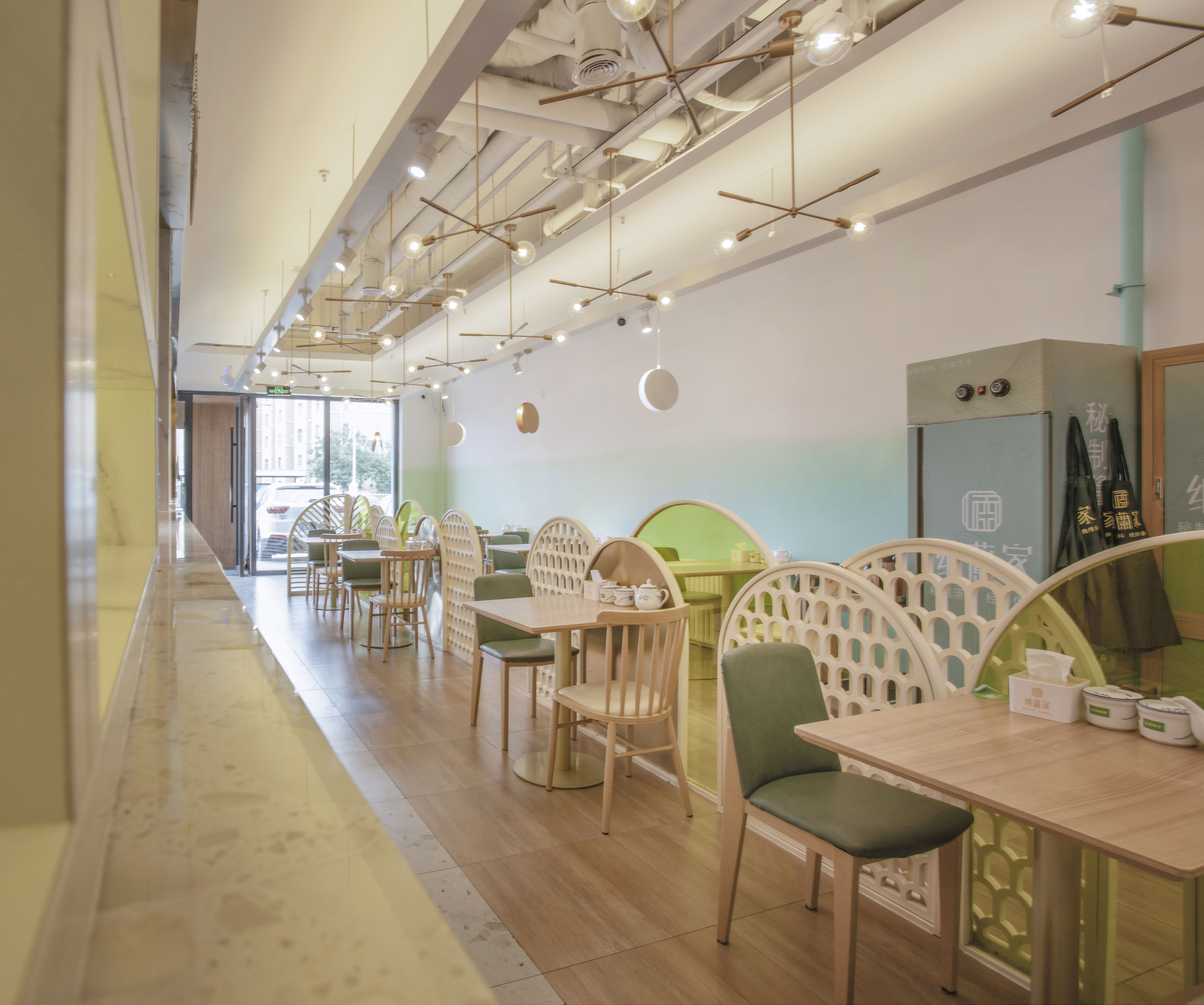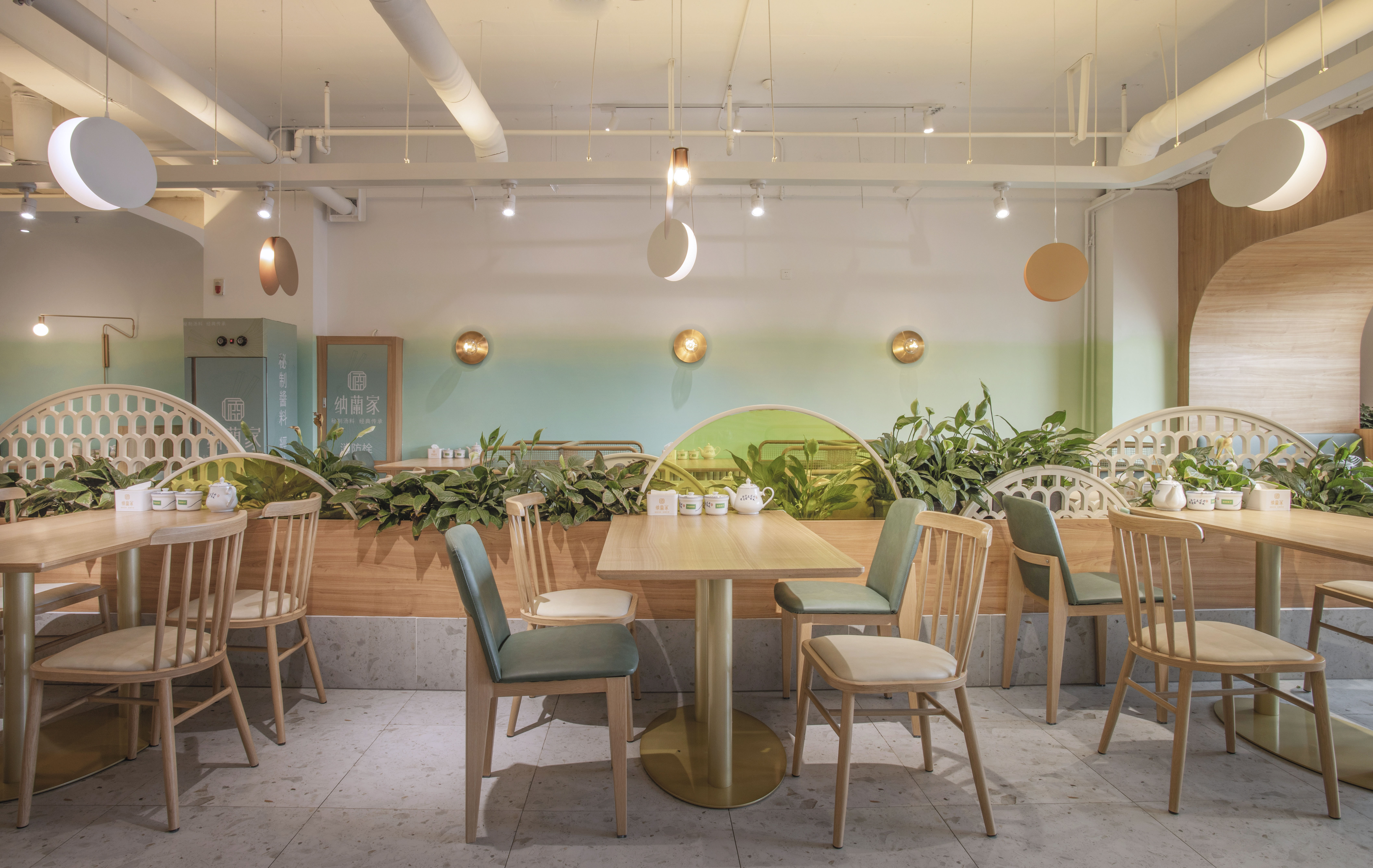 项目定位:此店主营清真美食,推开纳兰家的大门,入眼便是明亮柔和绿与白。象征着绿洲与白月光为主色调,让客人即刻被沙漠绿洲般温柔的氛围包裹。