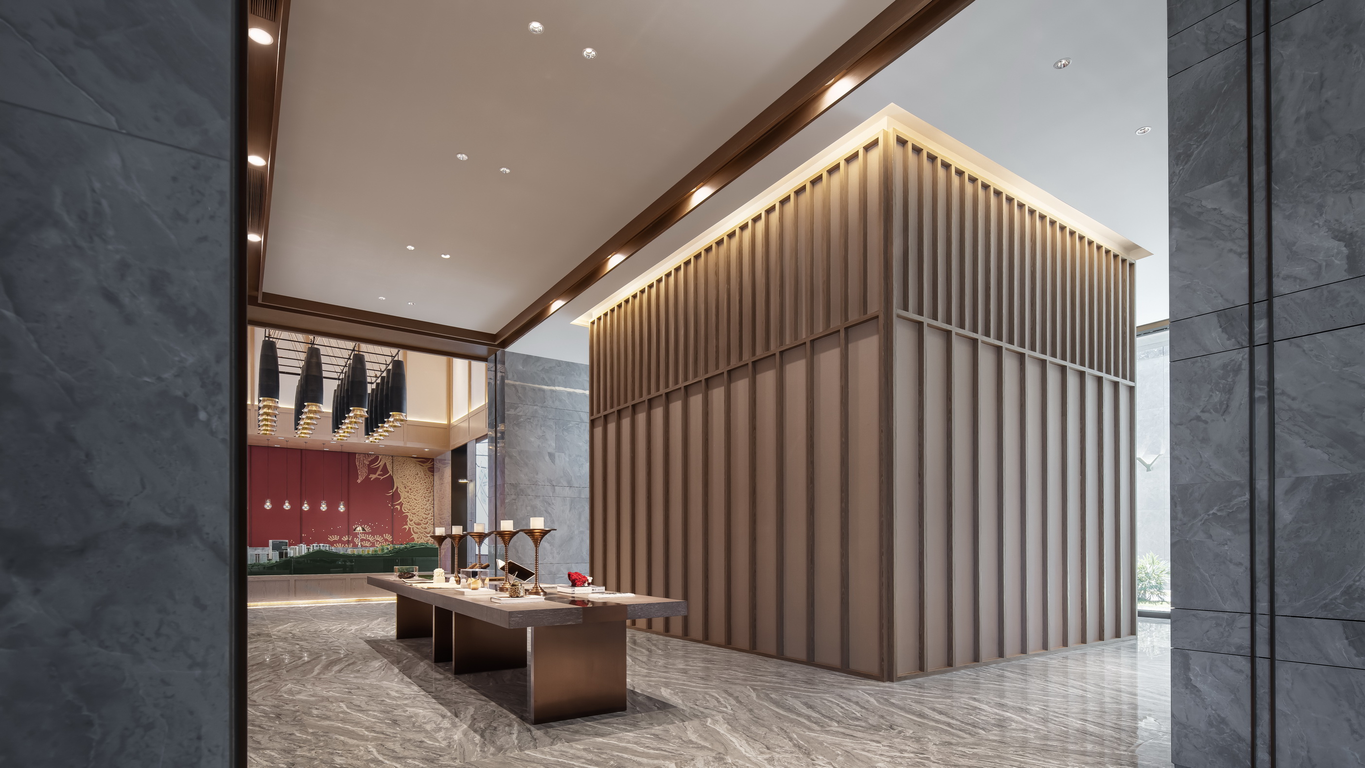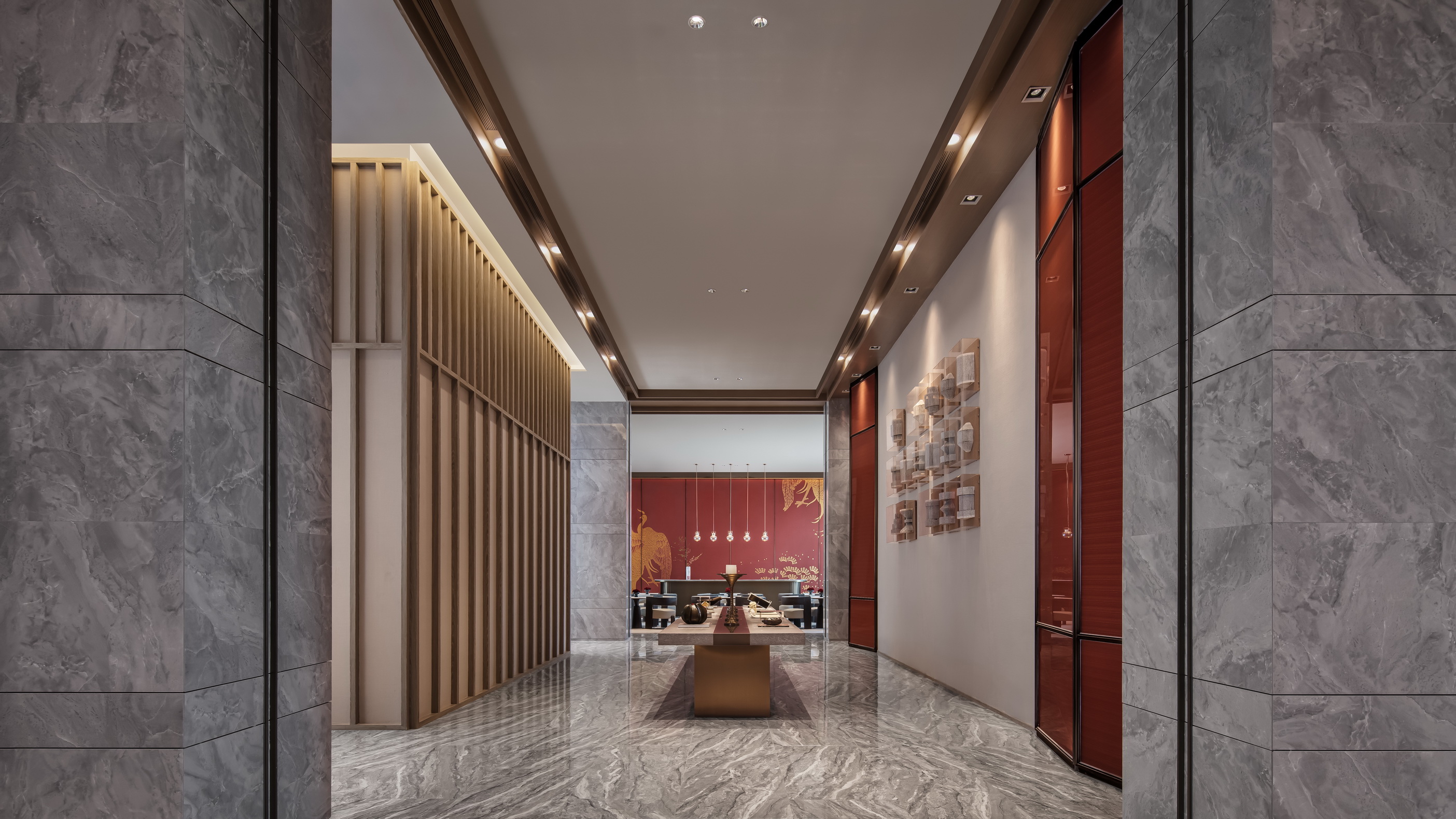 凤鸣朝阳,超逸绝尘 演绎那一抹红的诗情画意 以贵州山脉为元素,以震撼的金属装置画来描绘贵阳的秀丽山川,竹栅隔断将视线引入到大型金属立体装置,层叠的近山远山,极赋代入感,增加空间的丰富性,层次感,增强视觉冲击力。