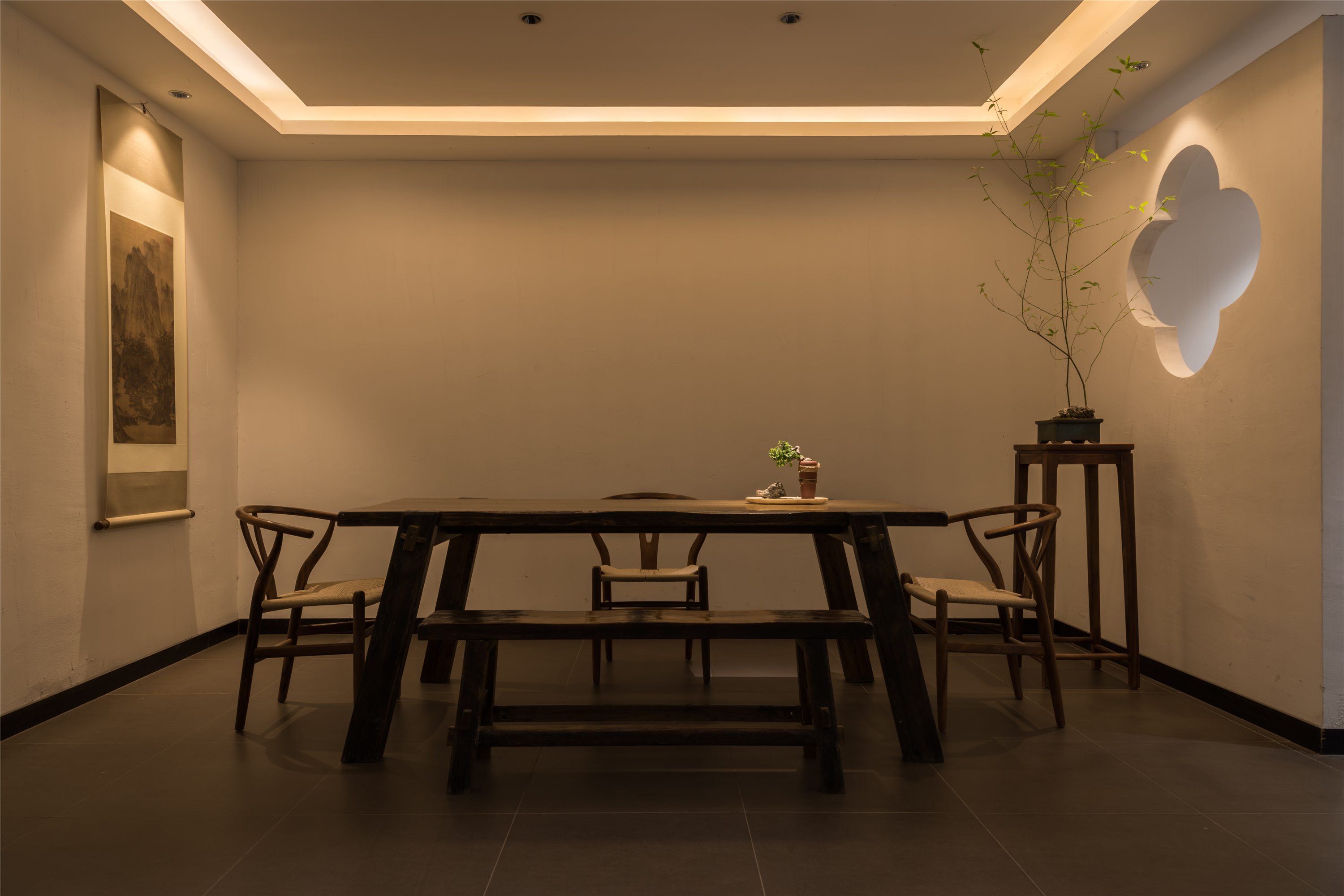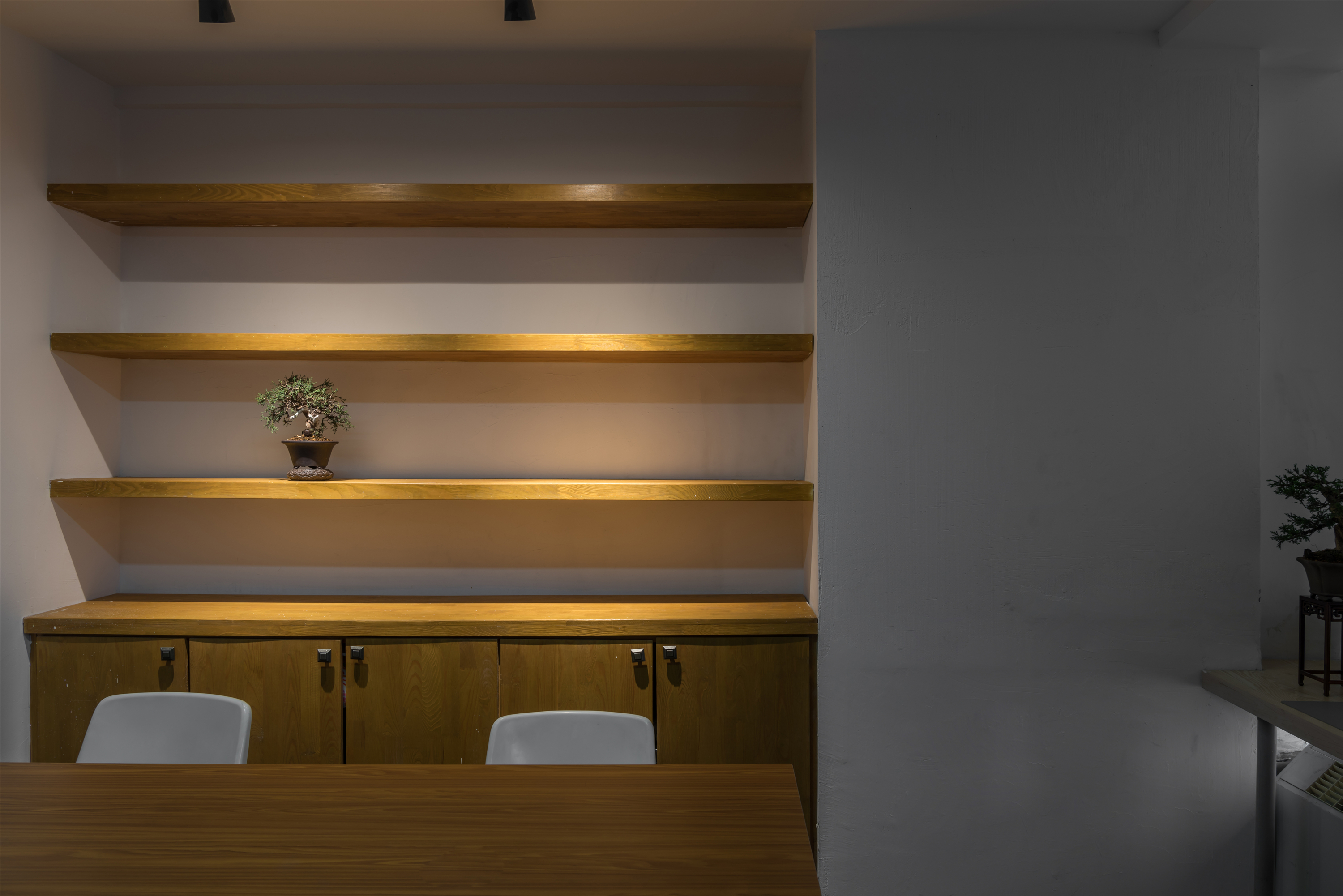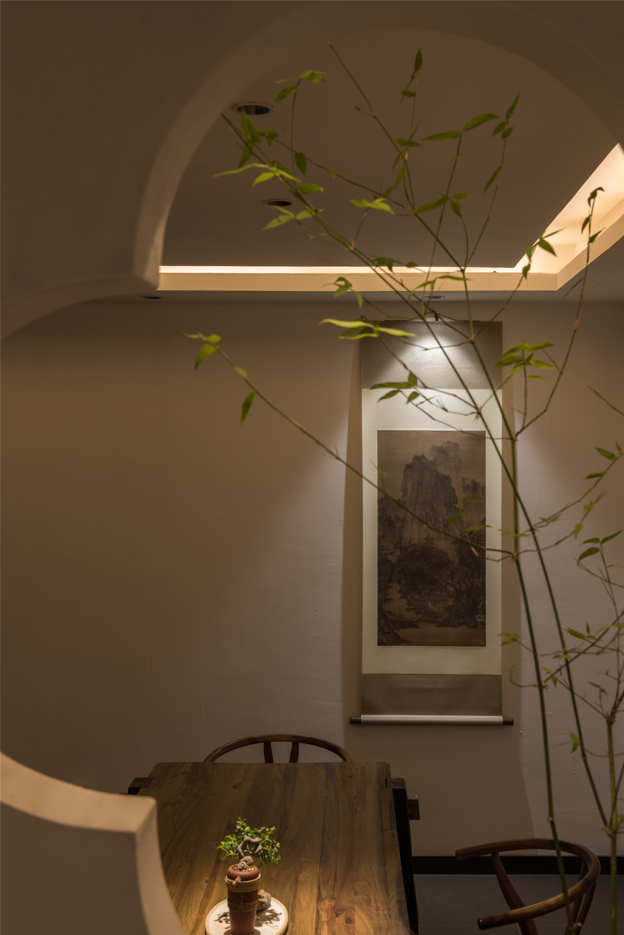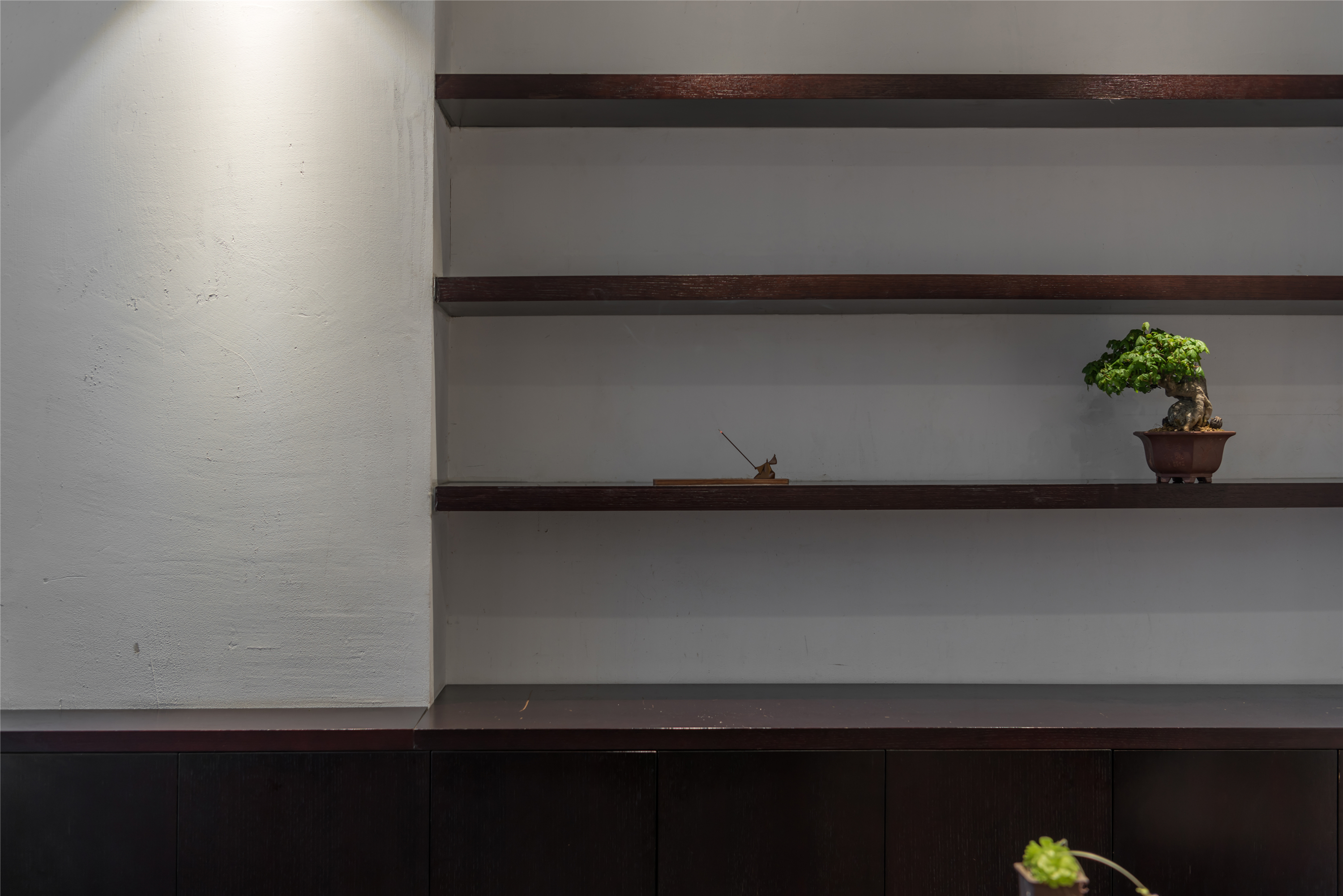设计选材:墙面工人批刮腻子的痕迹留了下来,在表面盖了一层白色的乳胶漆。这样就保留下了一个匠人在刷墙时的心情,一层白纱遮住了他的浮躁。白墙下面两块明代的老石头站在那里互相诉说着他们的经历,他们皮壳也似乎是在告诉我们一些事情。