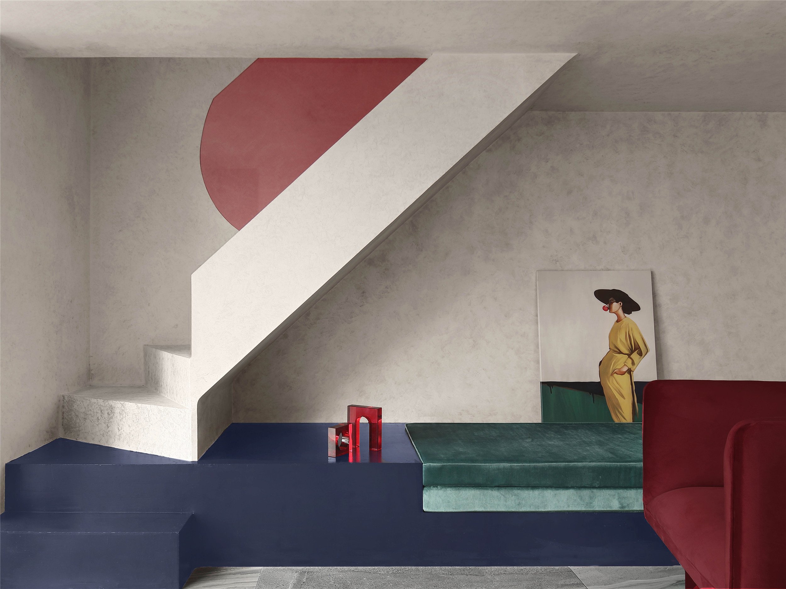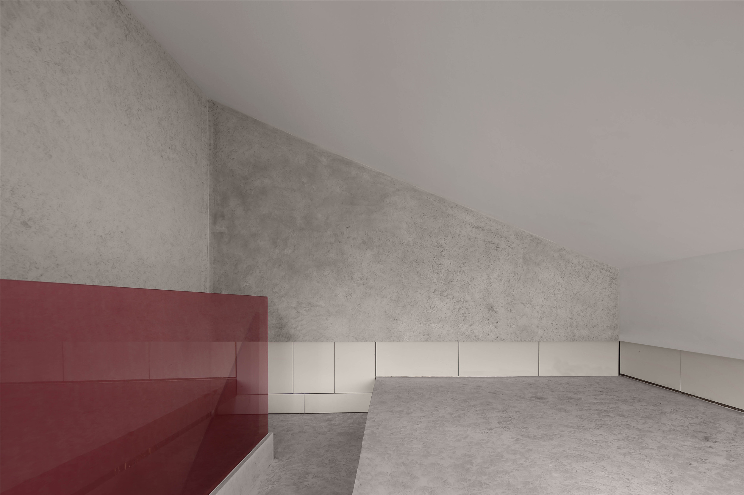 全水泥漆的楼梯搭配红色玻璃扶手,灰色世界中的一抹红。蓝色三角形踏步隐约可见。