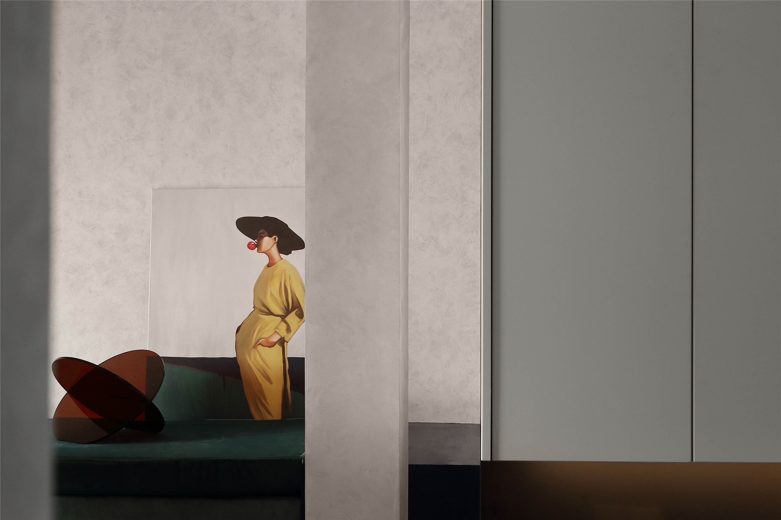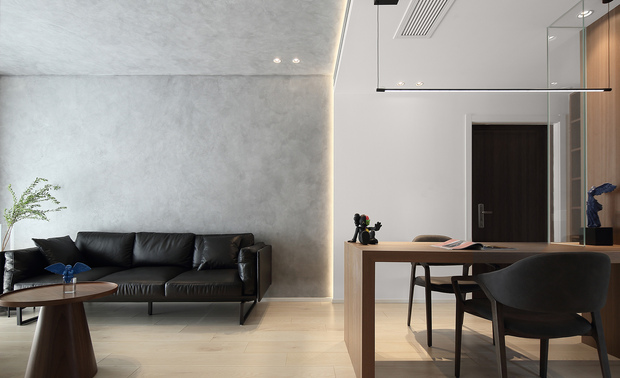 客厅顶面错层楼板,两层楼板悬空中间不连接,各自独立的存在,悬浮的楼板灵动不压抑。下沉楼板下面部分是蓝色固定式的沙发,大面积水泥漆的使用给空间增添了些许中性审美。