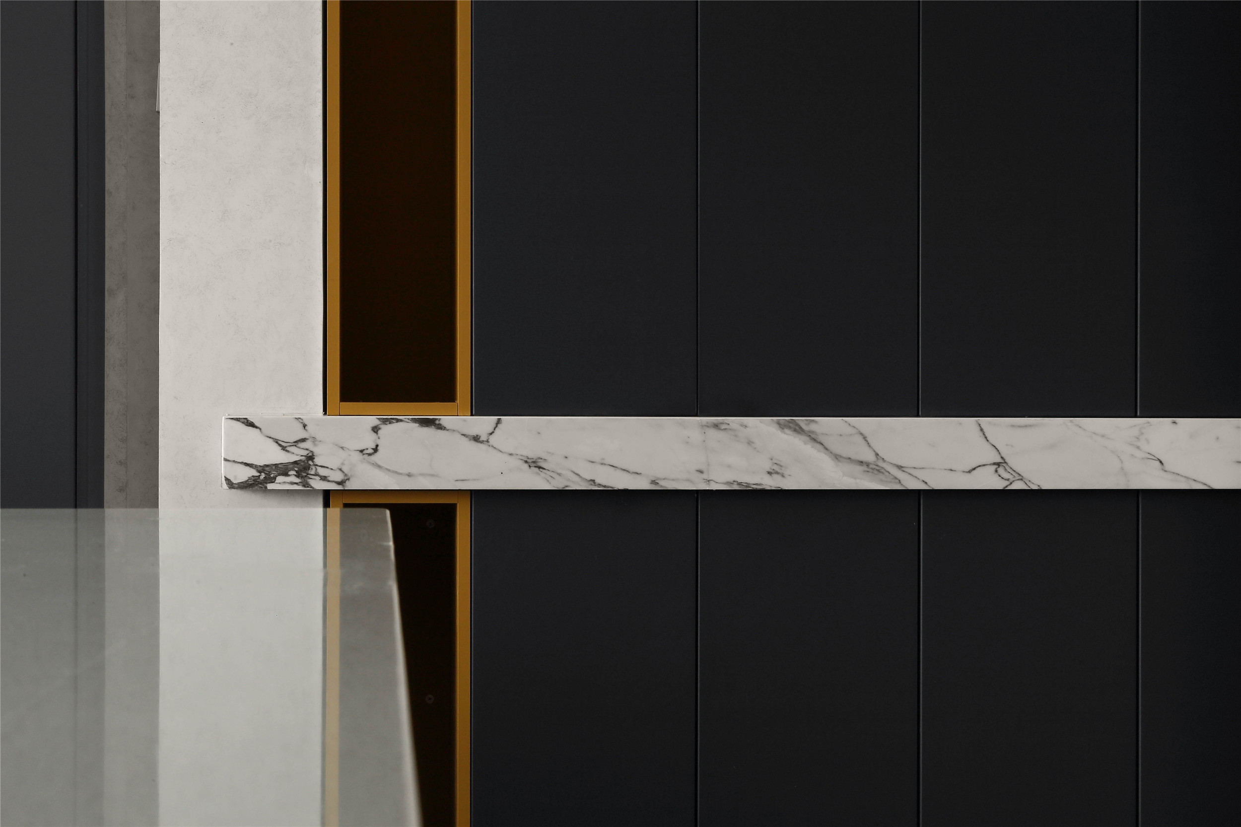 玄关装饰柜,深灰柜门搭配明黄装饰柜,黑白花大理石台面横穿过柜体与餐厅承重墙相接。