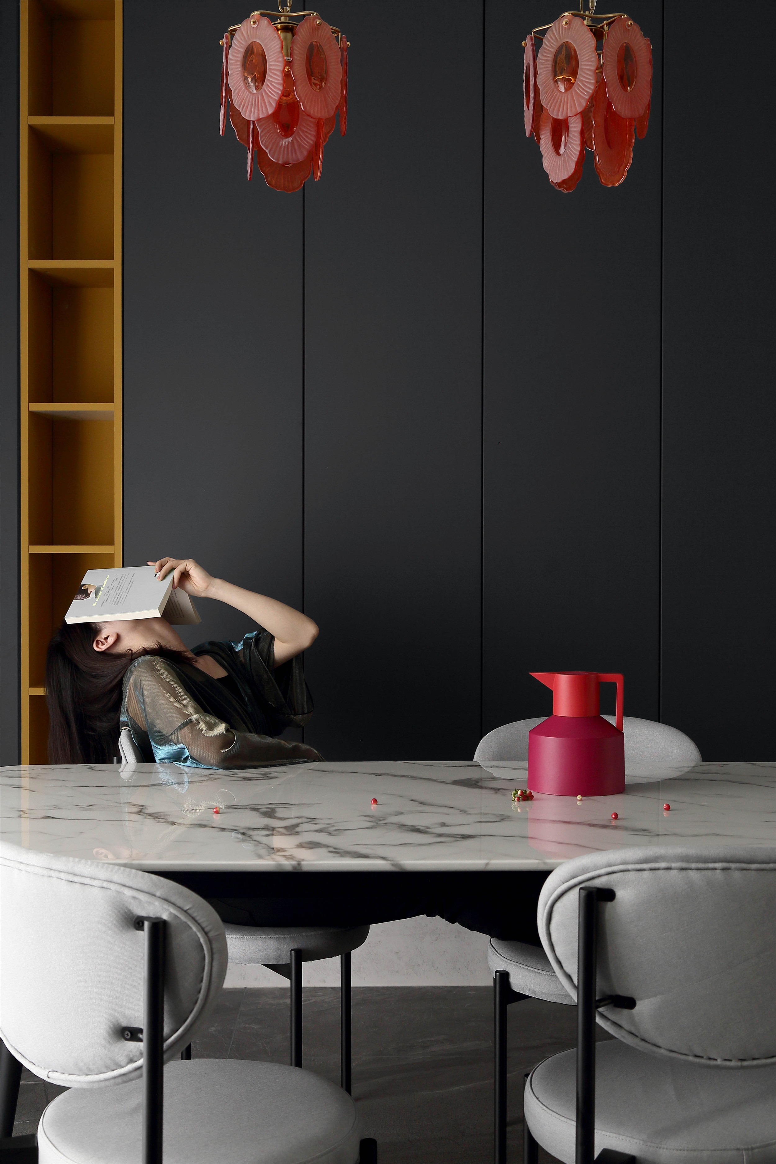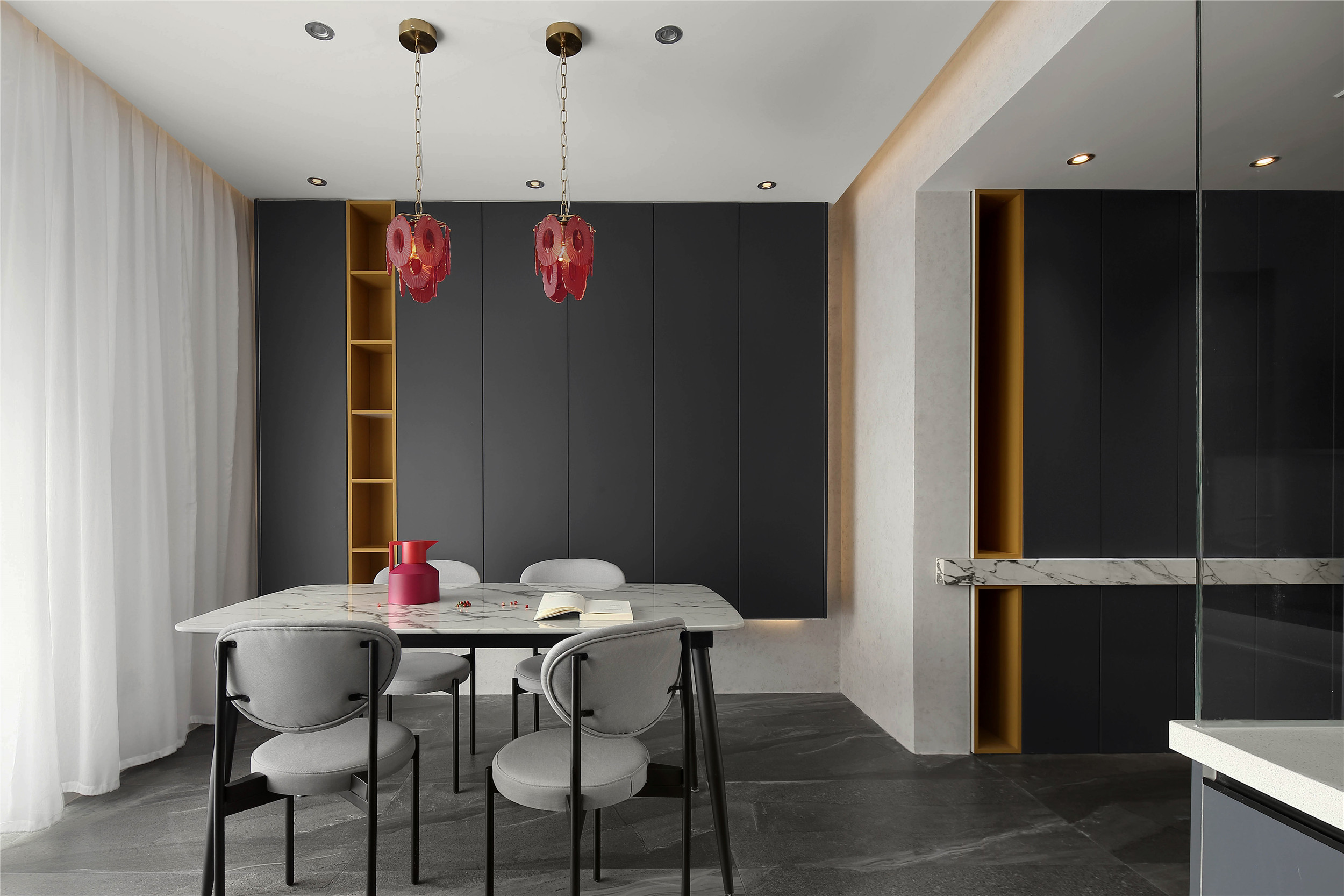 餐厅延续玄关的配色方案,餐厅收纳柜悬空设计,一条暖色光带沿着顶面绕过柜体,形成一个U型光环。两盏红色小水晶灯与客厅的红色呼应。