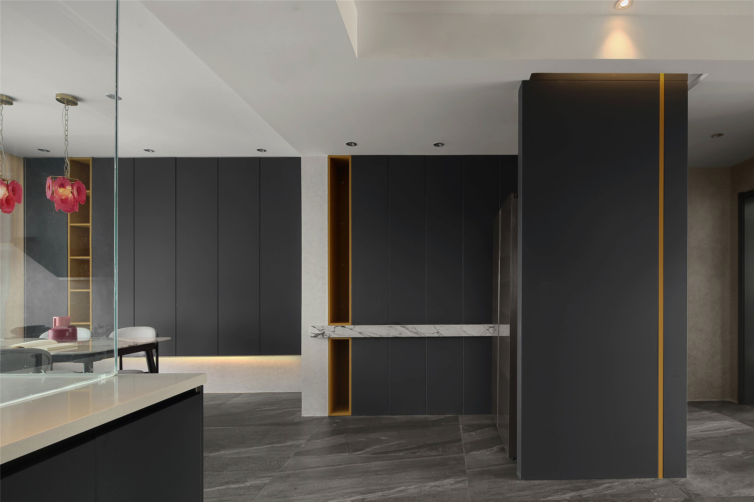 入户玄关,大面积深灰色柜门,搭配黄色装饰柜,黑白花大理石层板横向插入柜体与餐厅承重墙相接。右侧护墙板墙体背后藏着双开门大冰箱,灰色的墙面一抹亮黄色线条打破沉闷。