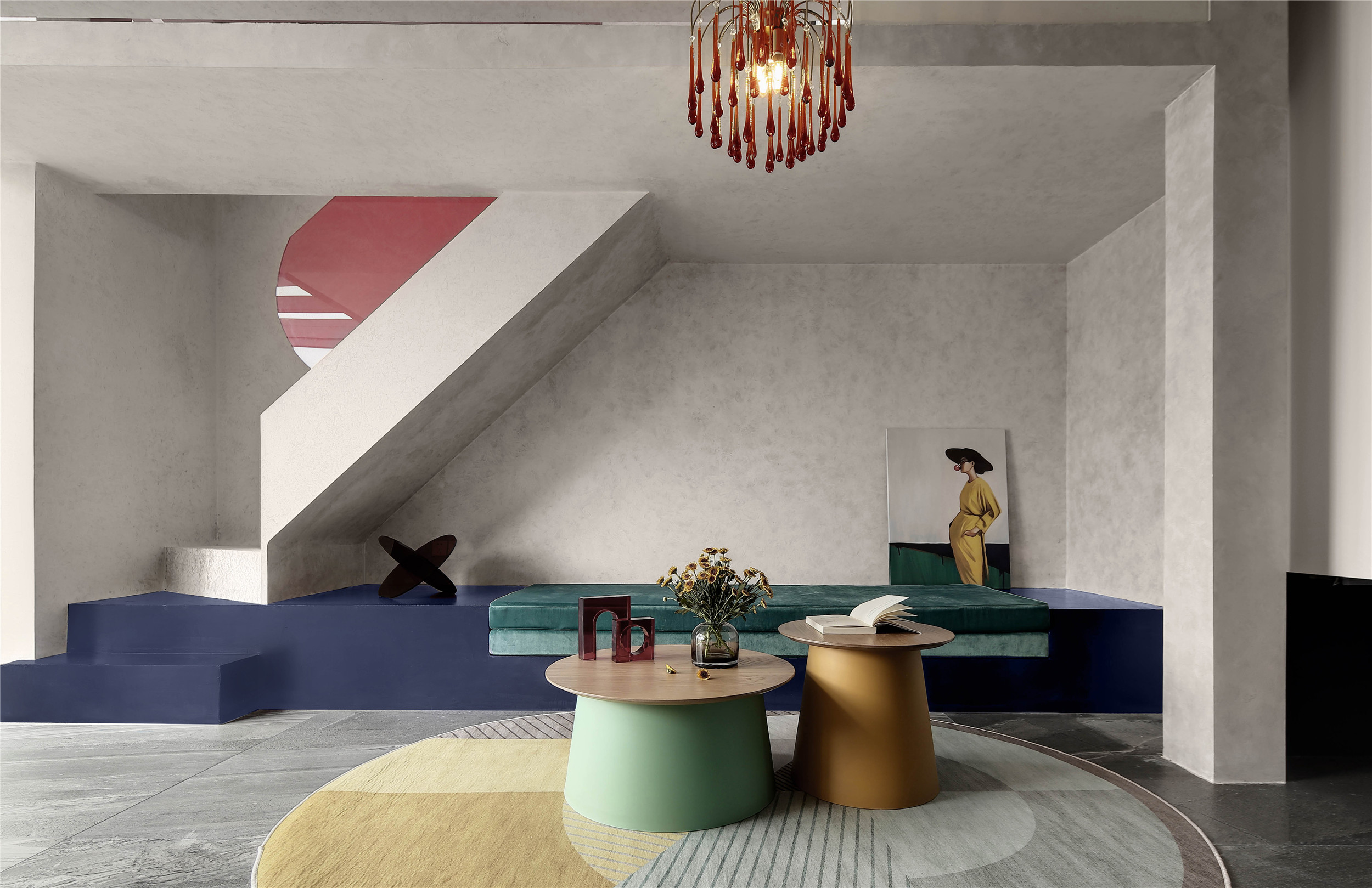 蓝色踏步延申至客厅作为沙发骨架,嵌入蓝绿色绒布软垫,高定款沙发落座。