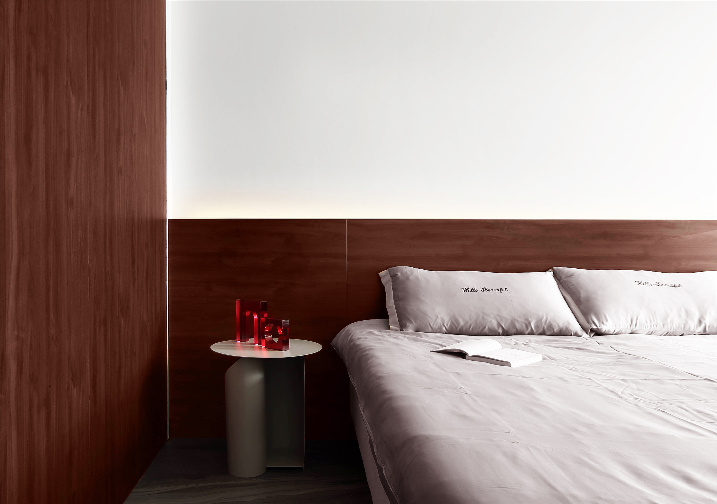 主卧室棕红色作为客厅红色的延续,棕红色木纹护墙板上方藏灯,起夜不用担心顶光源眩光影响另一半。衣柜柜门材质与床头统一。