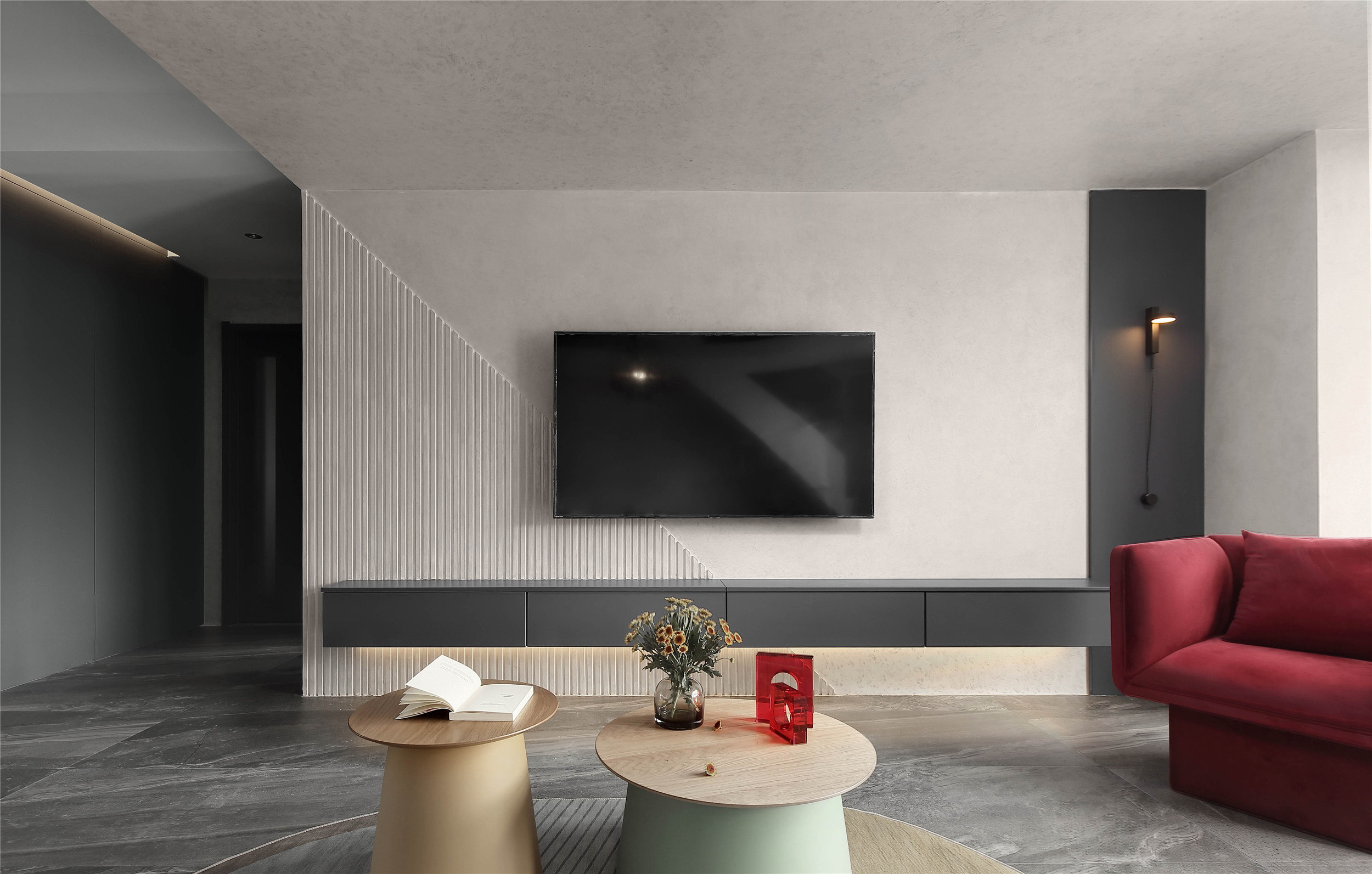 深灰色护墙板与悬空电视柜纵横交错,斜面线条造型斜插入电视柜,斜面的出现打破电视墙的严肃氛围,增添了些许趣味性。墙面背景墙壁灯与电视柜下的藏灯,灯光层次更加丰富。