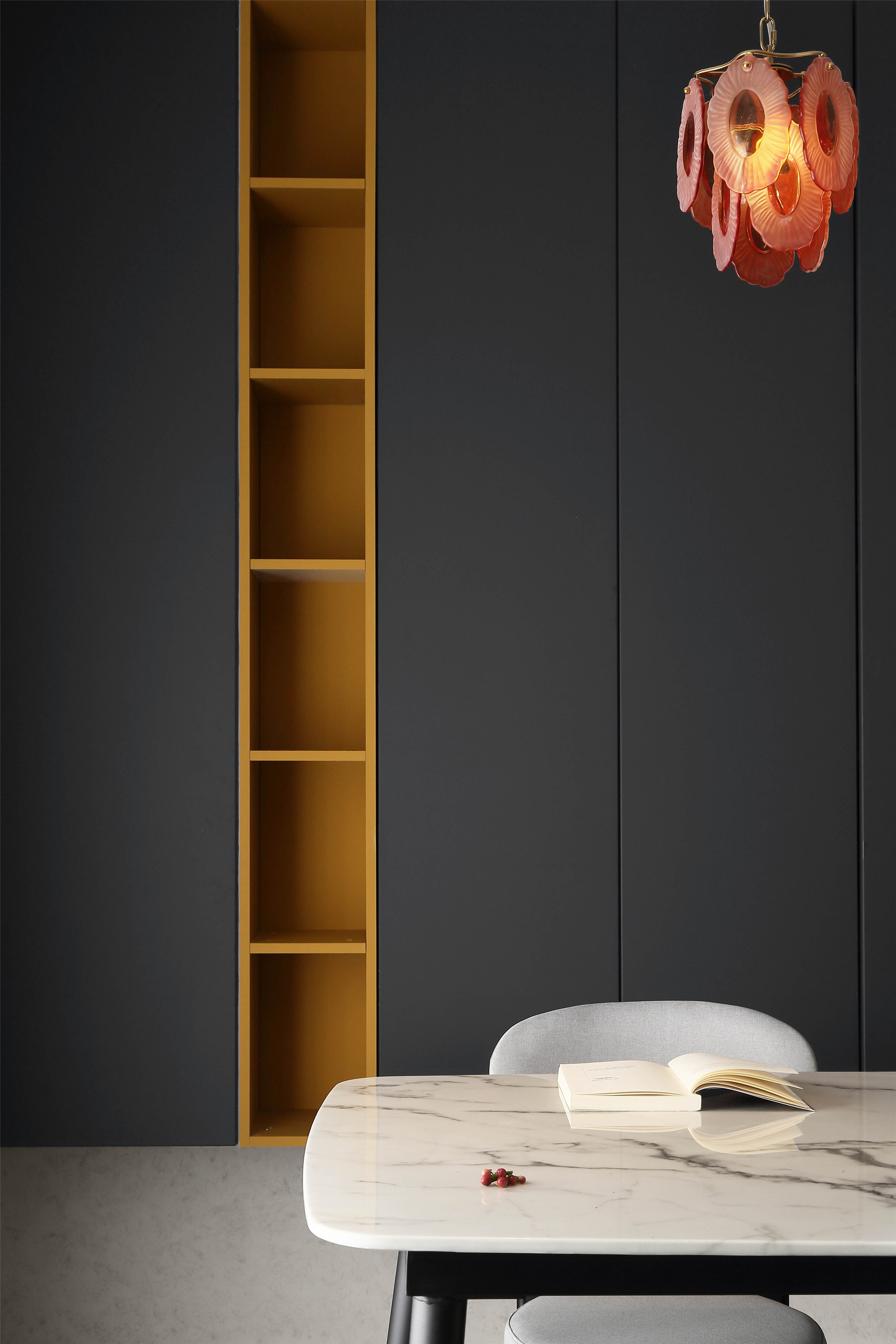 餐厅收纳柜局部,深灰与明黄。