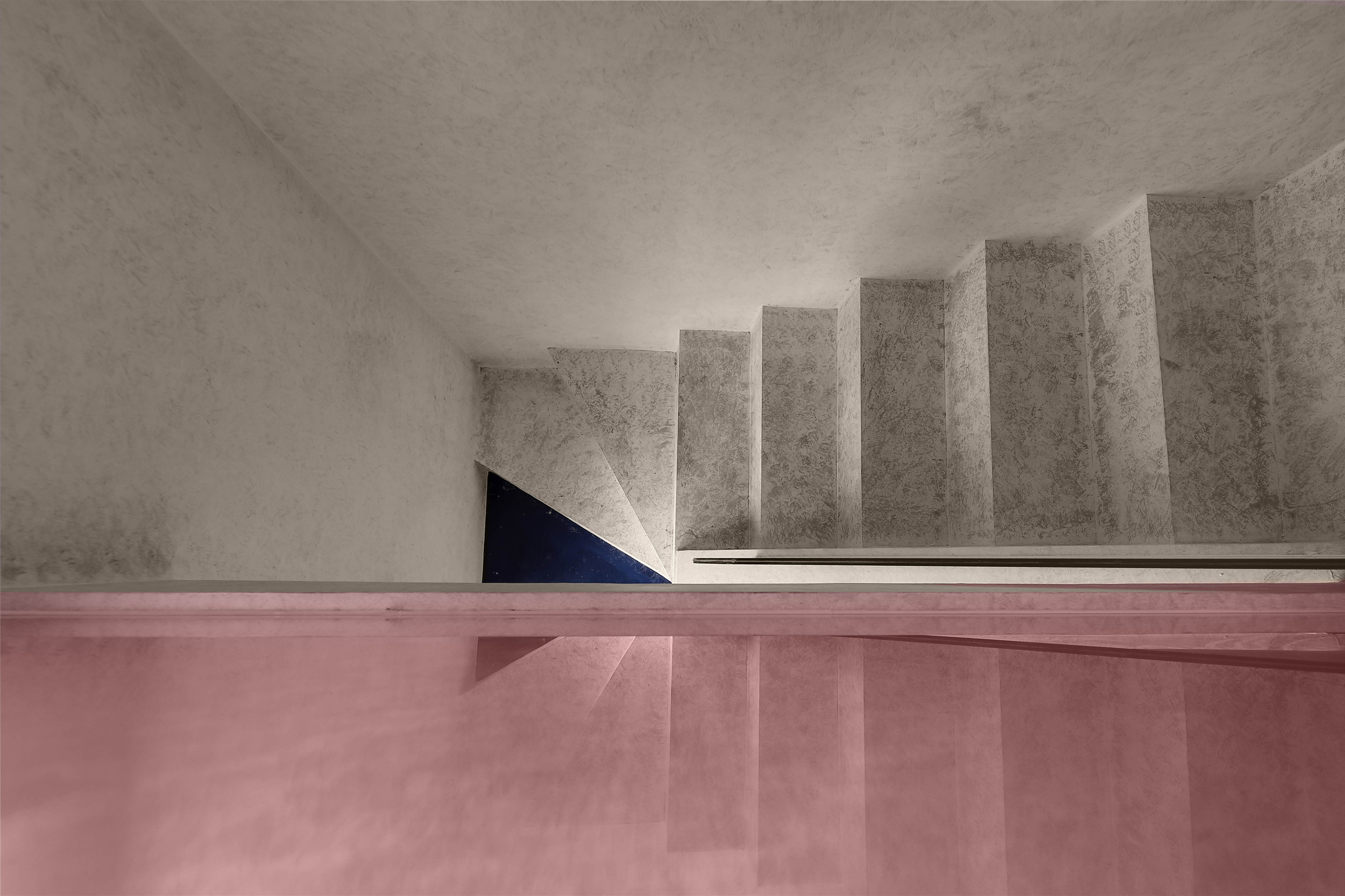 全水泥漆的楼梯搭配红色玻璃扶手,灰色世界中的一抹红。蓝色三角形踏步隐约可见。