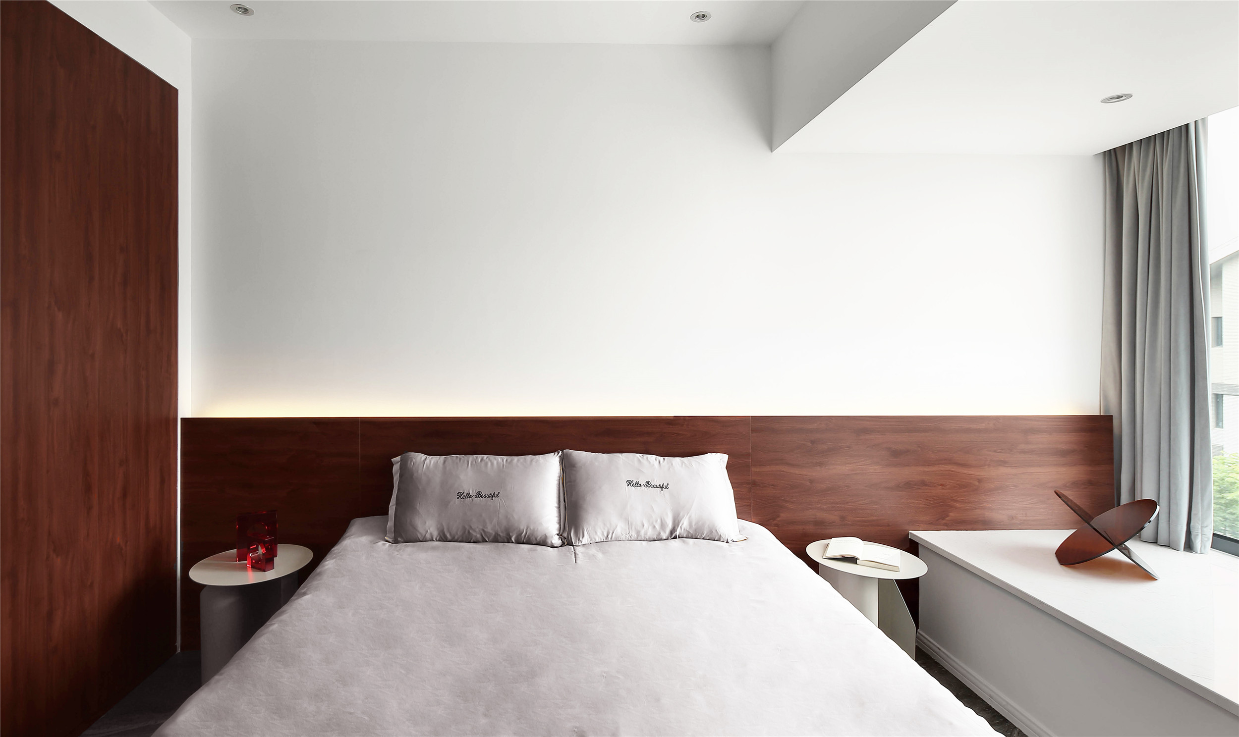主卧室棕红色作为客厅红色的延续,棕红色木纹护墙板上方藏灯,起夜不用担心顶光源眩光影响另一半。衣柜柜门材质与床头统一。