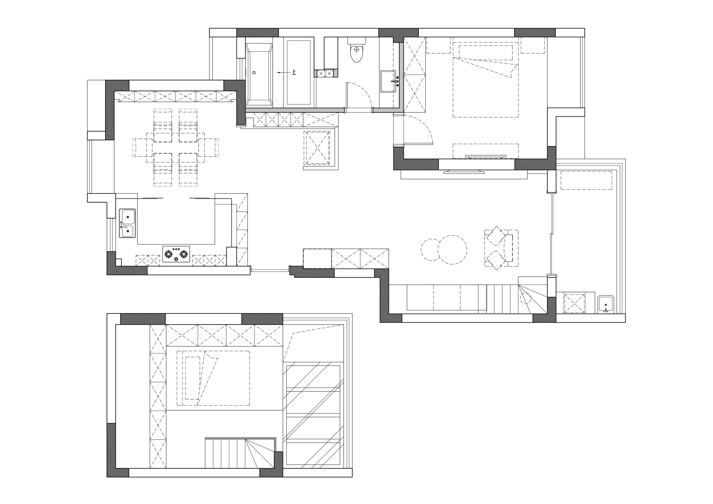 改造后的方案放弃了一间卧室,打开厨房与次卧室,餐厨一体,厨房向着餐厅方向开门,保证厨房开间的同时也增加了厨房台面长度,原厨房门的位置改成背对背地柜面向玄关的部分是鞋柜,面向厨房的部分是橱柜,厨房没有采用传统墙体加移门的形式,而是全玻璃的通透设计,进门视线无遮挡,小户型也可以有大平层的视野。 进门右侧设计了一组组合衣帽柜,结构的堆叠设计,集换鞋凳,鞋柜与衣帽柜一体,功能与美观齐聚。 卫生间在原有面积上扩建至衣帽间处,拆掉了衣帽间与卫生间之间遮挡光线的墙体,让卫生间拥有自然采光的同时也拥有一个浴缸淋浴结合一体的豪华洗浴空间。 次卧墙体有一段承重结构无法拆除,在这个墙体的基础上利用卫生间背面的墙体设计以一组玄关收纳柜,收纳柜旁边的护墙板造型隔墙完美的遮挡冰箱的侧面。 主卧室增加了一组衣柜,保留了外墙的斜面结构。 我们设计楼下放弃了一间卧室,只保留一间主卧室,偶尔有访客的话,就没有多余卧室可用。 我们利用客厅的斜顶层高偷出一个客房来,二层整体现浇的话,如果保证一层层高的话,二层层高不够,人无法正常通行,如果保证二层层高,一层客厅层高就会压低,相对压抑。 我们灵机一动,做了一个错层楼板的设计,两层楼板悬空中间不连接,各自独立的存在,悬浮的楼板灵动不压抑。沿着楼梯上到二层的楼板是下沉的,保证人可以轻松通过,楼板下面是客厅的沙发区域,人在沙发区域的活动的人基本上都是坐着,很难感受到层高不足带来的压抑感,客厅活动频繁的区域是楼上楼板抬高的部分,缓解了沙发区域层高不足的压迫感,二层利用这个30公分高差,刚好形成了一个榻榻米床,抬高的榻榻米既保证了楼下层高,又拥有了一张床,只需要配个床垫就是一间完美的客房啦。 二层四周的坡面打了一些抽屉柜体,空调内机也藏在抽屉柜上方的墙里面,谁说空调一定要装在顶上呢,在没有客人的大部分时间,二层可以作为储藏间来使用。