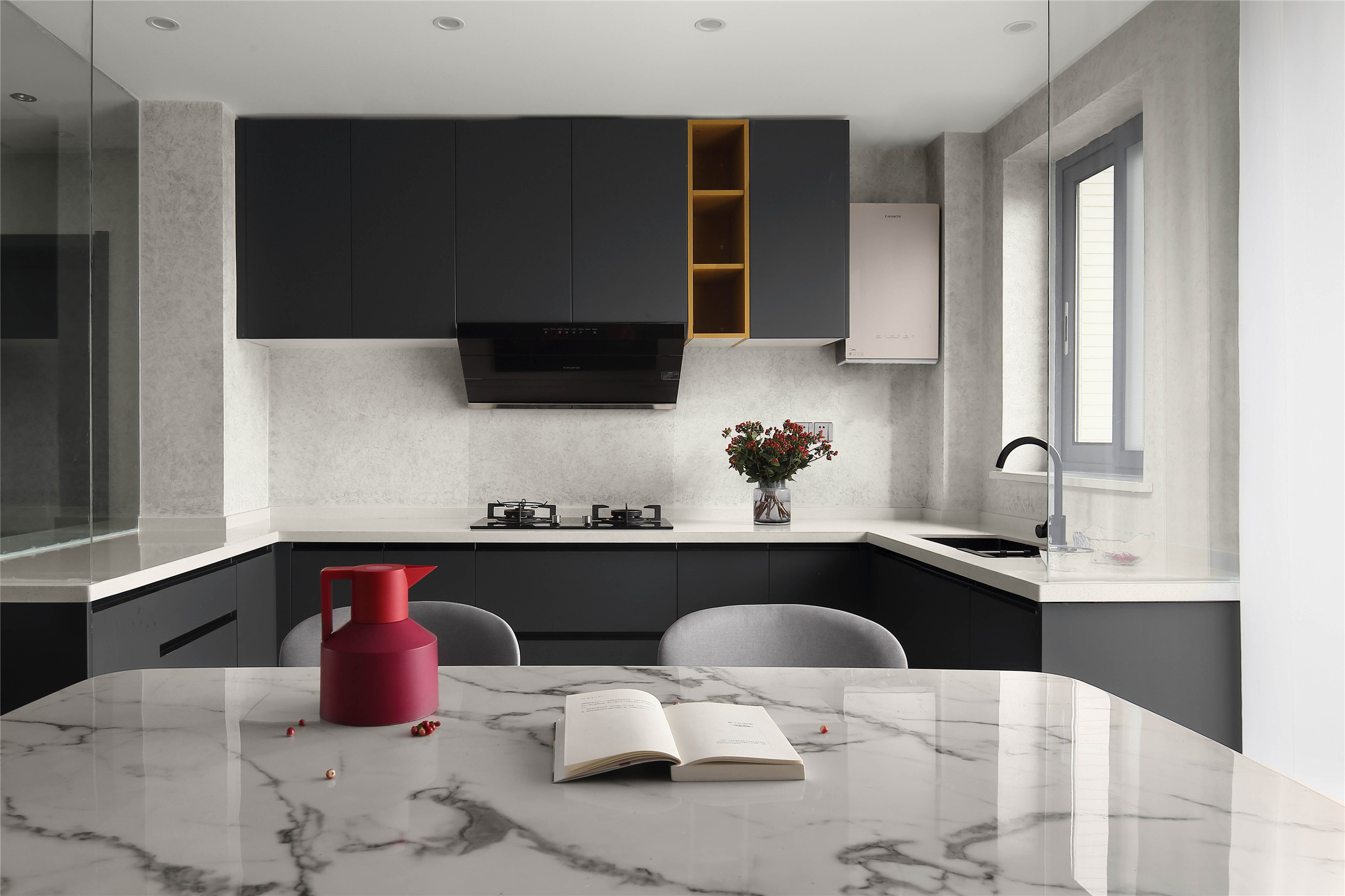 改变开门方向的厨房,拥有U型橱柜,充足的操作台面。墙面用灰色的水泥漆代替了瓷砖,色彩延续玄关的深灰色与明黄搭配,全明的厨房,视野通透采光充足。