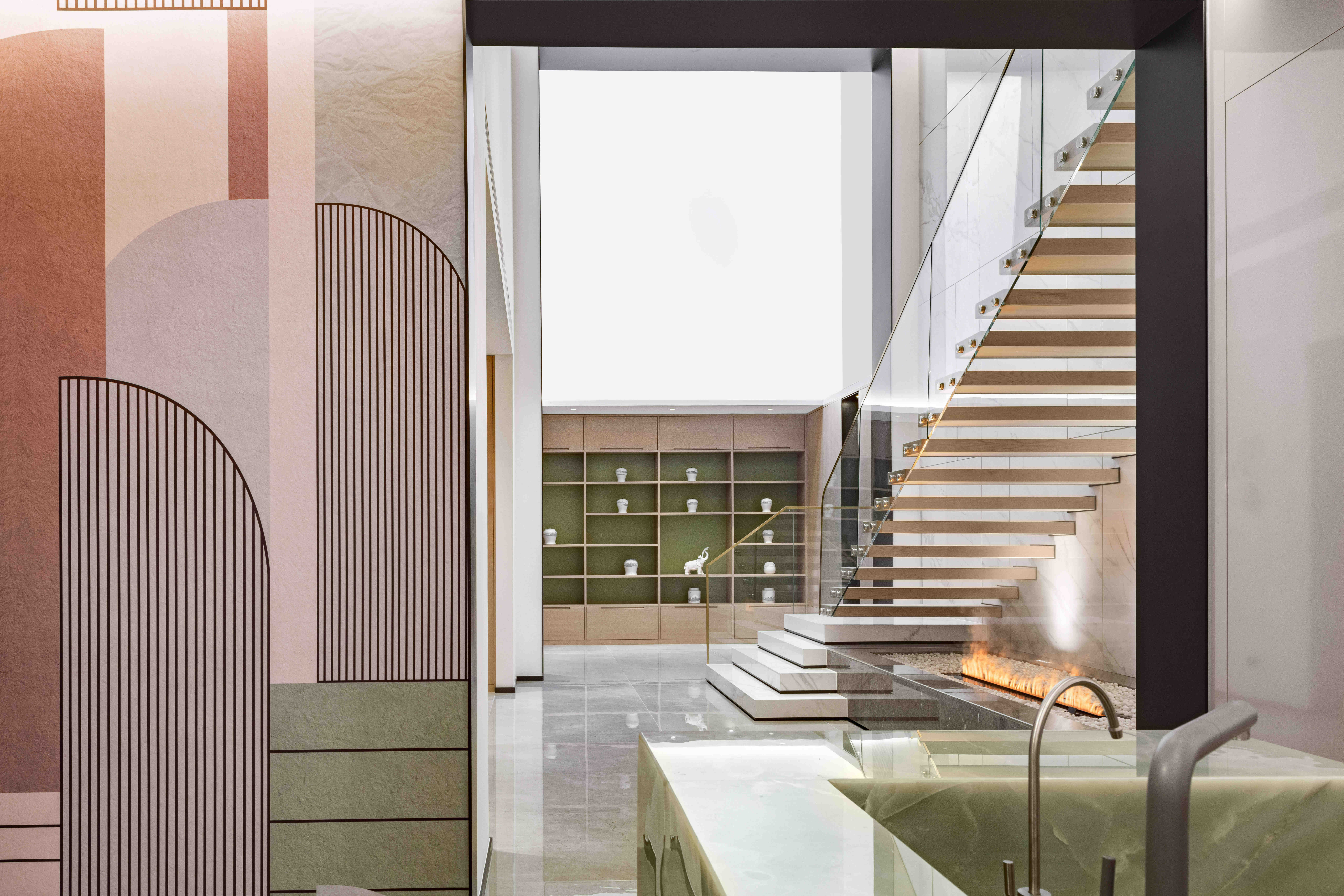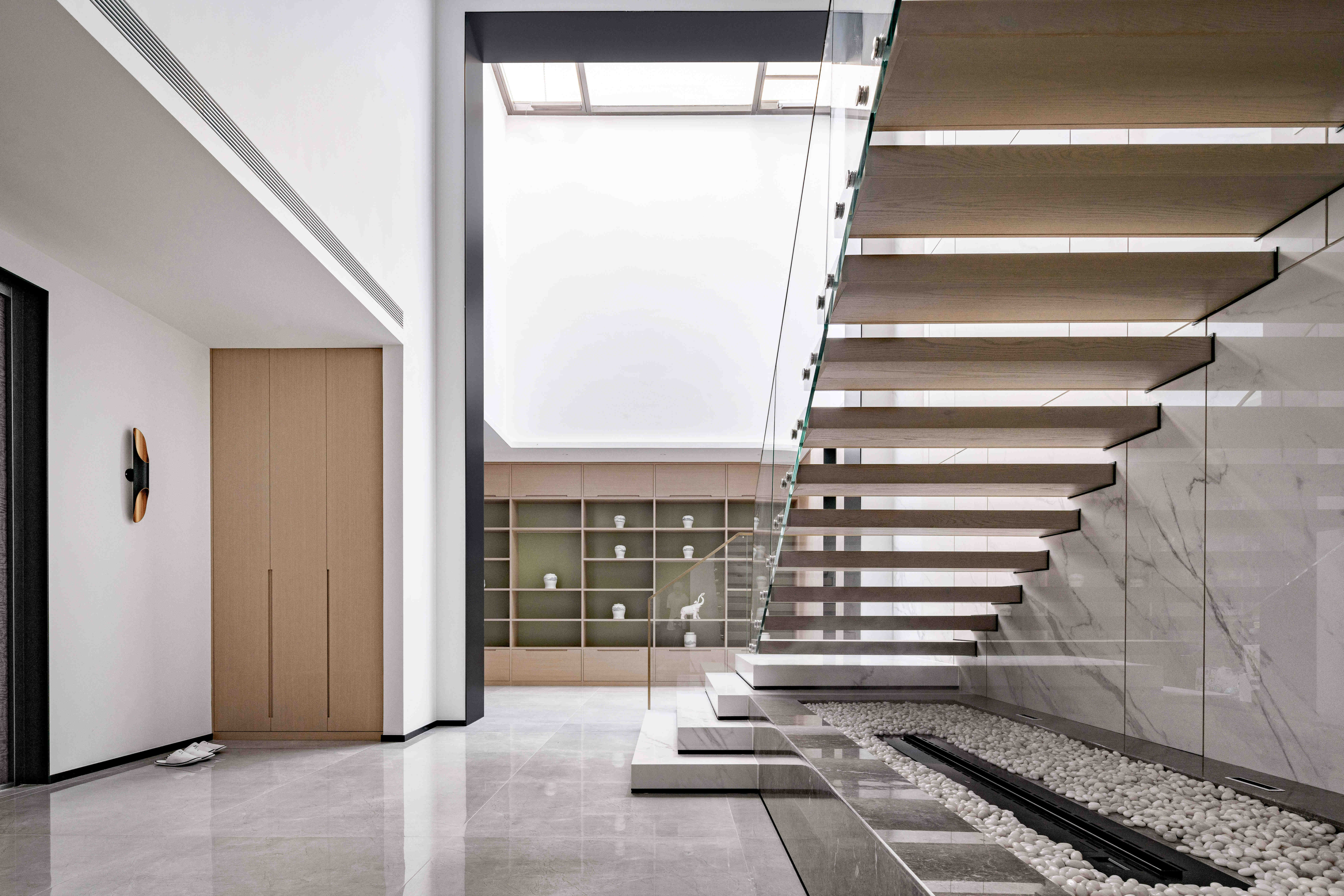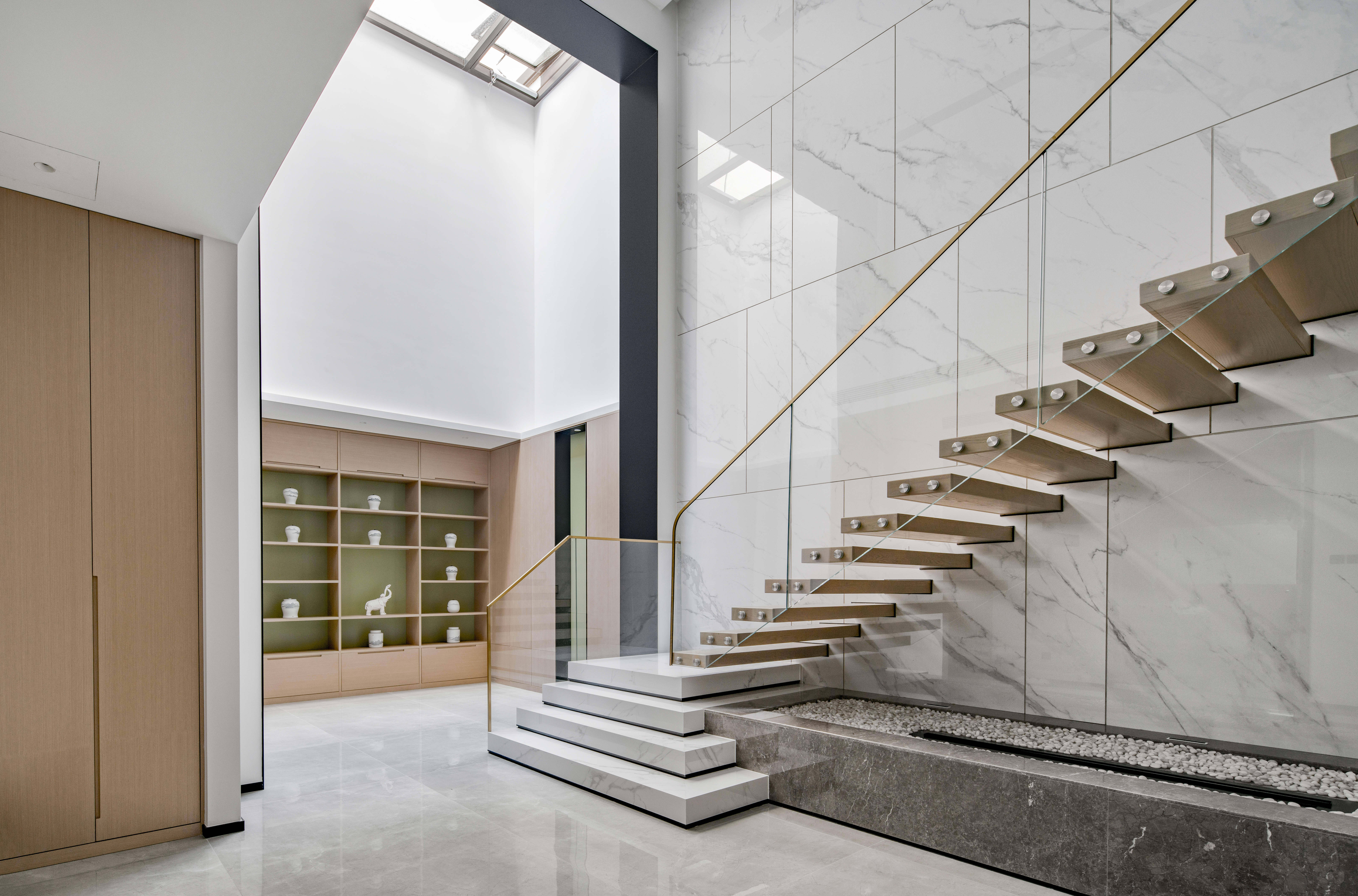 东方极简美学 这栋上下5层、近750㎡的私宅,结构宏伟,内部线条明朗,色彩透露出亲和友善。凝视墙面的大理石纹理、松树的角度、台阶的高度,感受设计师用造物的精神去打造一个空间。将六口人的舒适宜居建立在高度的秩序感中,这种精心的编排设计,为居住集体创造出一种自由感和空间尺度,美从细节中浮现出来,剩下的只需要适度的装饰即可。