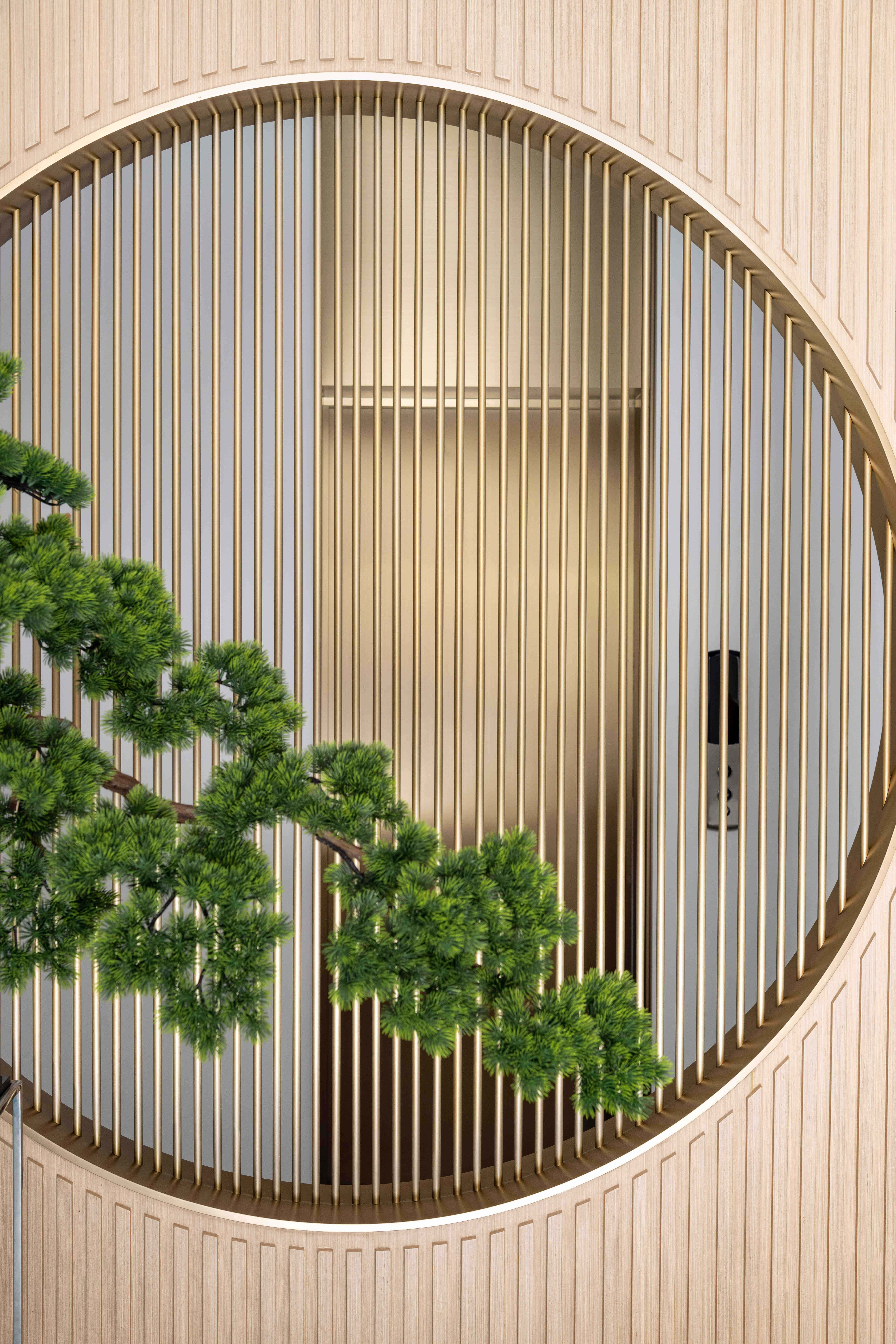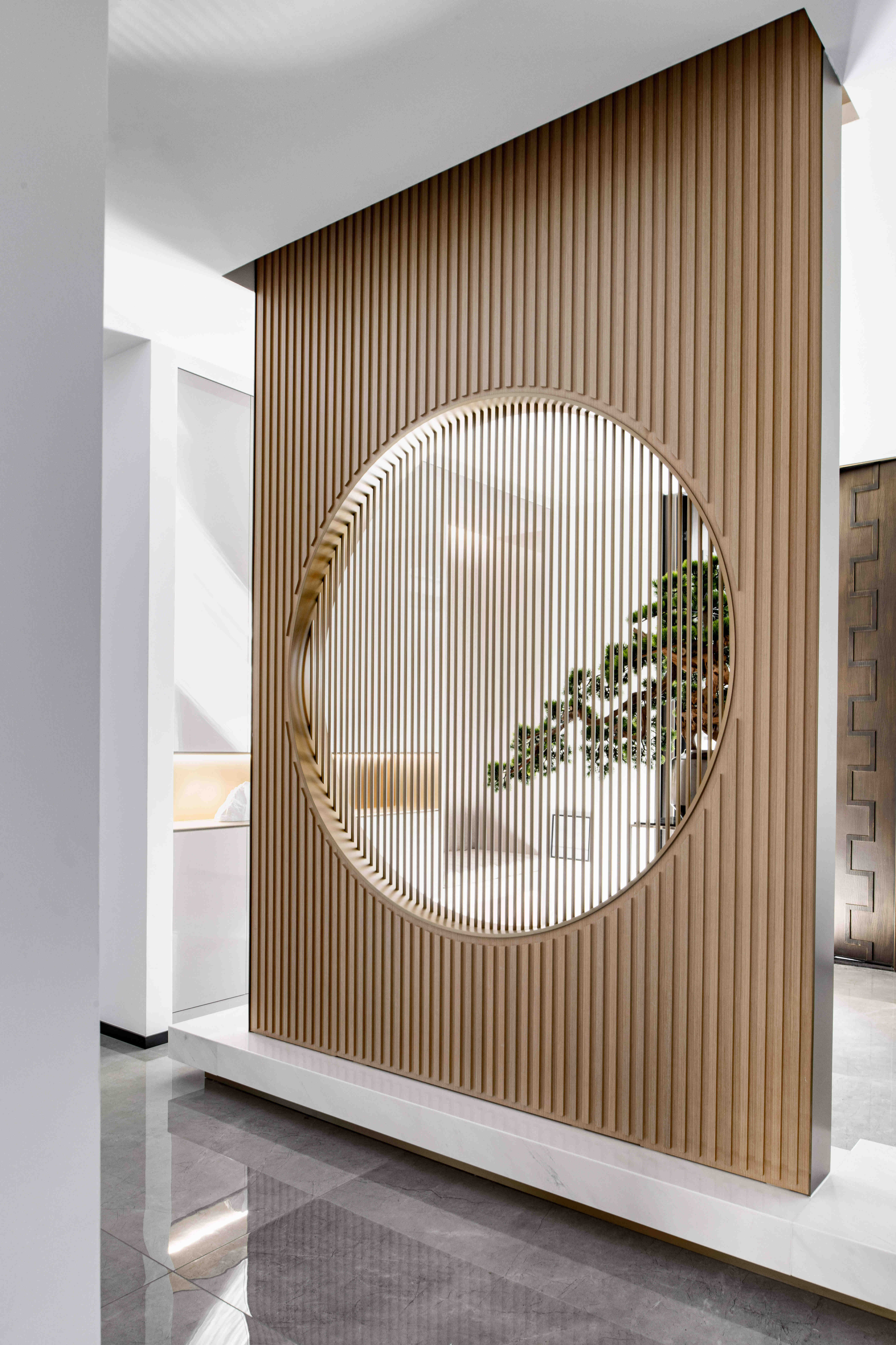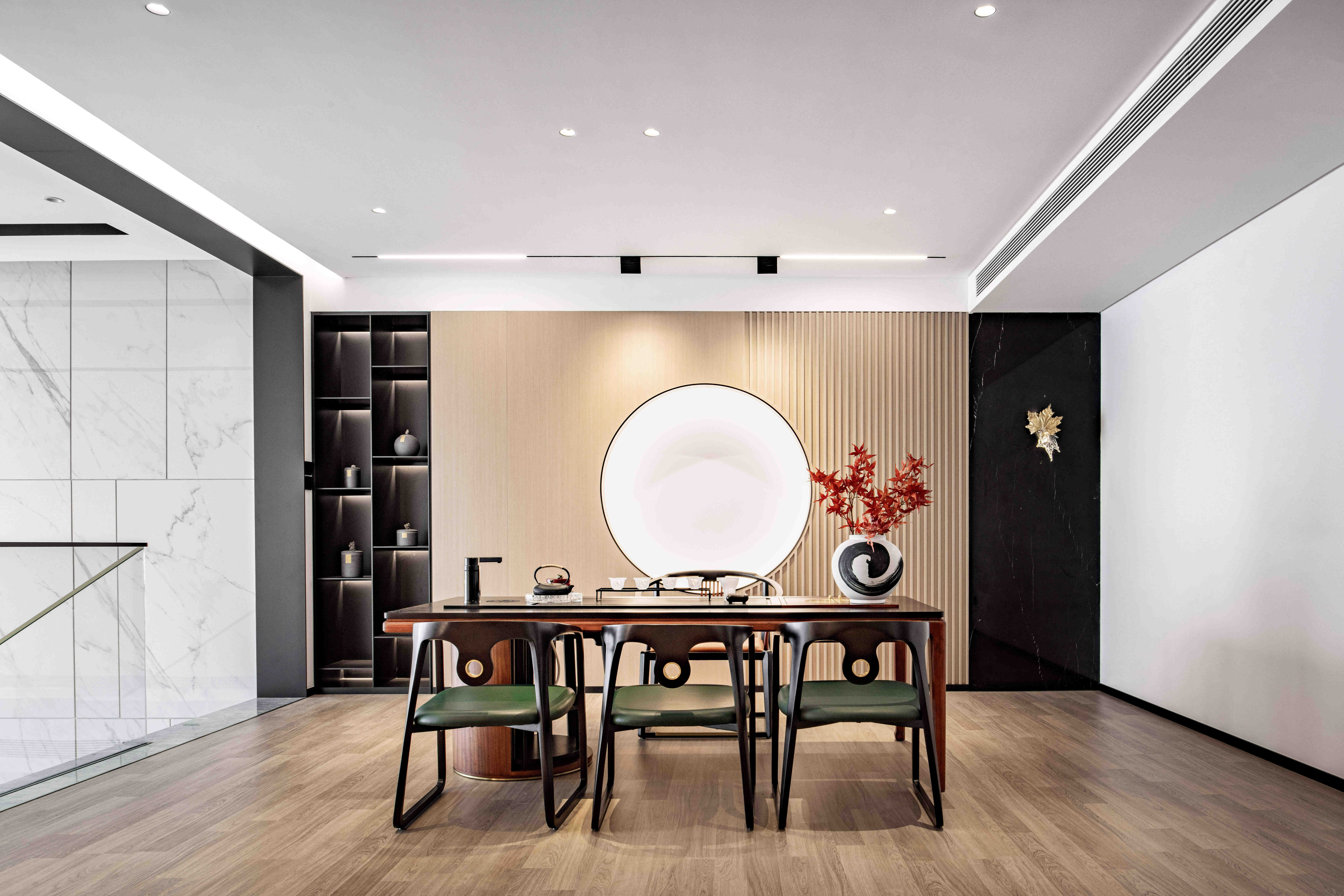 茶室的木质背景墙与黑色石材结合,条纹造型增强空间的纵深感。天圆地方,透过圆窗,诗意情境,灯光照射仿佛看到大自然流转。一席茶桌,一把明式圈椅,玻璃茶盏,红润的茶汤让人回归内心的静谧,达到淡泊致远的人生境界。