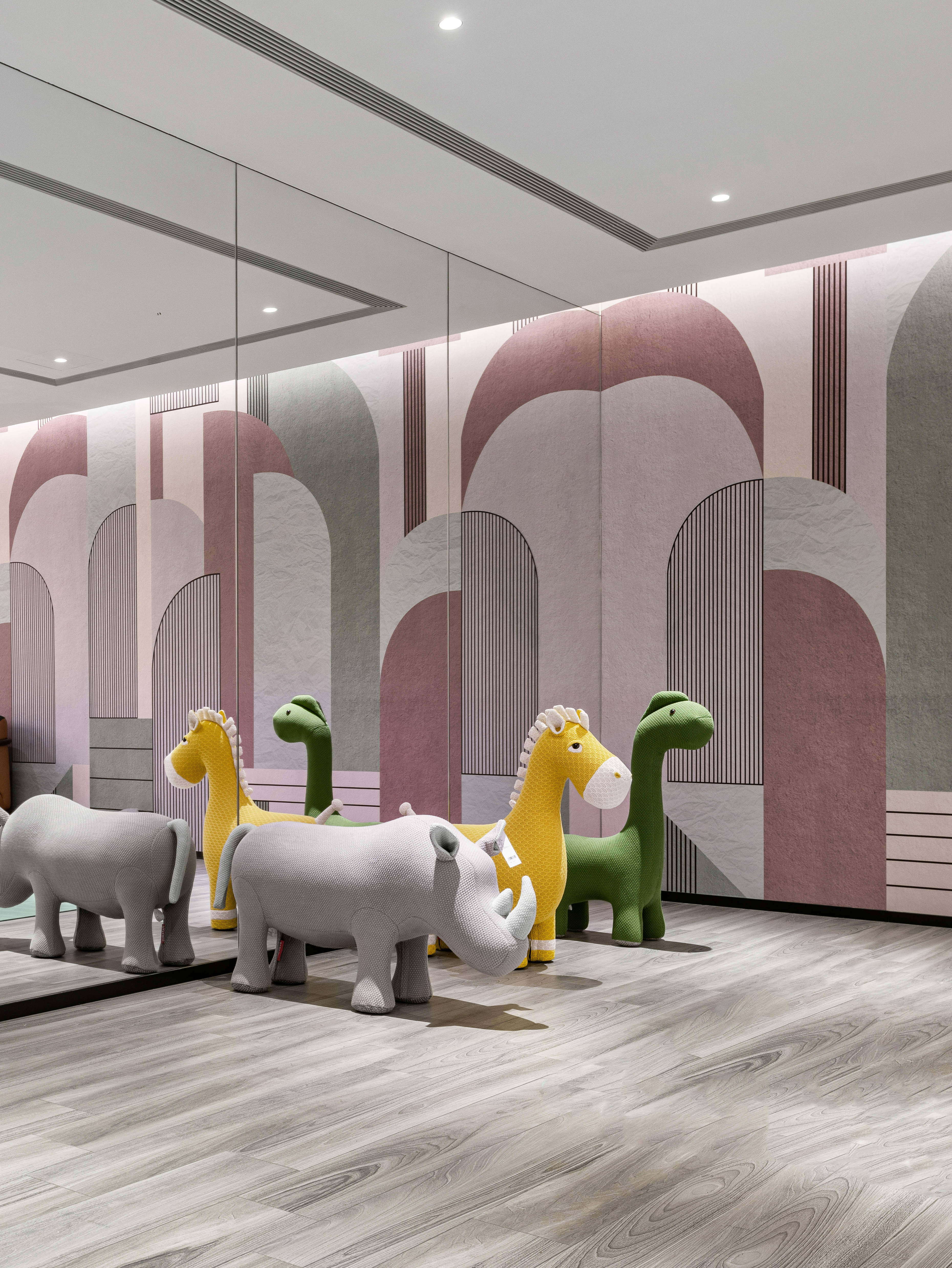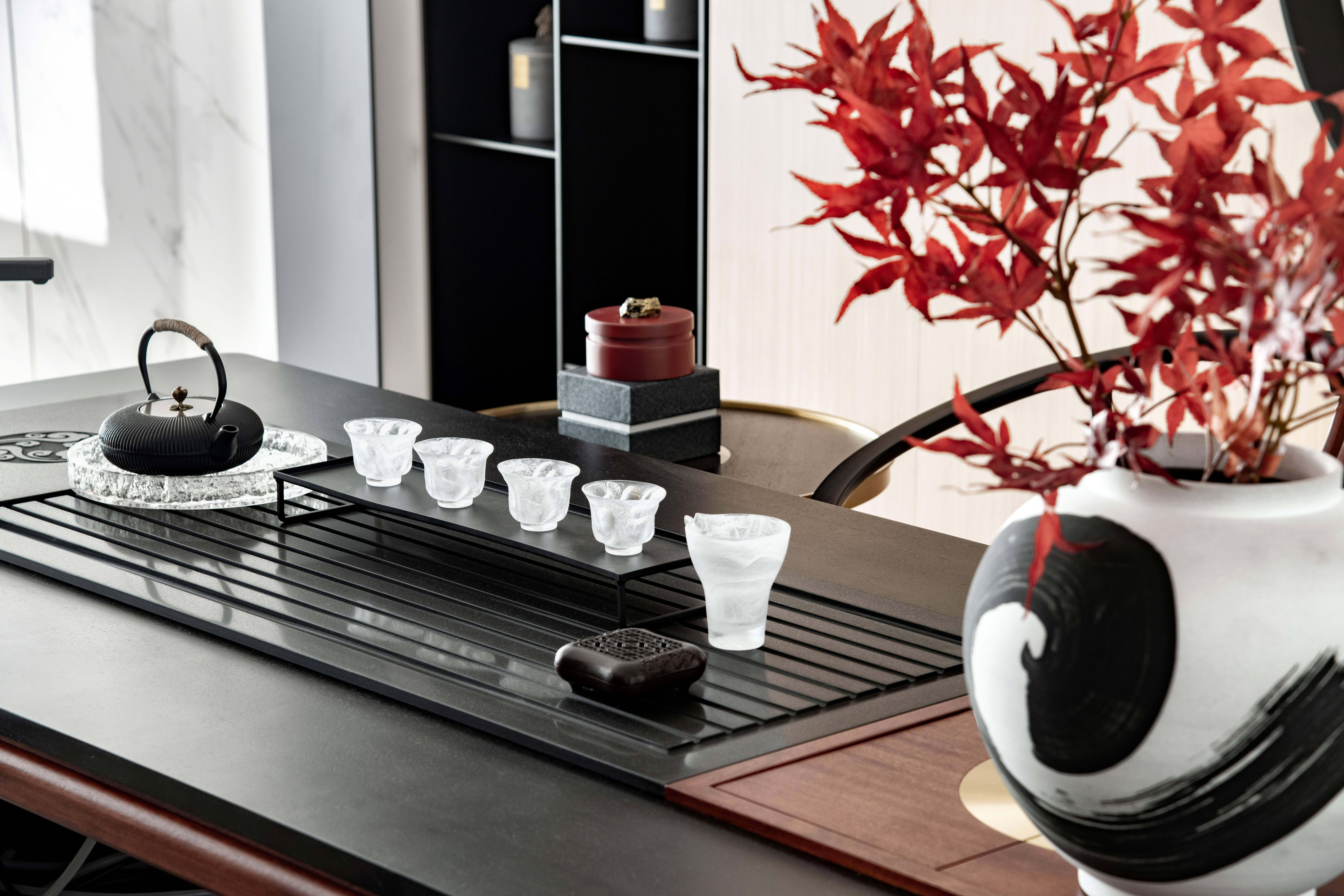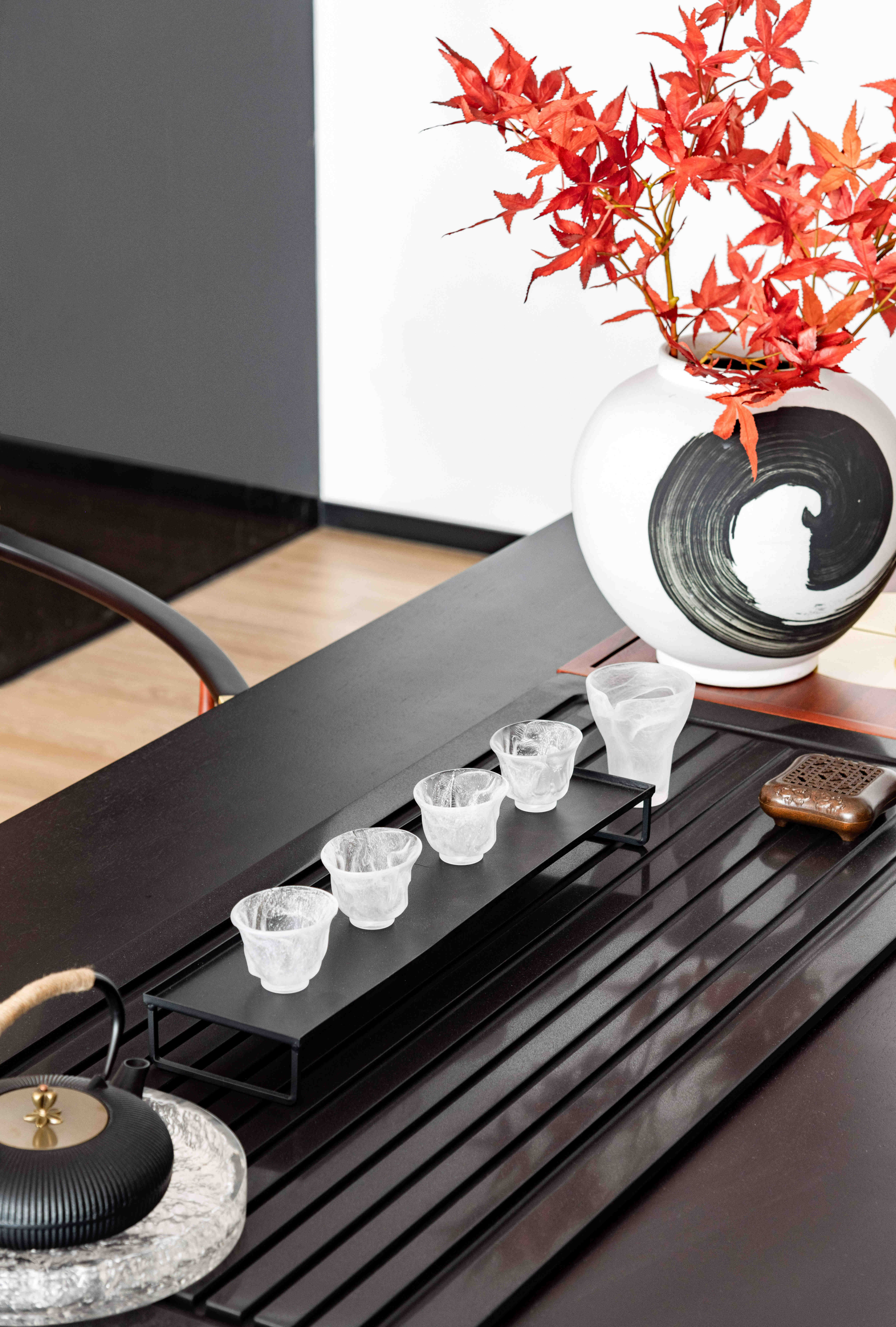 茶室的木质背景墙与黑色石材结合,条纹造型增强空间的纵深感。天圆地方,透过圆窗,诗意情境,灯光照射仿佛看到大自然流转。一席茶桌,一把明式圈椅,玻璃茶盏,红润的茶汤让人回归内心的静谧,达到淡泊致远的人生境界。