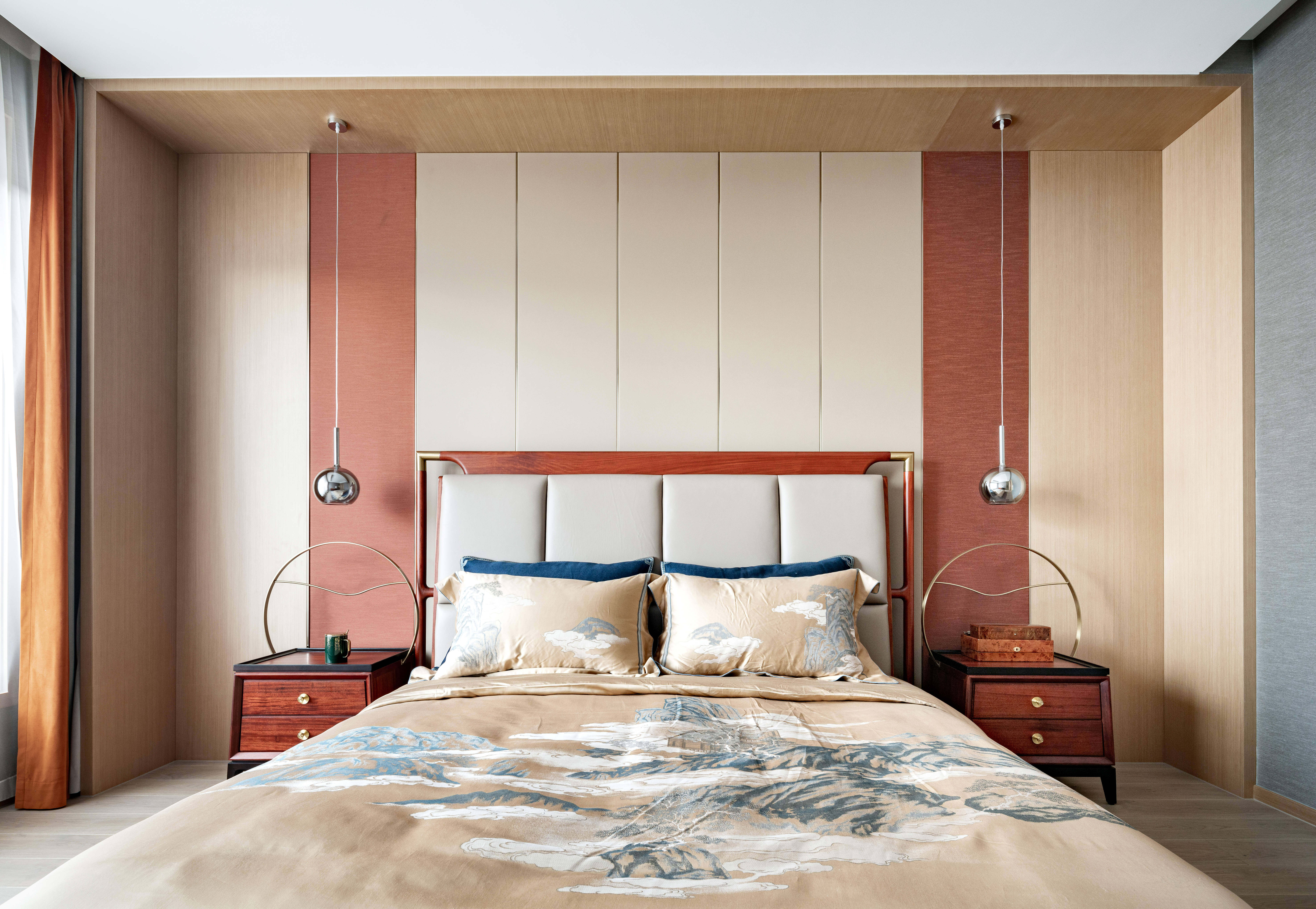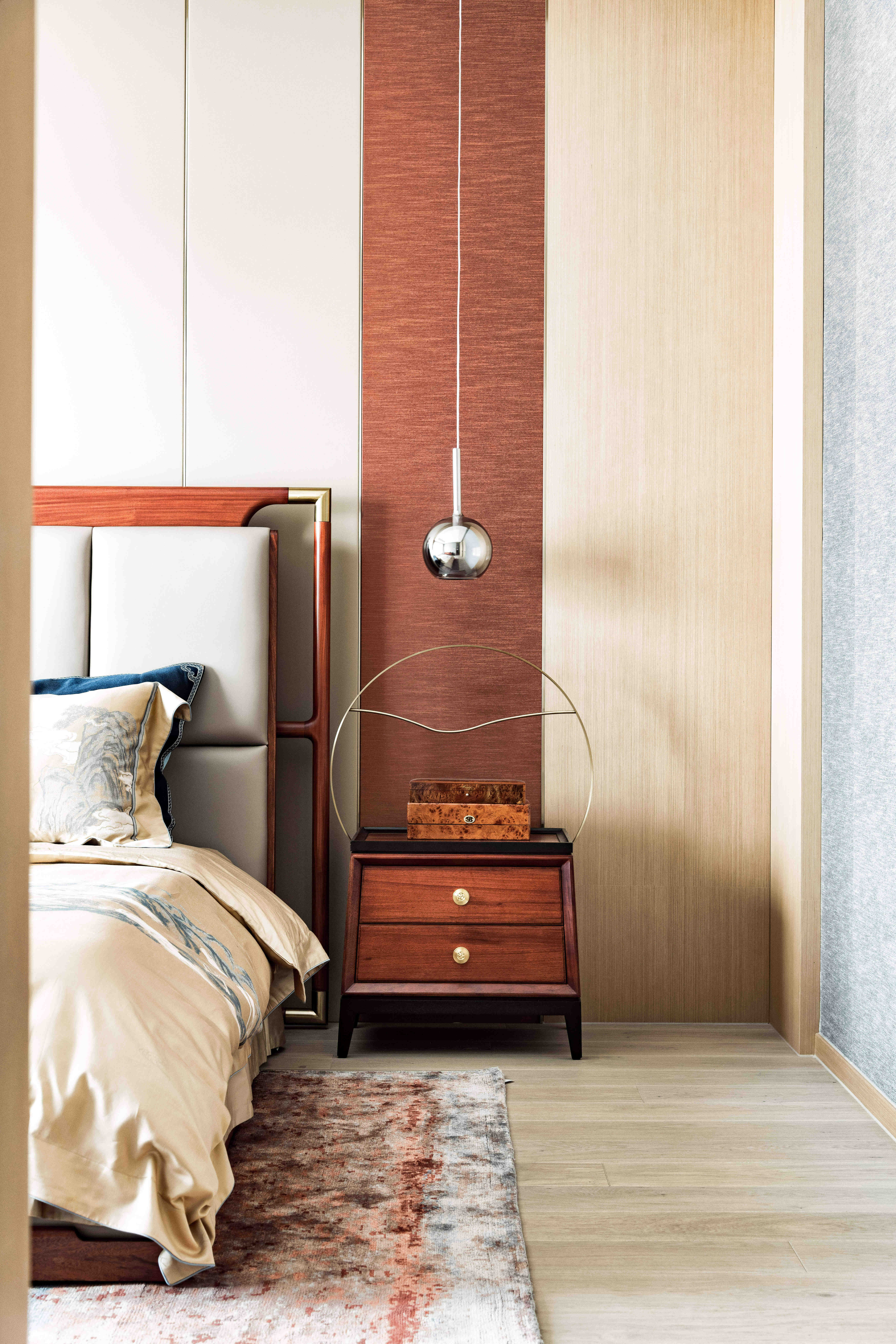 卧室空间简约的中式家具,以橙色增强空间的活力,地毯如水墨晕染,独特符号意义的床头柜,点出了空间的高雅气质,沉浸于文化氛围中,一种“采菊东篱下,悠然见南山”的心境让卧室的休憩时光格外放松。