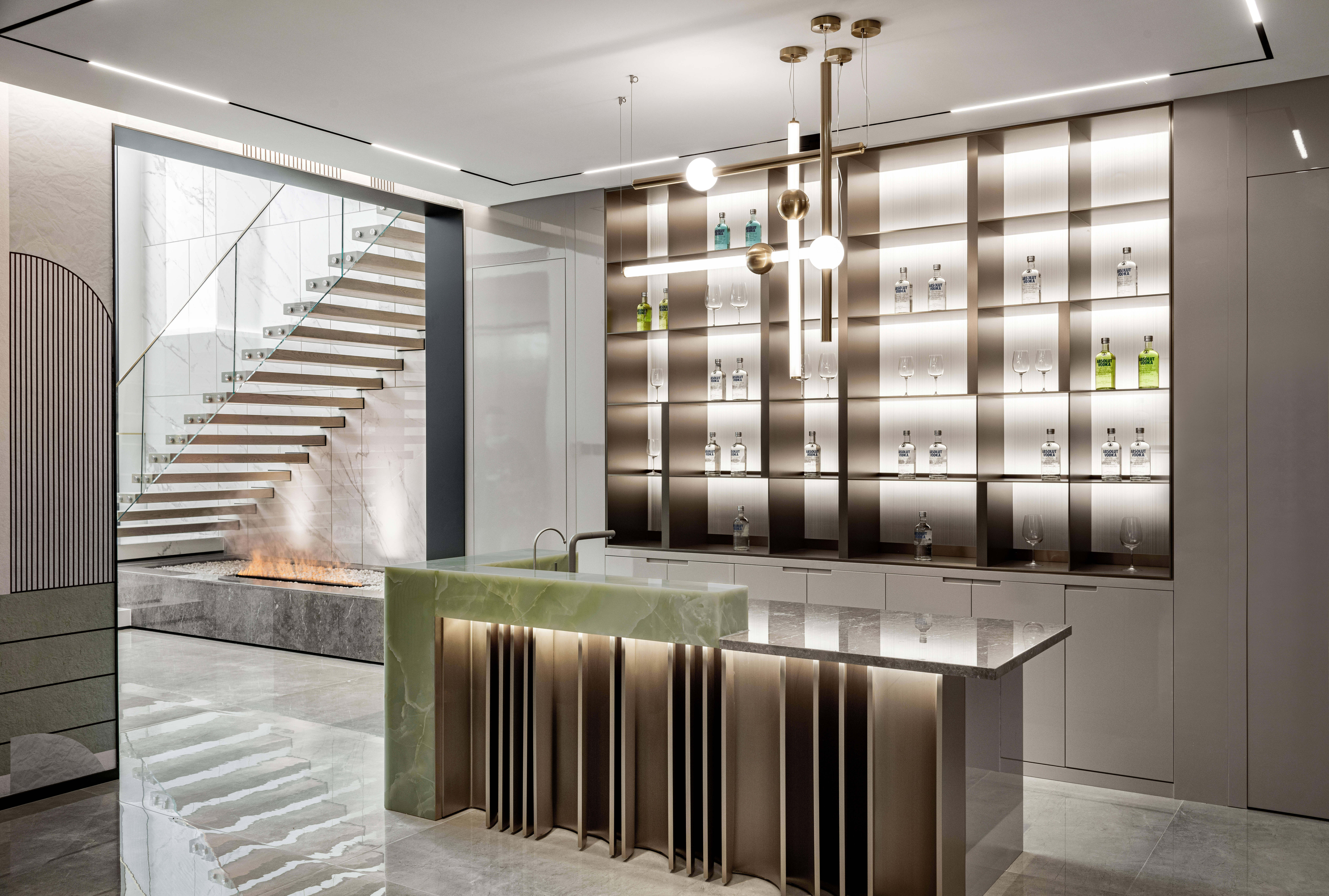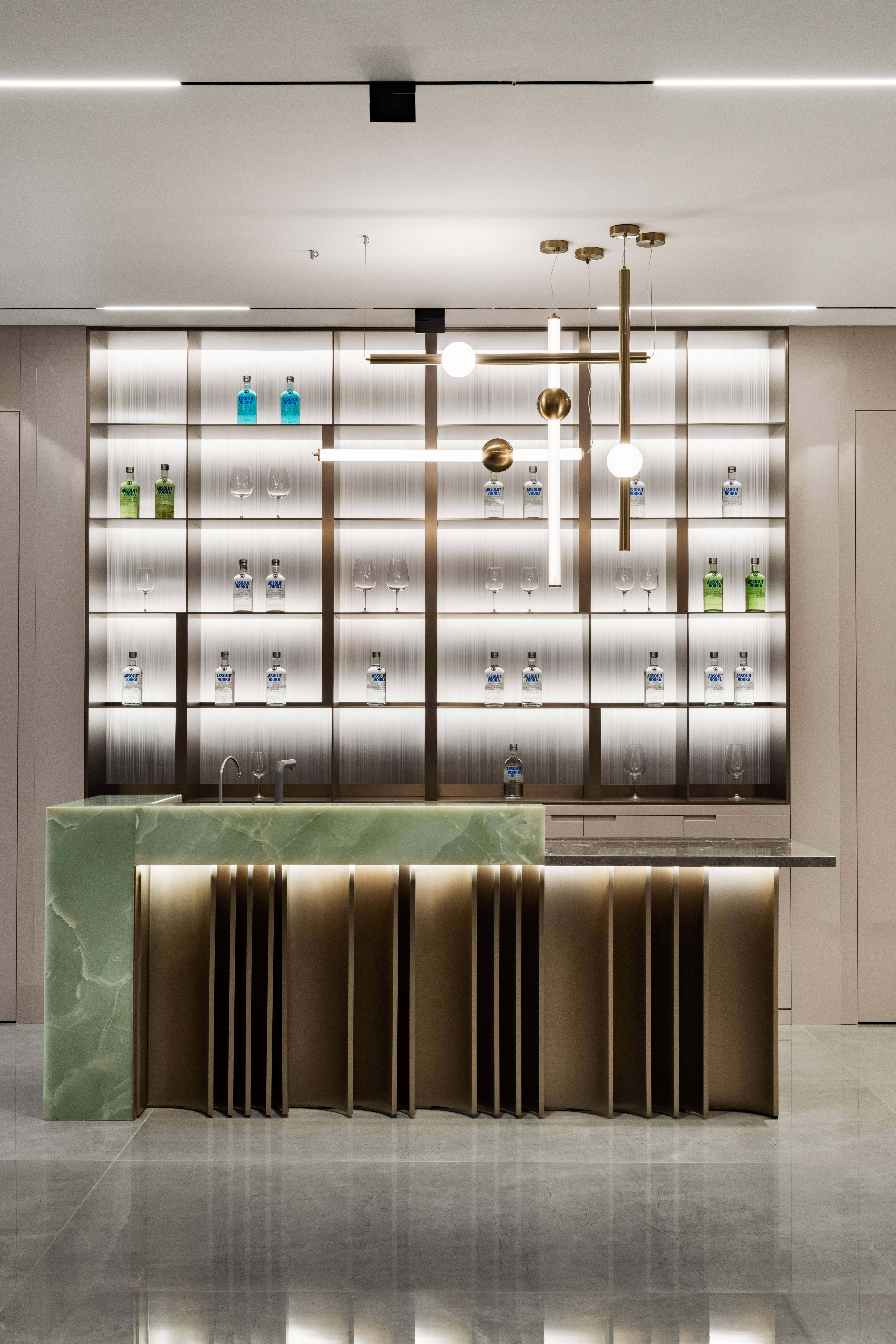 设计师特别设计的吧台台面由玉石、金属和大理石结合而成,呈现出空间独特的个性,酒柜陈列架壁纸在灯光的照射下,肌理清晰可见。细腻的感知与雅致豪奢相融合,为感官带来更深层次的体验,在精细的表现中,美浮现出来,这是属于居住者的空间密码。