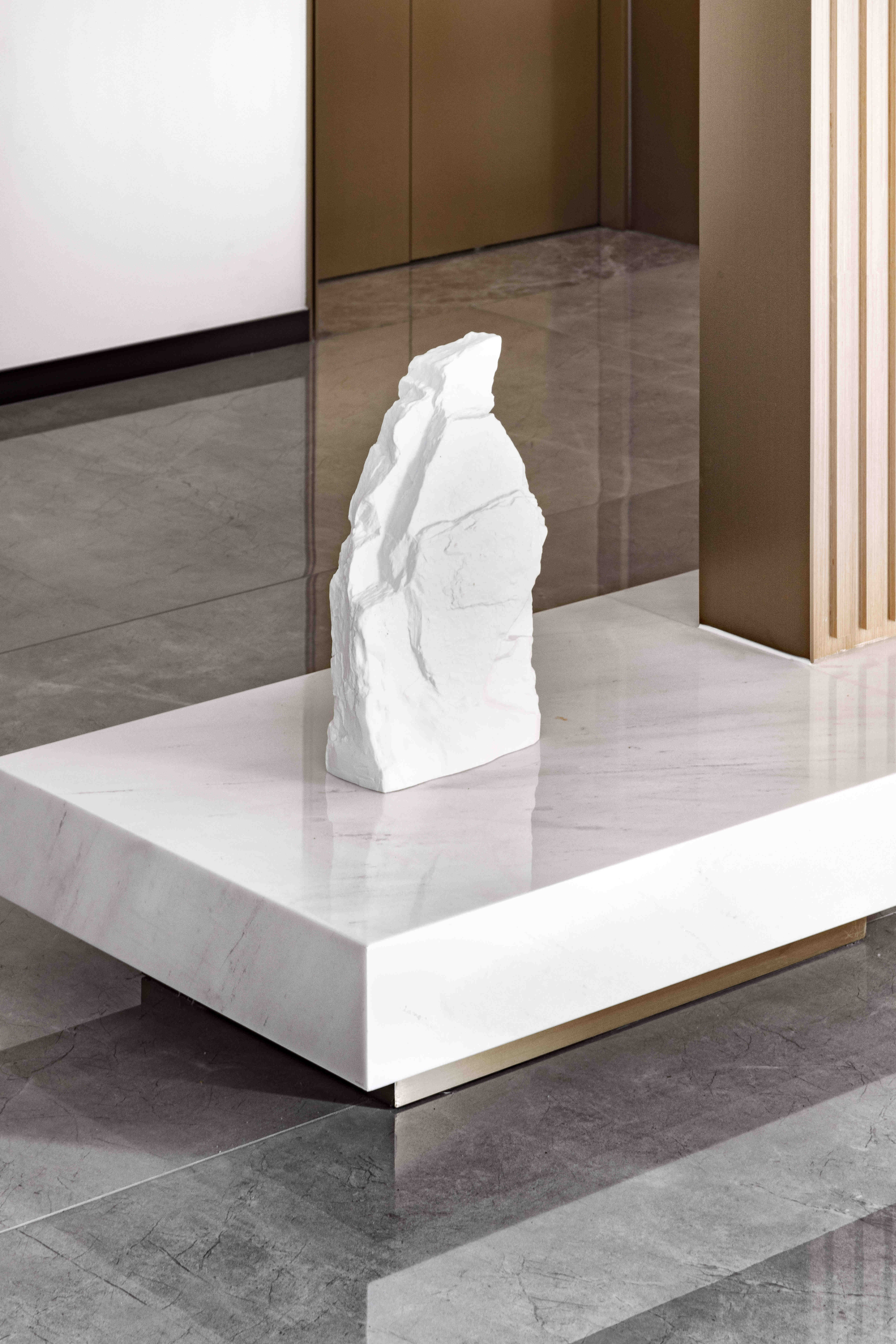 一棵风姿绰约的松下,白色的大理石底座向外延伸,放置纯白的山石雕塑,“君不见拂云百丈青松柯,纵使秋风无奈何”,“何当凌云霄,直上数千尺”,高洁之姿传达出主人的人生态度。