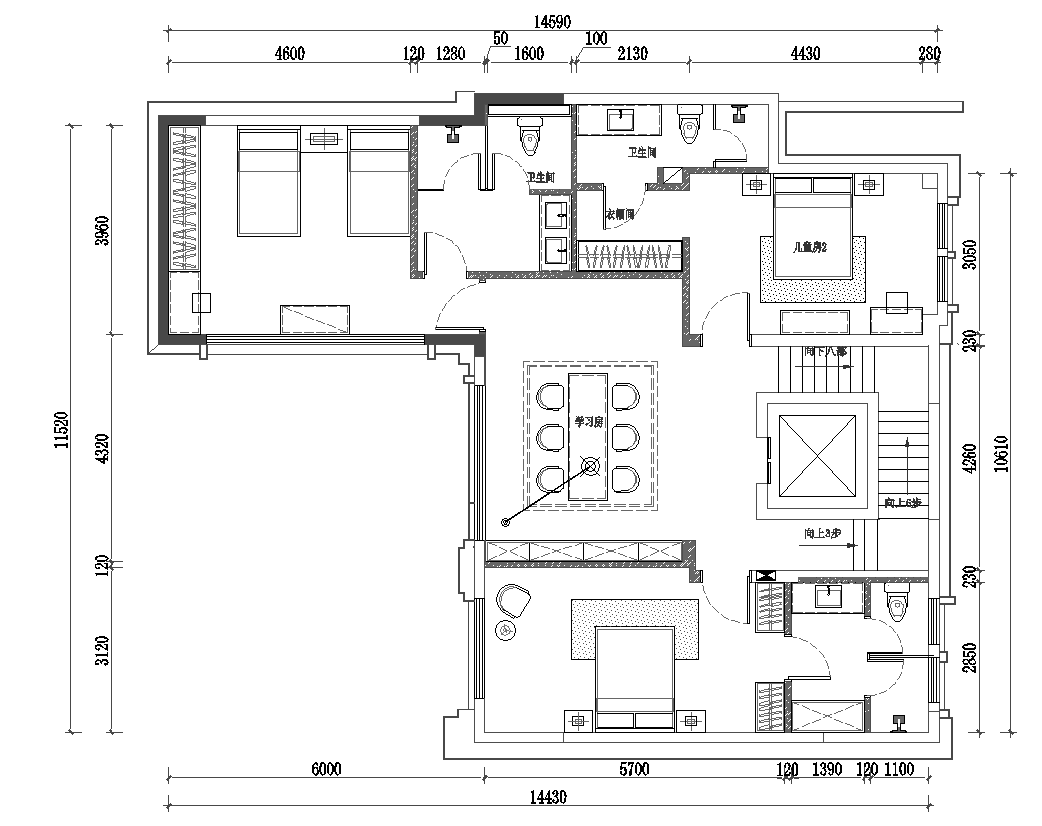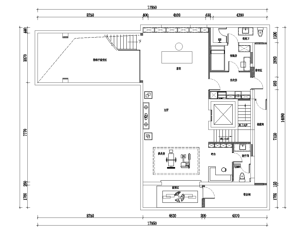 超越空间与时间 地下二层在采光井位置的挑高,带来了良好的采光和透气性,丰富了空间的秩序,向上的延伸也带来了视觉的扩张,豁然开朗,让这里不再是阴暗冷峻的地下空间。黑色的线条廓出空间的边界,而大面积留白的墙面轻盈向上,带着居住者的思绪缥缈驰骋,张弛之间形成戏剧冲突。