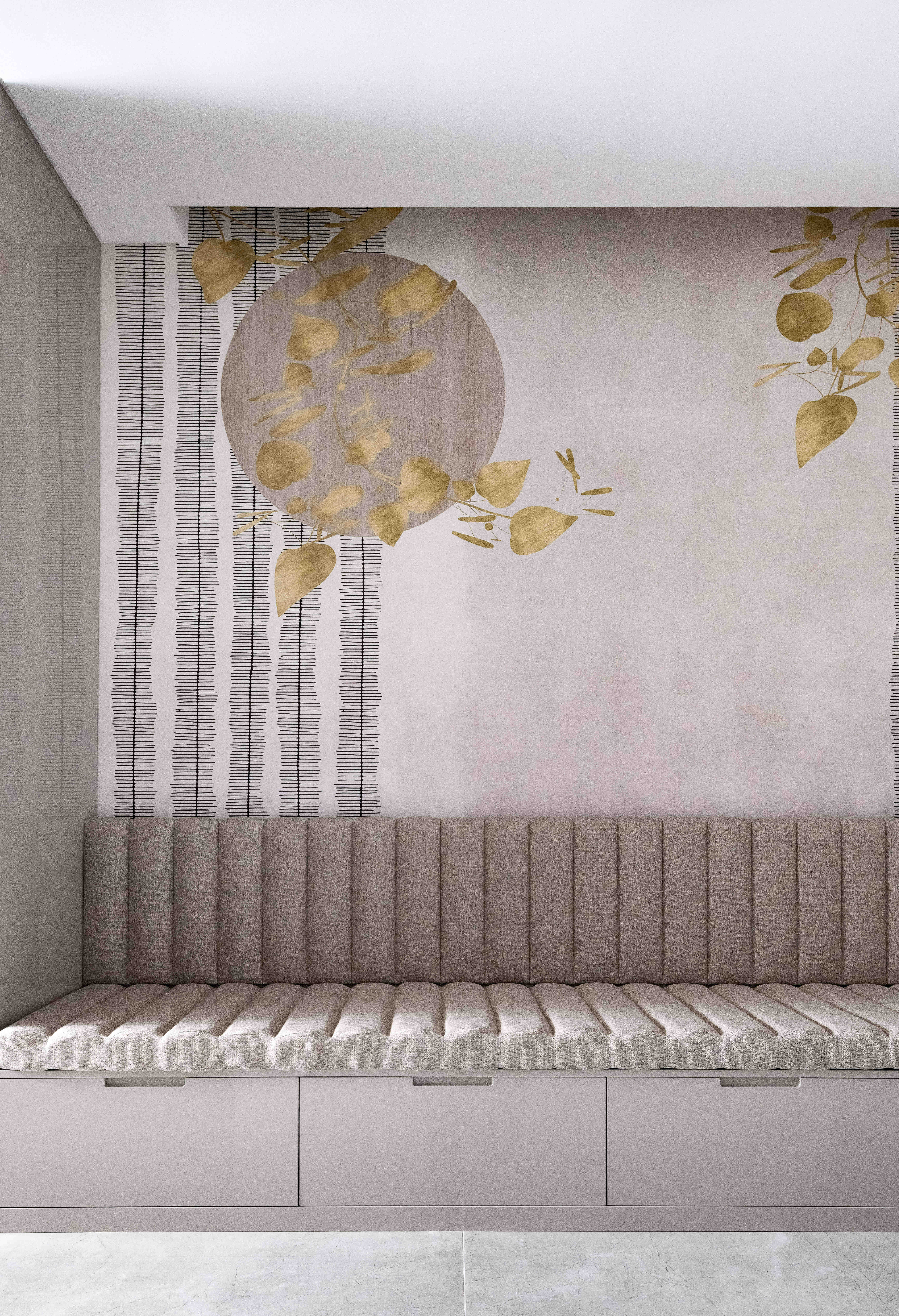 外部世界的喧嚣从此处开始隔绝,一种极简静默的气质从门厅开始往室内蔓延。隔断墙兼顾了入户的私密性和空间的流动性,圆形取景框隐约的视觉变化为空间增添了趣味。纯白色的柜体、灰色的毛毡换鞋区与木质的隔断背景营造出一个充满东方极简美学的玄关区。