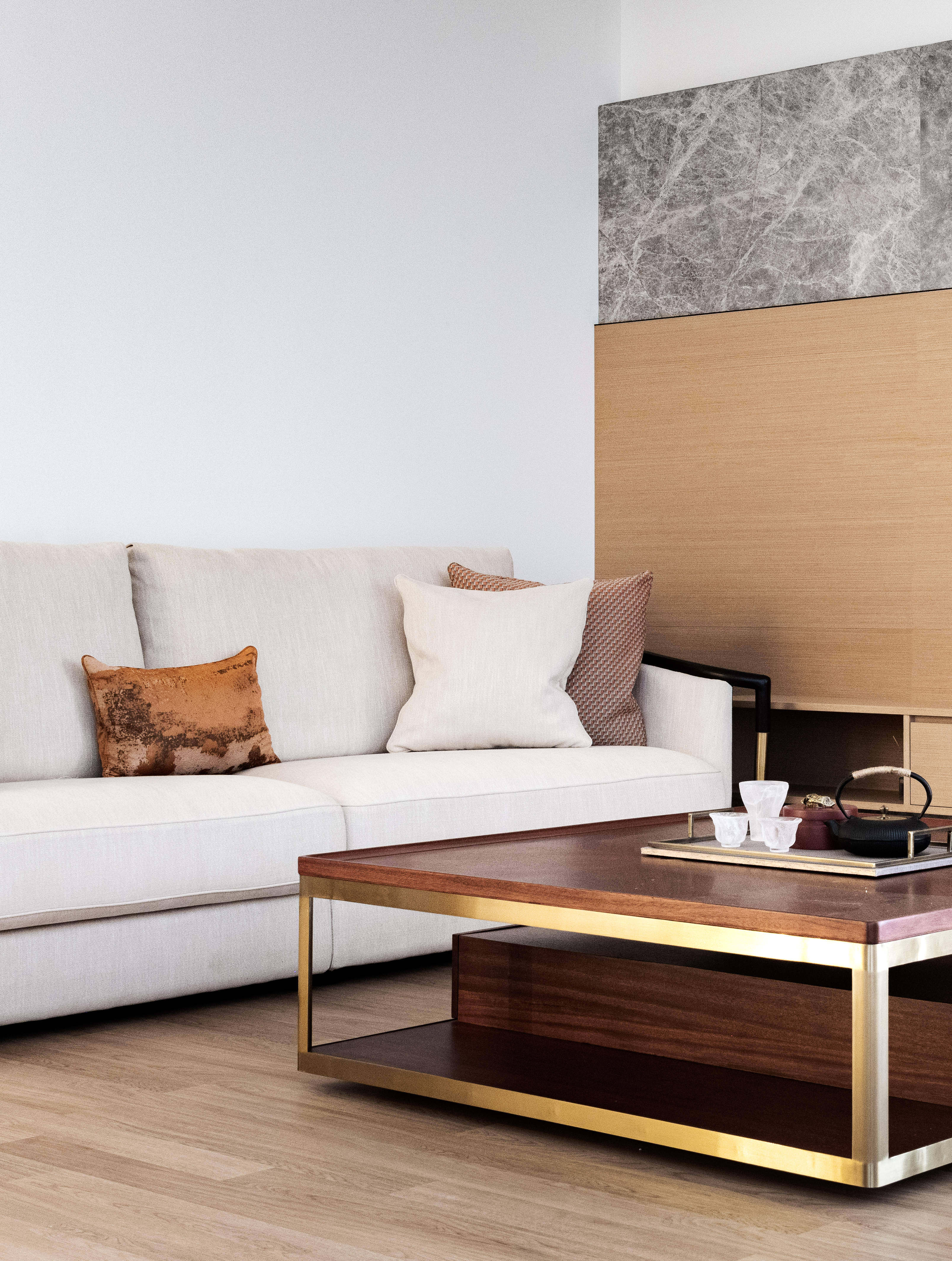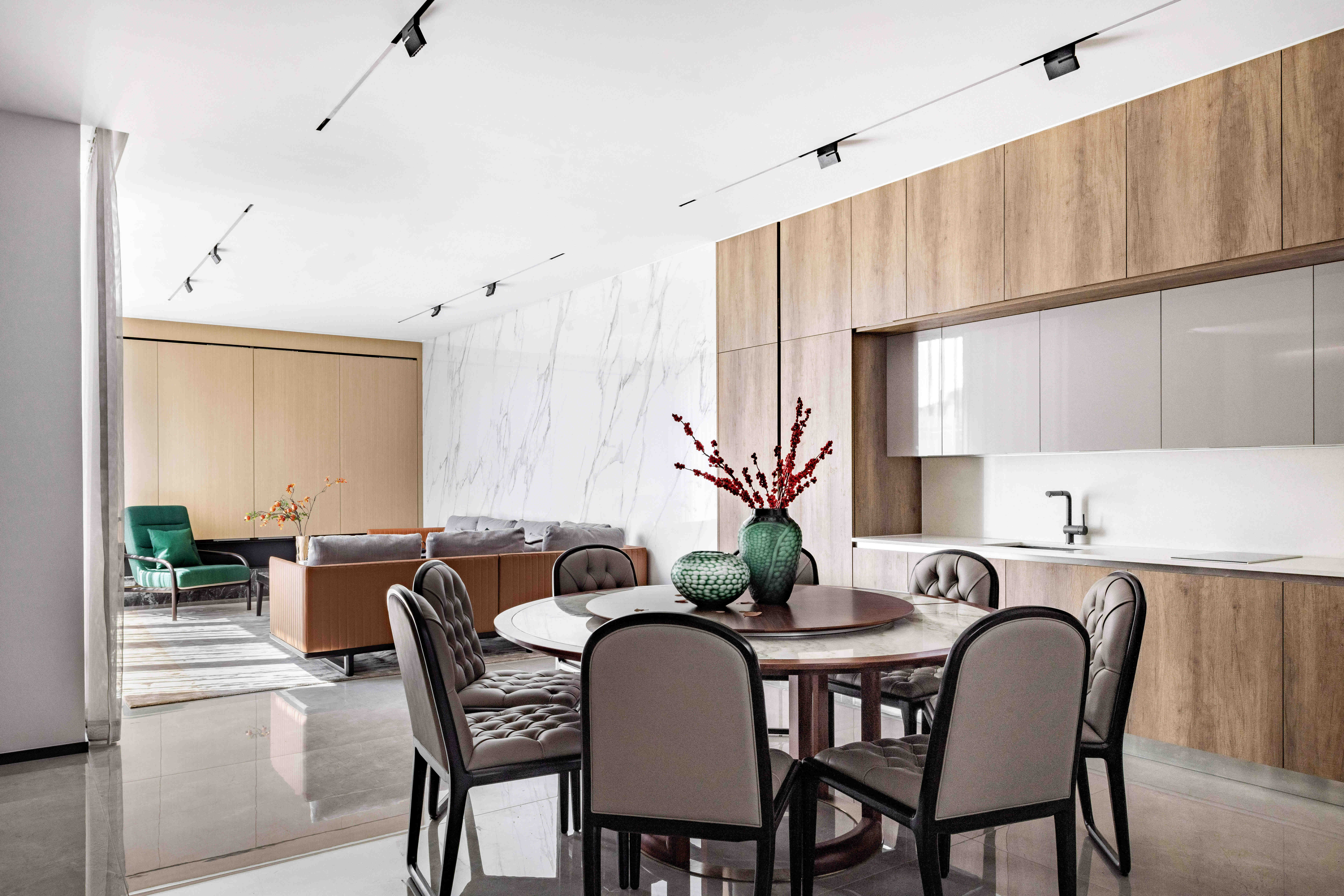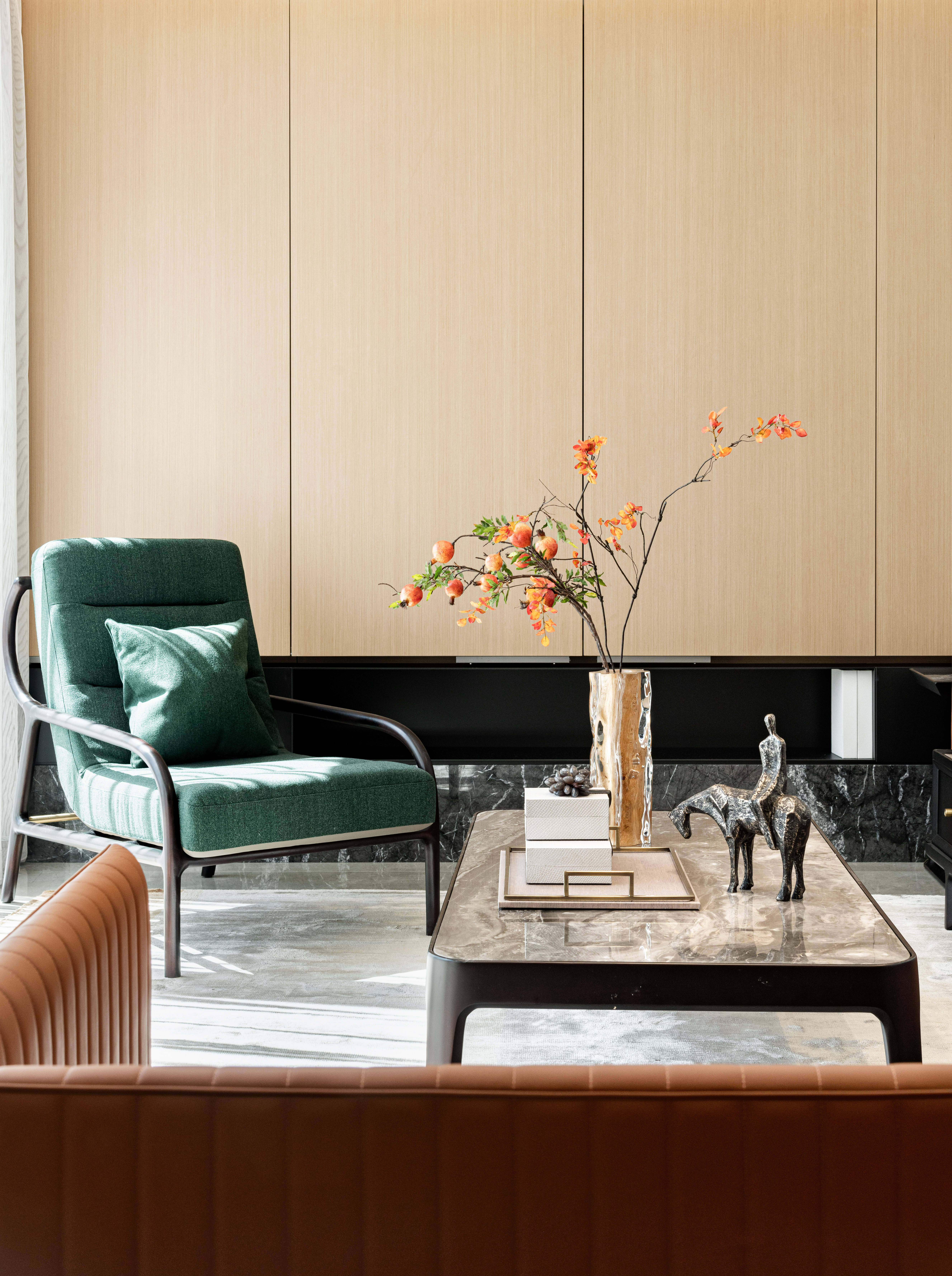 墙面地面线条接缝、大理石的拼花,在设计阶段全部考虑妥当,才能呈现出极度舒适的视觉效果。大面积的大理石背景、木质护墙和柜体、地毯的运用,冷暖碰撞,以较大的体块承载空间的纯粹和简练,流露出一种质朴和自然的气息。设计将装饰尽可能简化,更大的空间还予居住者,让人的行为、情感表达、精神世界丰富空间的内在。