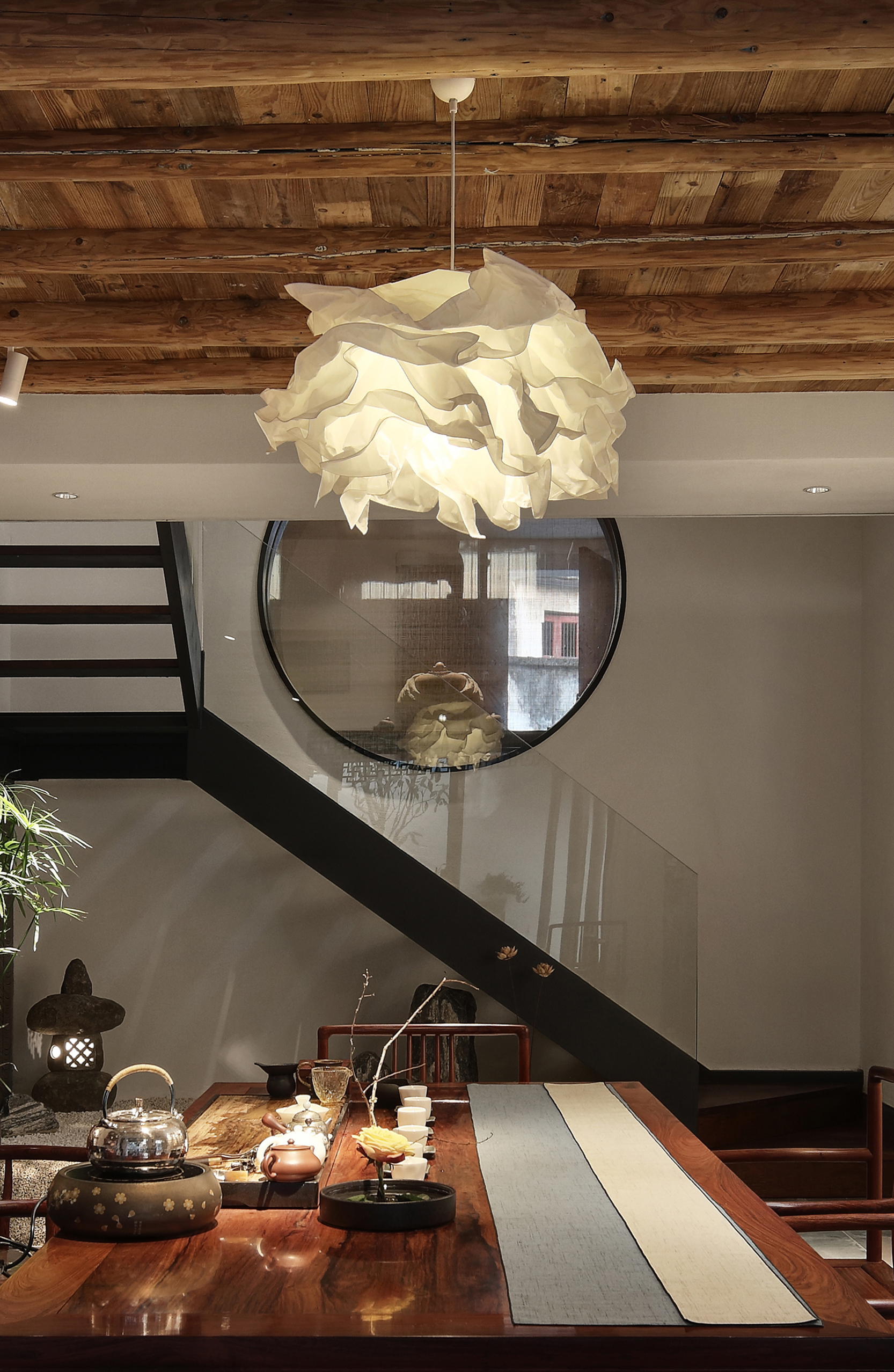 茶室中,木色、灰色与白色构建的立体空间,还加入了设计师的浪漫构想:洁白的花形灯如同一朵漂浮在茶室上空的云,柔软而飘逸;截取的紫光檀木悬挂在墙壁上,如同河海中遨游的大鱼。