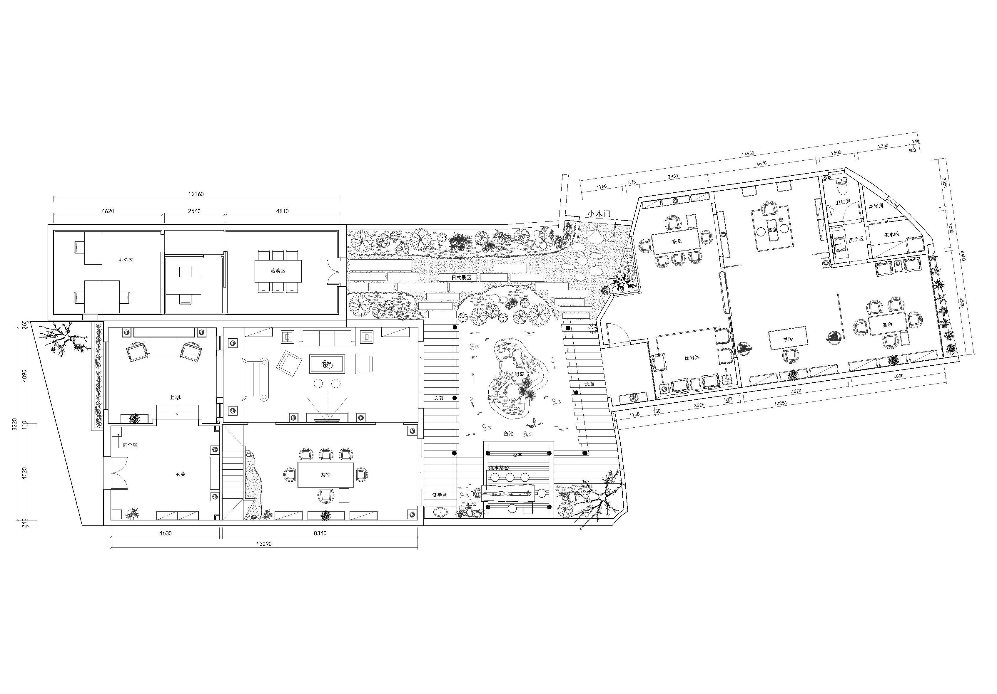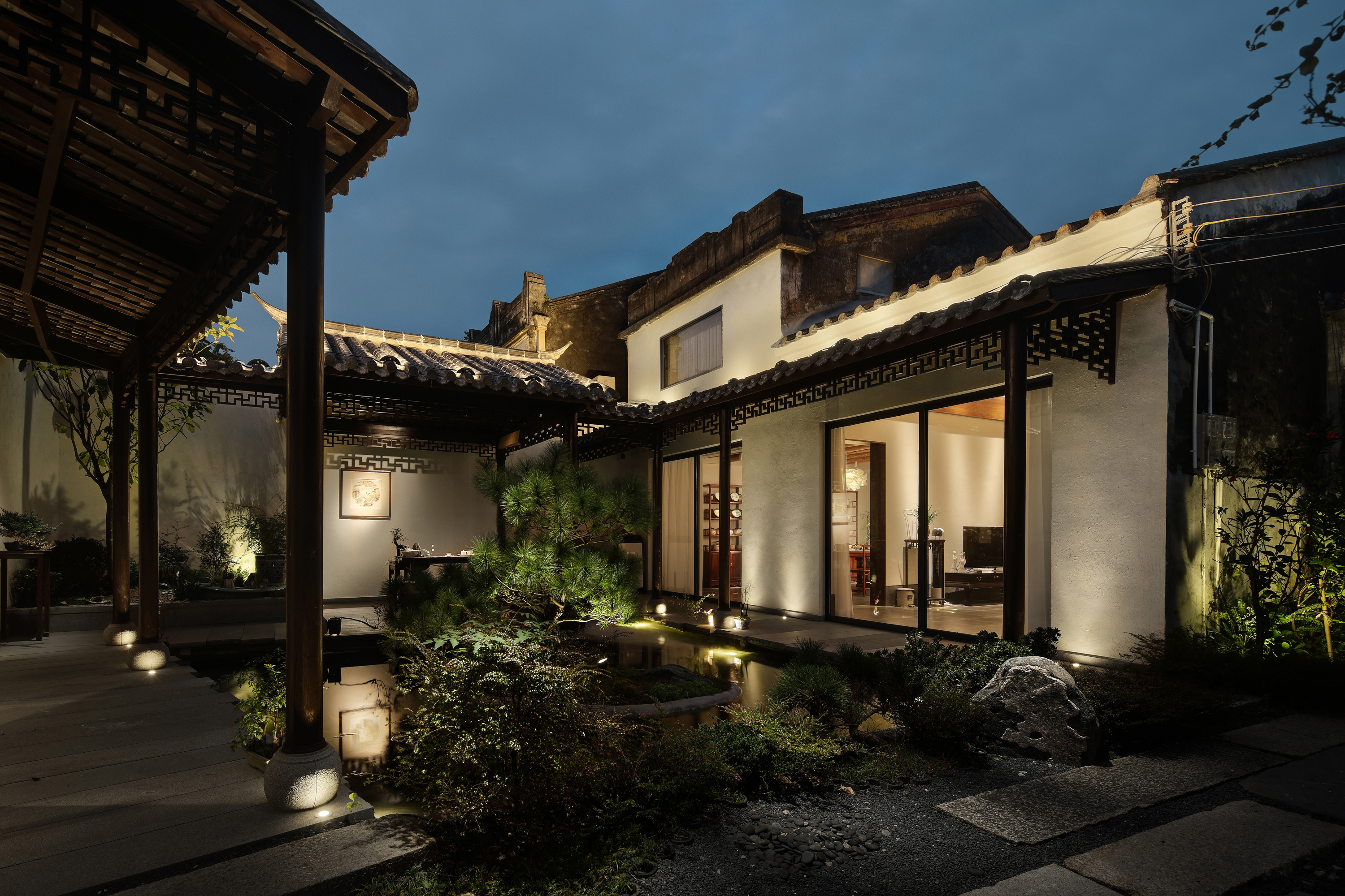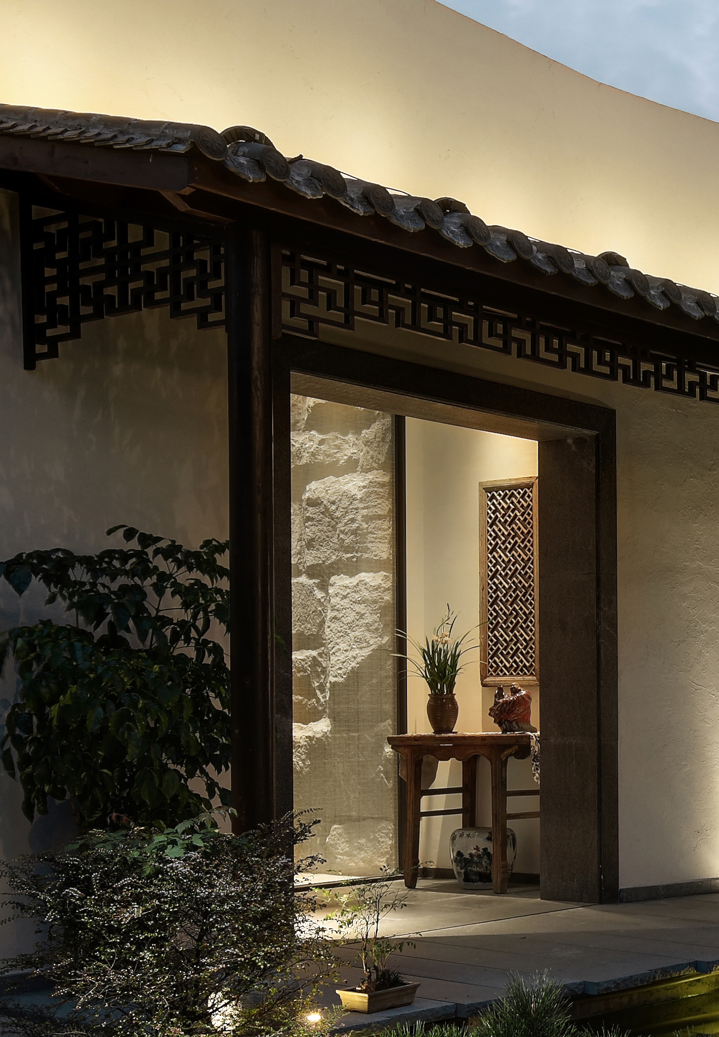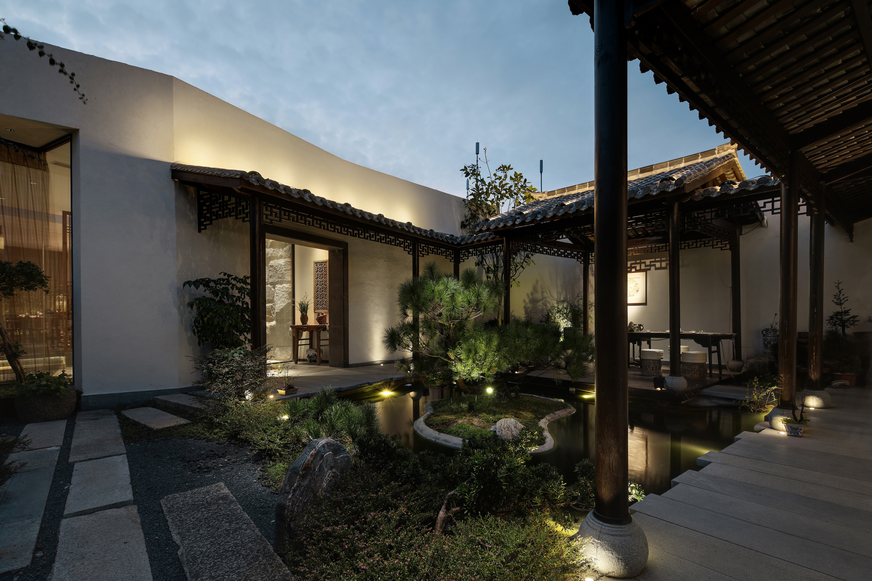 “适中”形成以庭院为中心的布局,庭院又以一池碧水为中心,碧水衔接着两边的房屋;庭院两旁的房屋内各设了台阶,台阶使建筑形成由高处而下向碧水趋近、汇聚的走势,这样设计的效果不仅使室内空间有高低错落之感,更将这个建筑打造得藏风又聚气。人坐在后院品茶谈天,受益于凝聚于此的气息的滋养,说话的声音都要响亮几分。