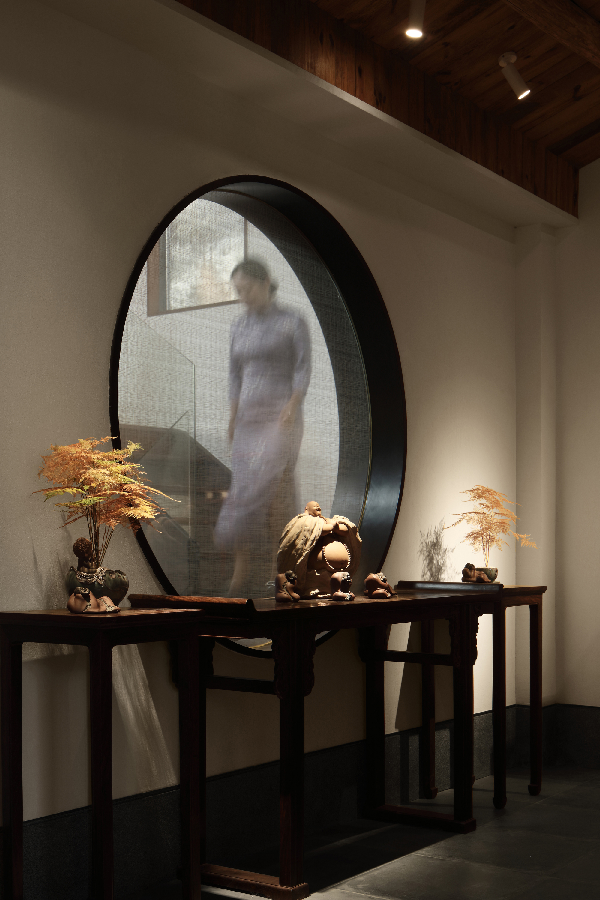 玄关处的月亮窗,仿中式建筑中的月亮门而设计,窗中贴了一层隐约透光的薄膜。它是温婉的借景、透光装置,在此实现了若隐若现、透光幽静、通达内外的效果。 透过月亮窗上的玻璃,隐约可见窗内有茶室,朦胧之中,看得见里边的人,又看不太清晰,吸引人移步探幽。