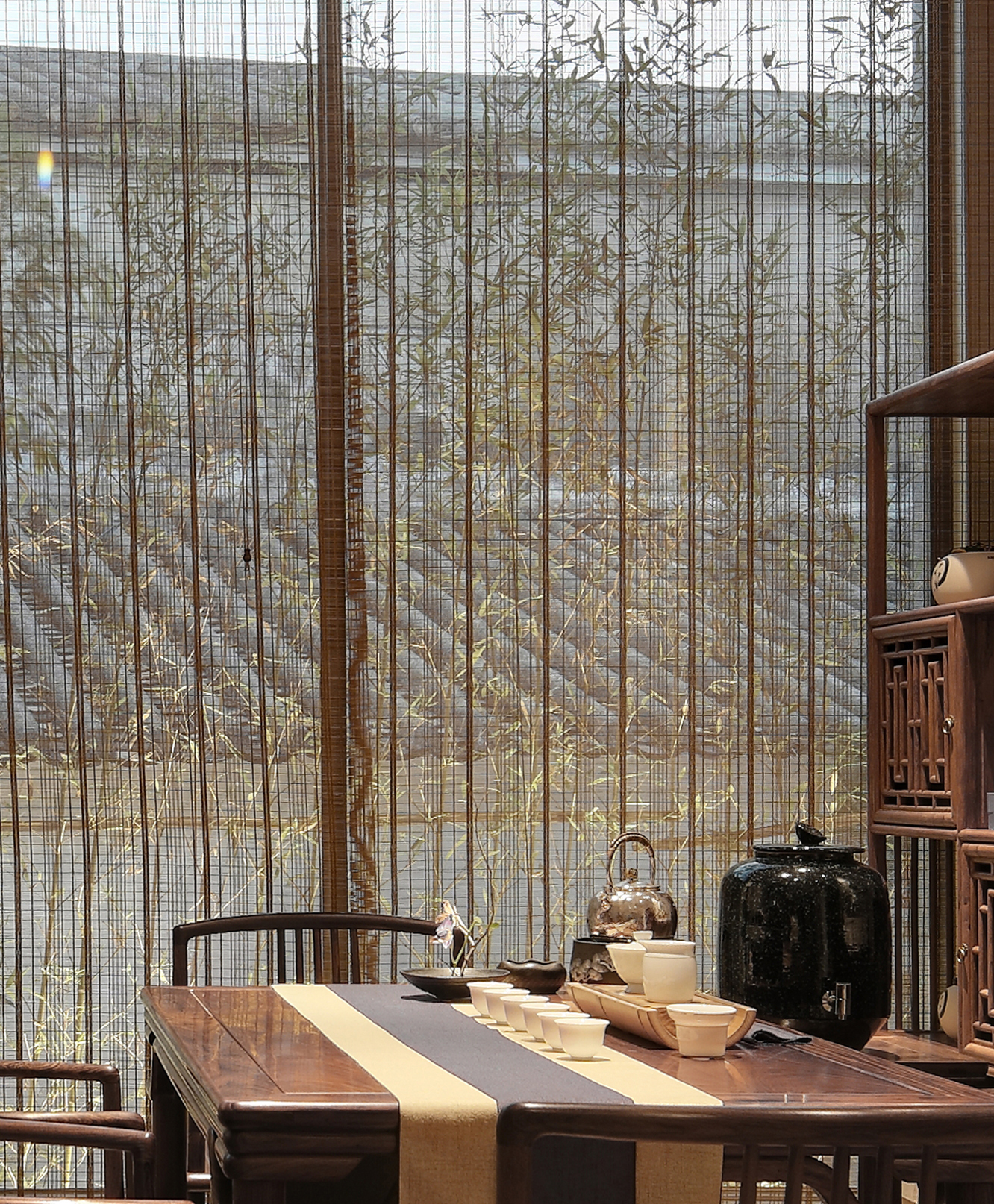 透过疏朗的竹枝与竹帘,隐约可见屋外灰白的民国旧宅,不觉心生“幽然见邻家”的美好。