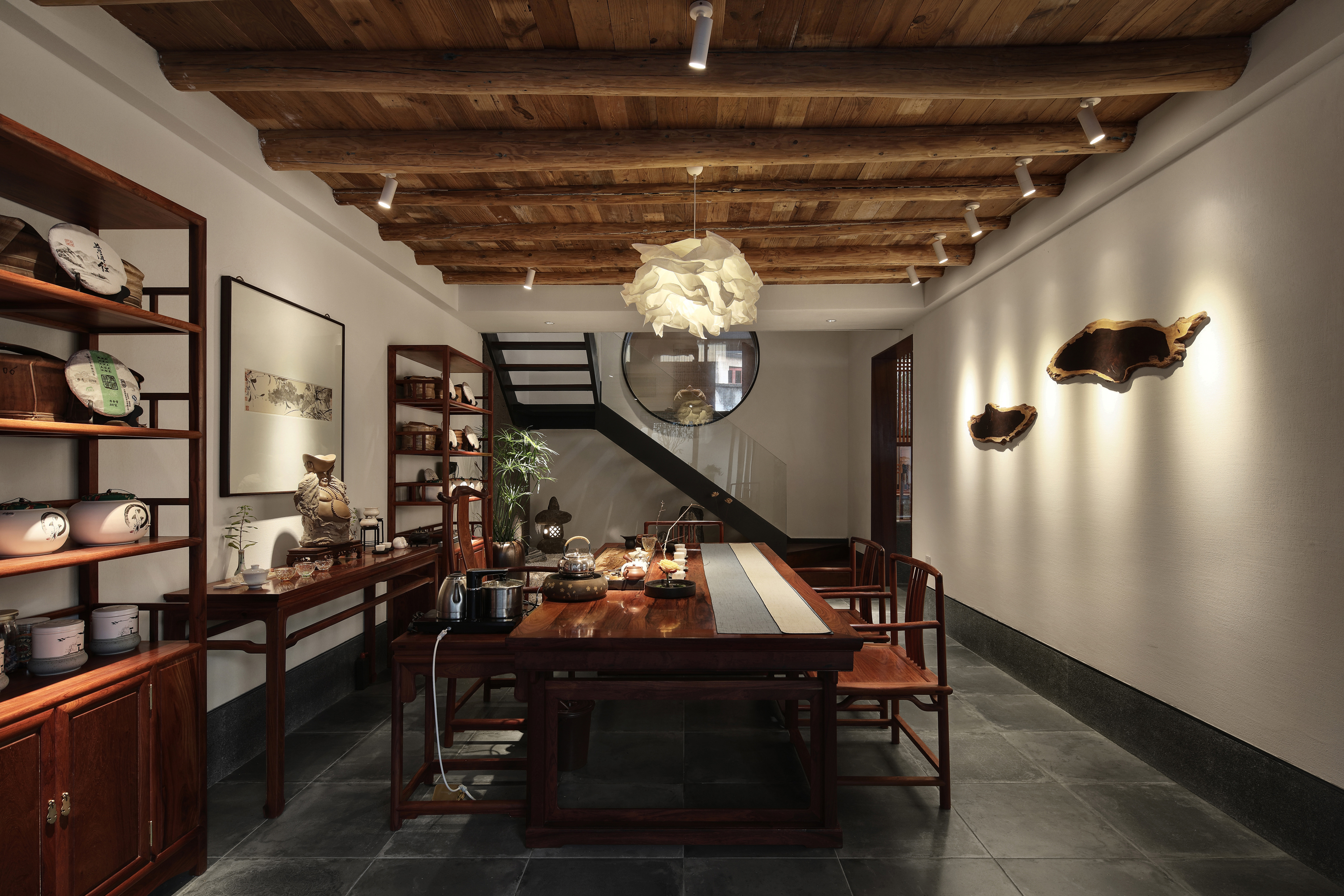 透过月亮窗上的玻璃,隐约可见窗内有茶室。要去茶室,没有直行路线,你得绕着走。自玄关右转拾三阶而下至中堂,再拾四阶而下到客厅,左转才是茶室。原本,三溪村民国旧宅的行进路线并非这般迂回,而采用一列房间纵向排开的布局,人直进直出,设计师采用曲折回环的手法,打破旧宅原有布局,将行走动线由直线改为曲线,营造“曲径通幽处”的雅趣,增加了空间互动感。