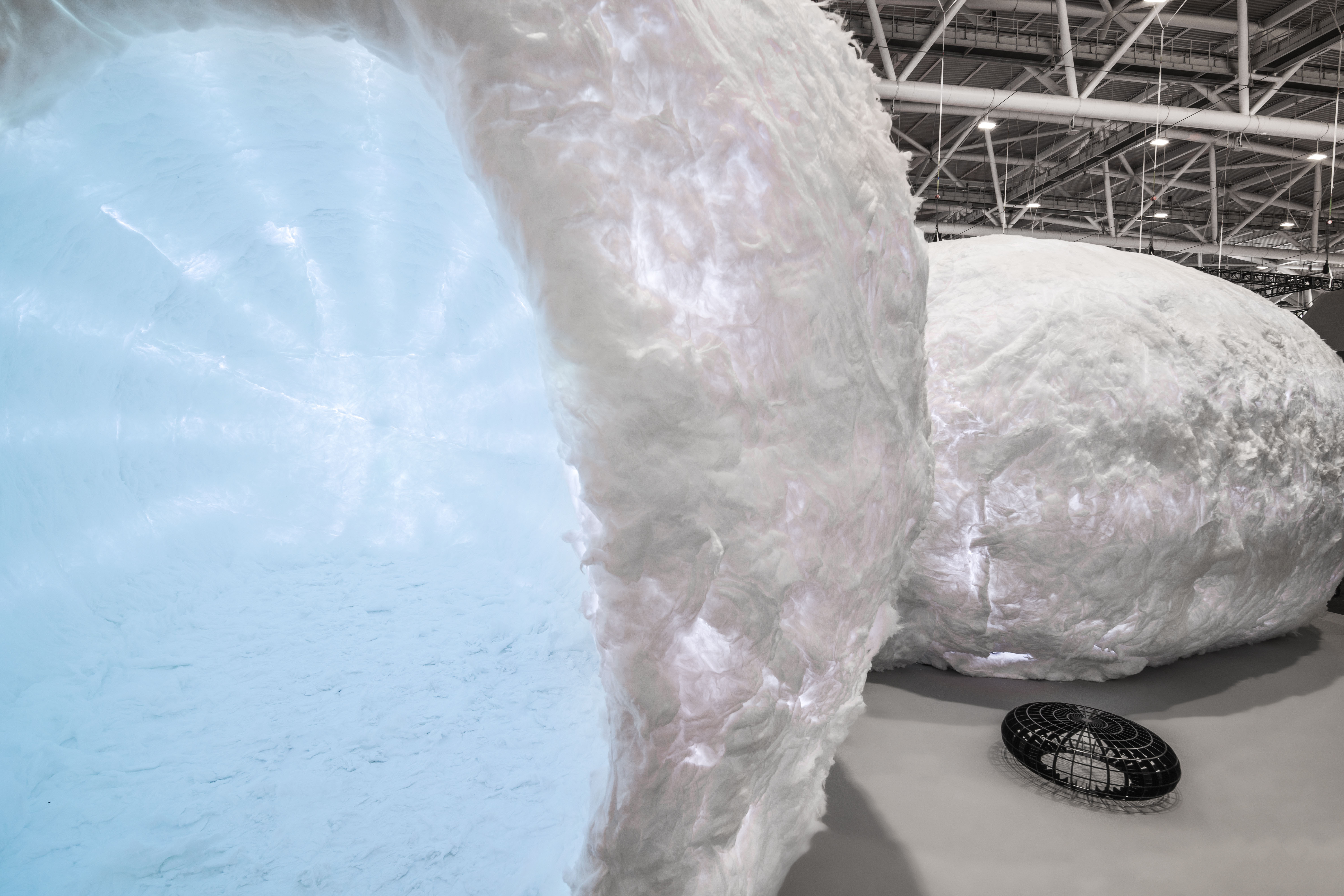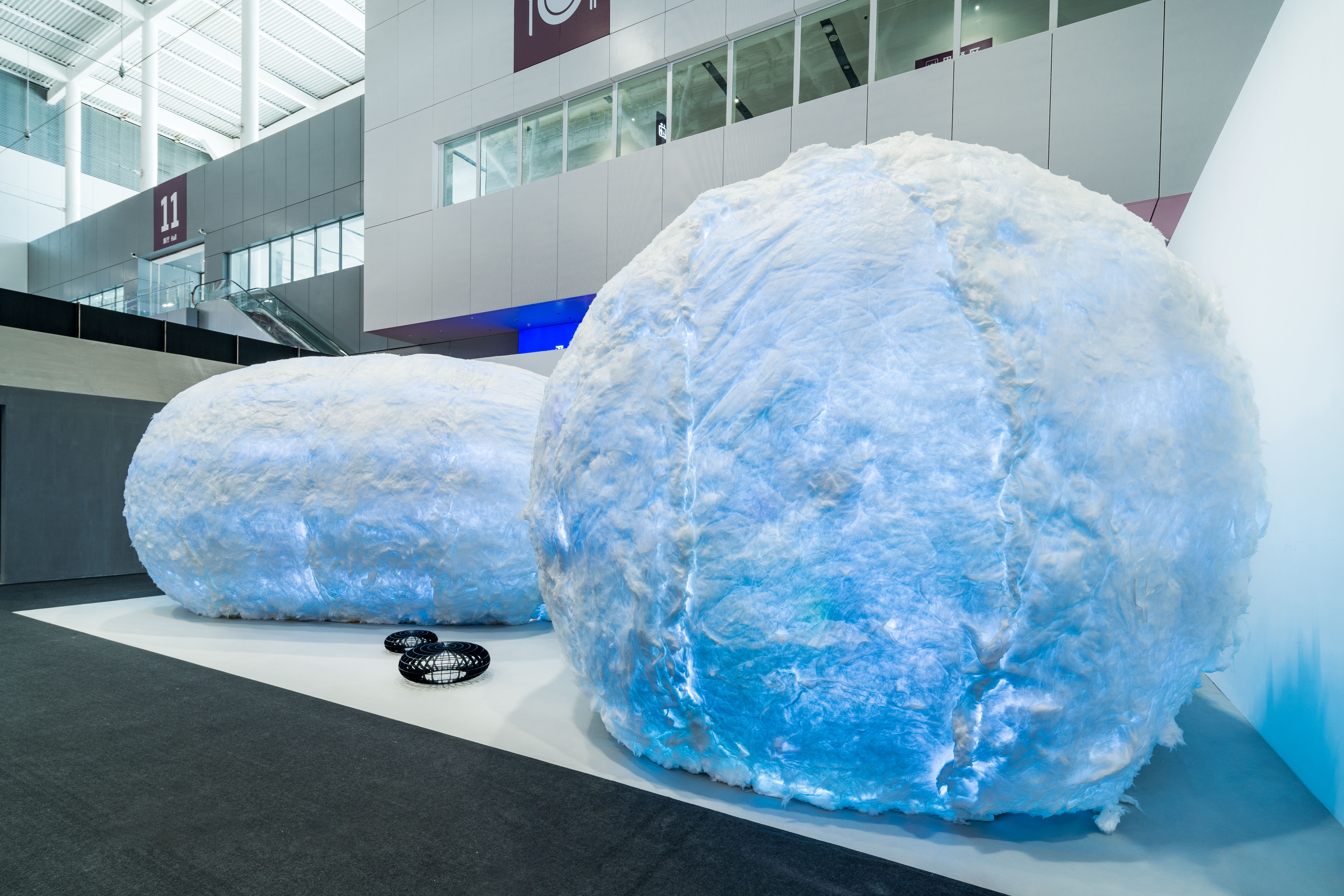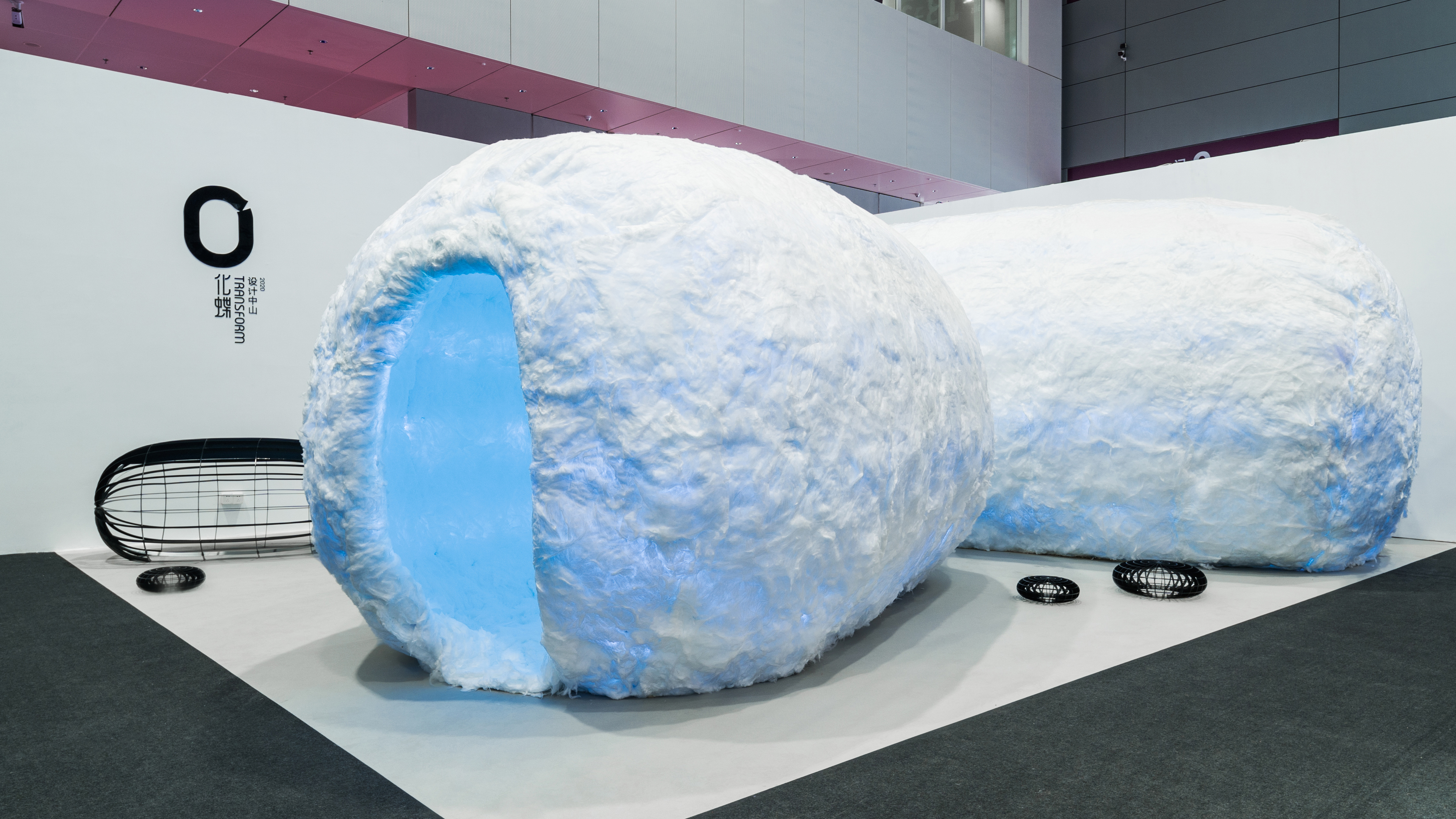 设计选材:极简的背后需要技术来支撑,用什么材料来完成这个设计成为整个设计的一大难点。最终采用了金属做建筑装置的骨架,它防火又坚固。然而,又用什么来做包裹骨架的材料,好让整个建筑看起来有蚕茧的观感和质感,又能防火阻燃呢?设计师发动了很多人来找,最终找到了最接近设计效果的材料——白色的隔音环保棉。