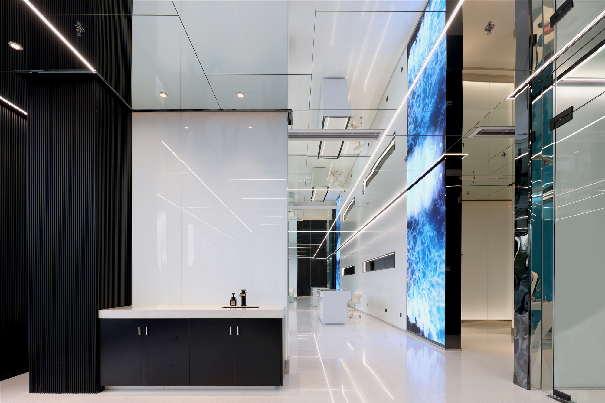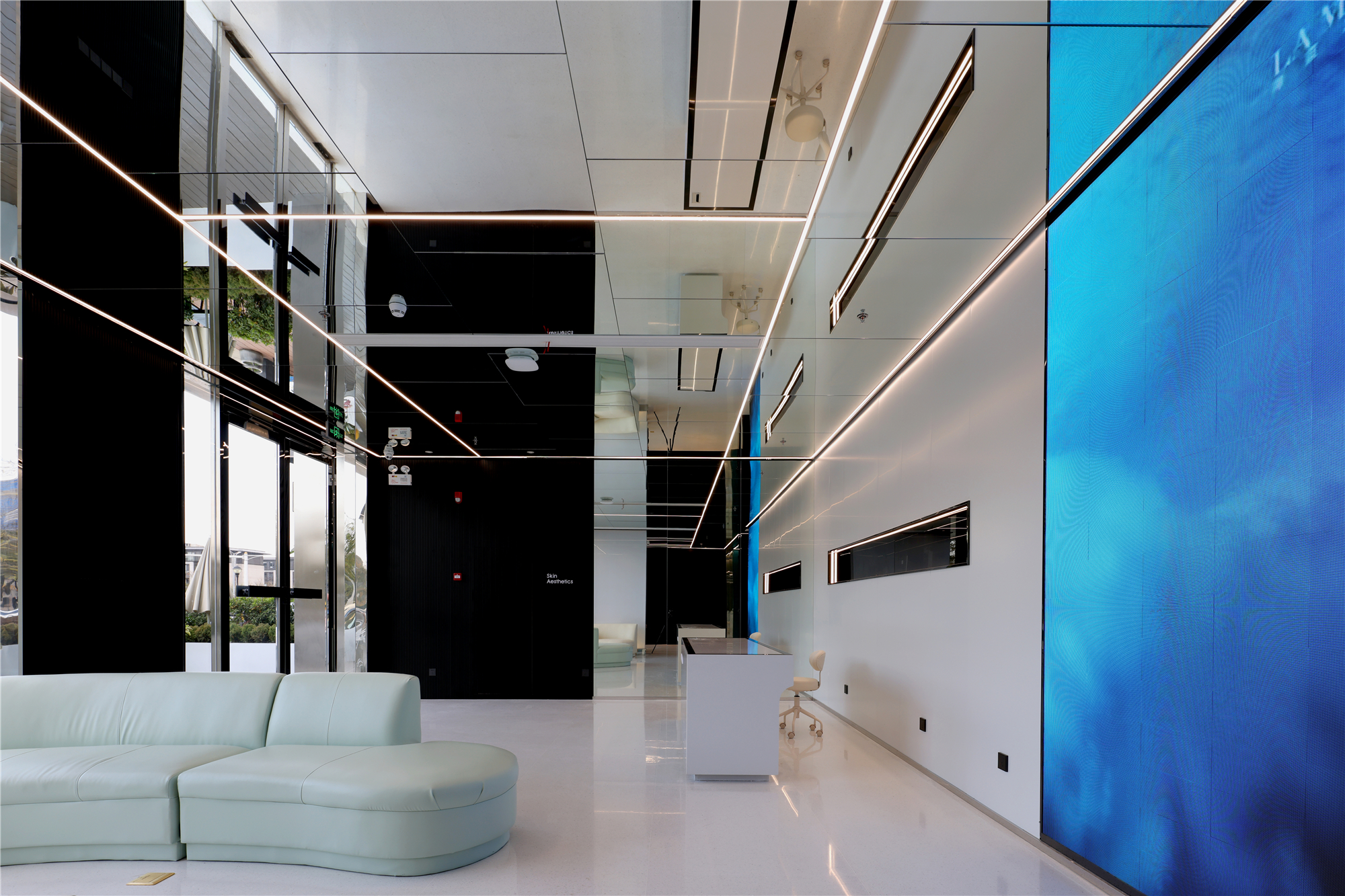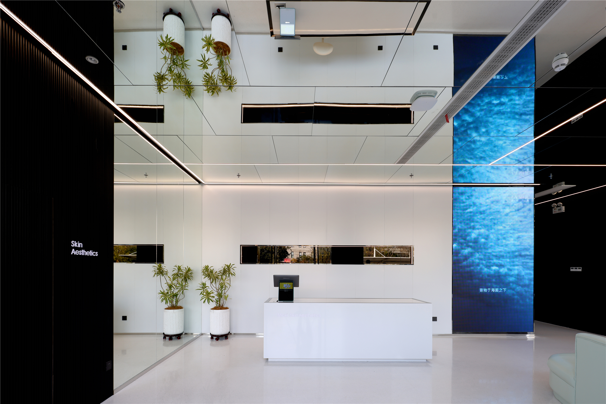 的铝板,呼应医美的洁净与细节。右边的到顶LED屏,随意的播放产品宣传,都会让整个空间更有活气。 -