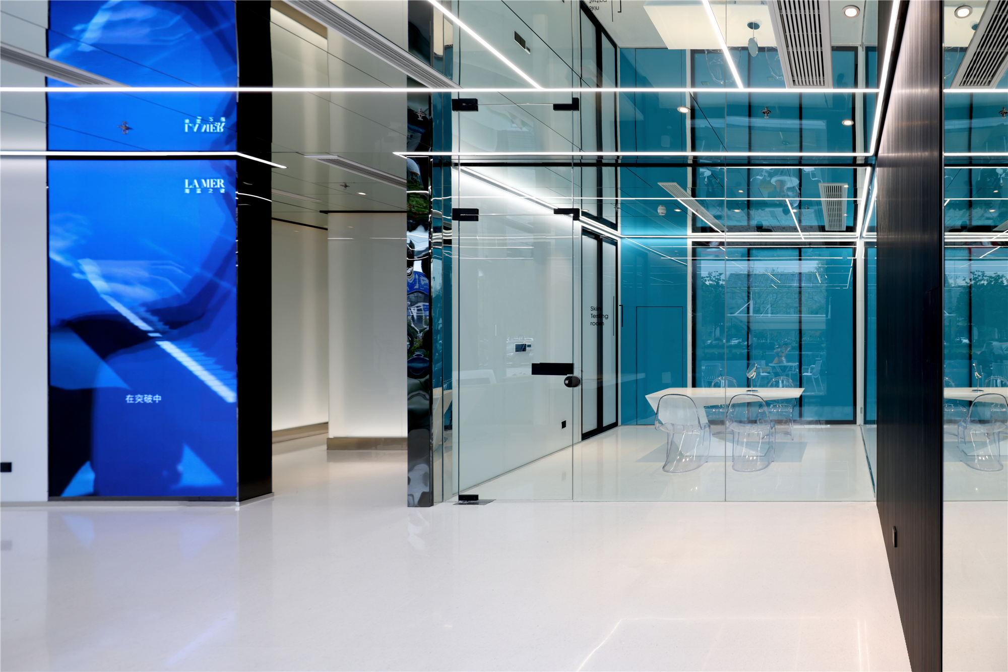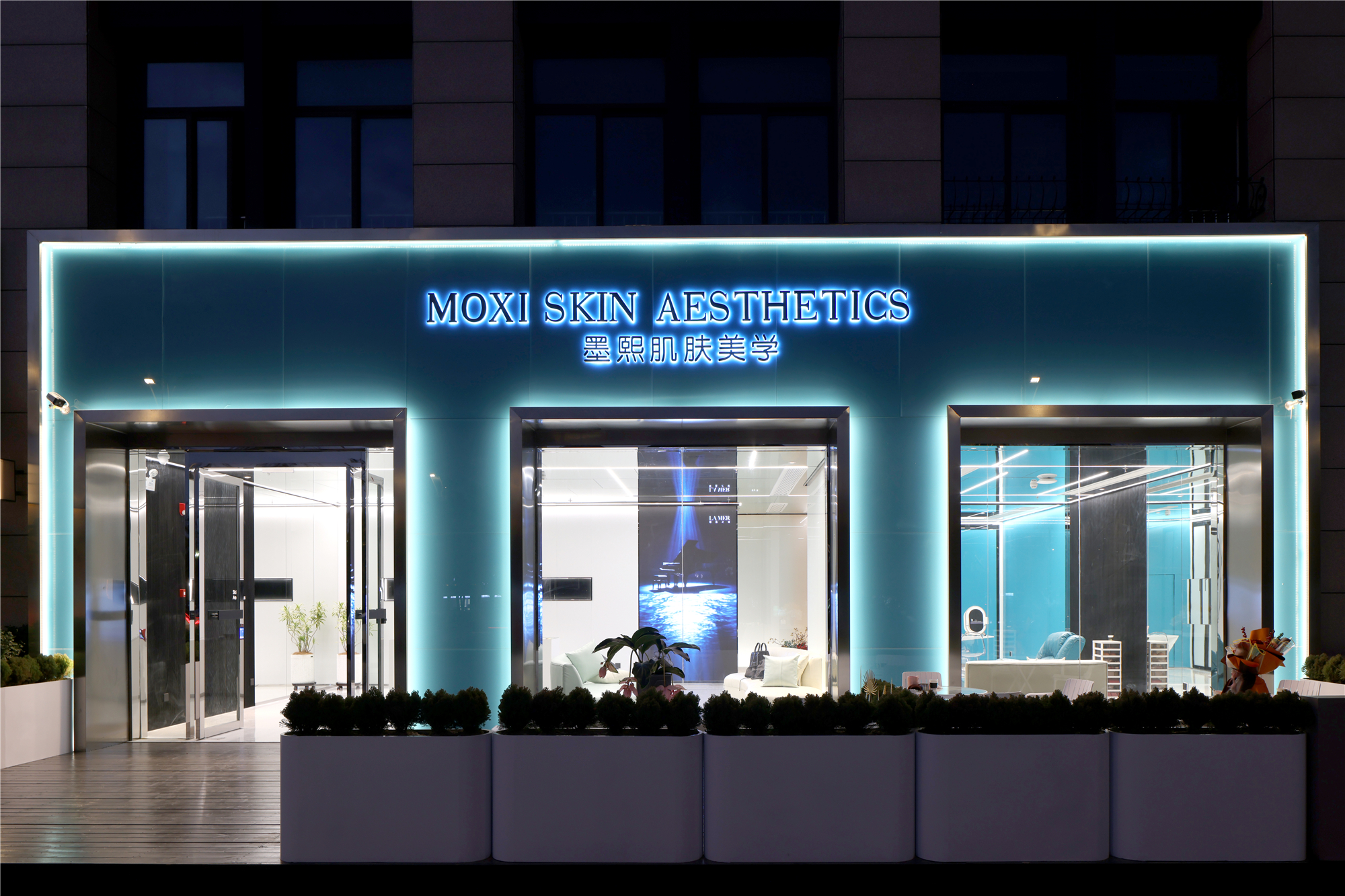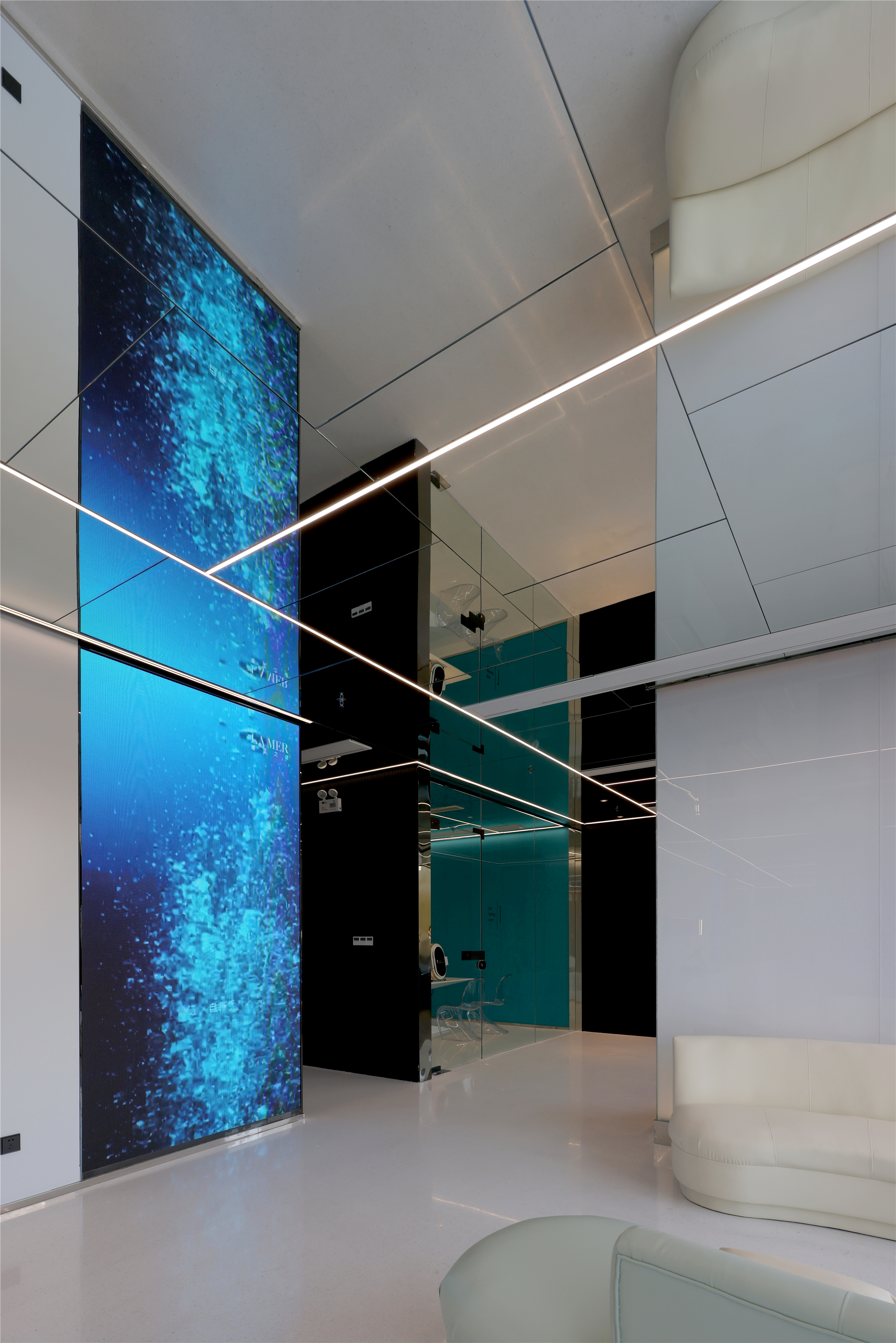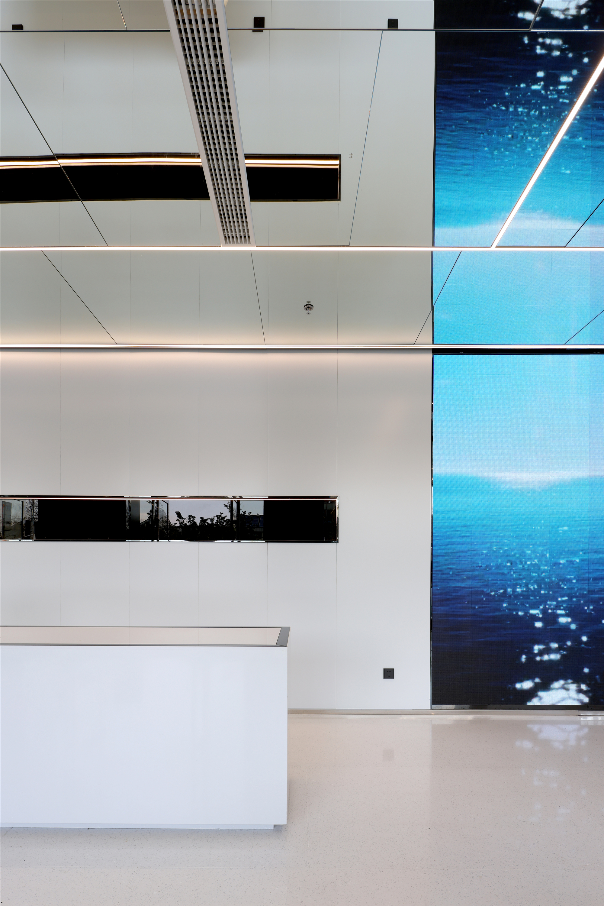 的铝板,呼应医美的洁净与细节。右边的到顶LED屏,随意的播放产品宣传,都会让整个空间更有活气。 -