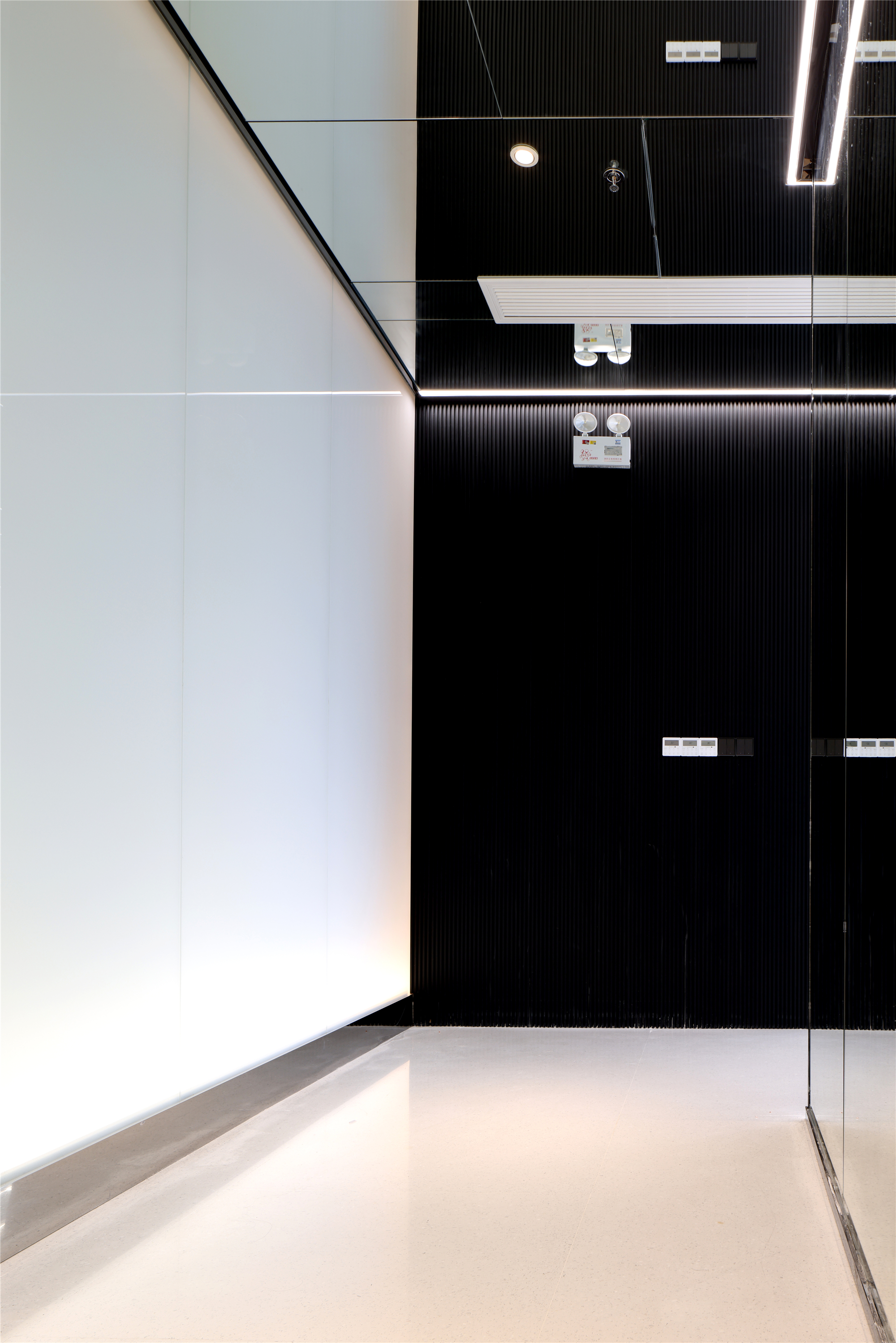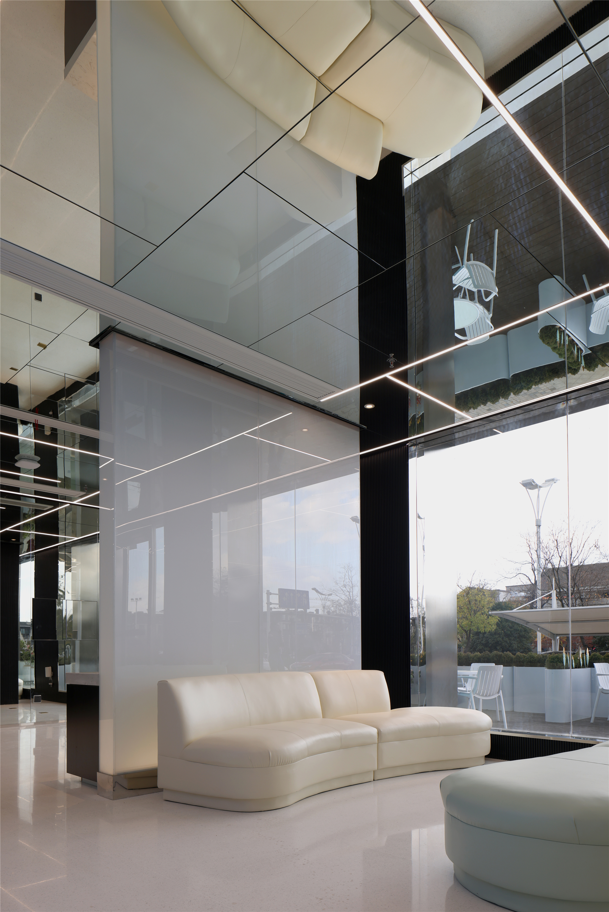 空间布局:进入大厅,顶面全部镜面处理,让原先不高的层高显得更高更广。顶面的线性灯带,让空间更具科技时尚感。左边墙上的黑色格栅板与镜面结合,彰显高端与品位。前台背景用了白色