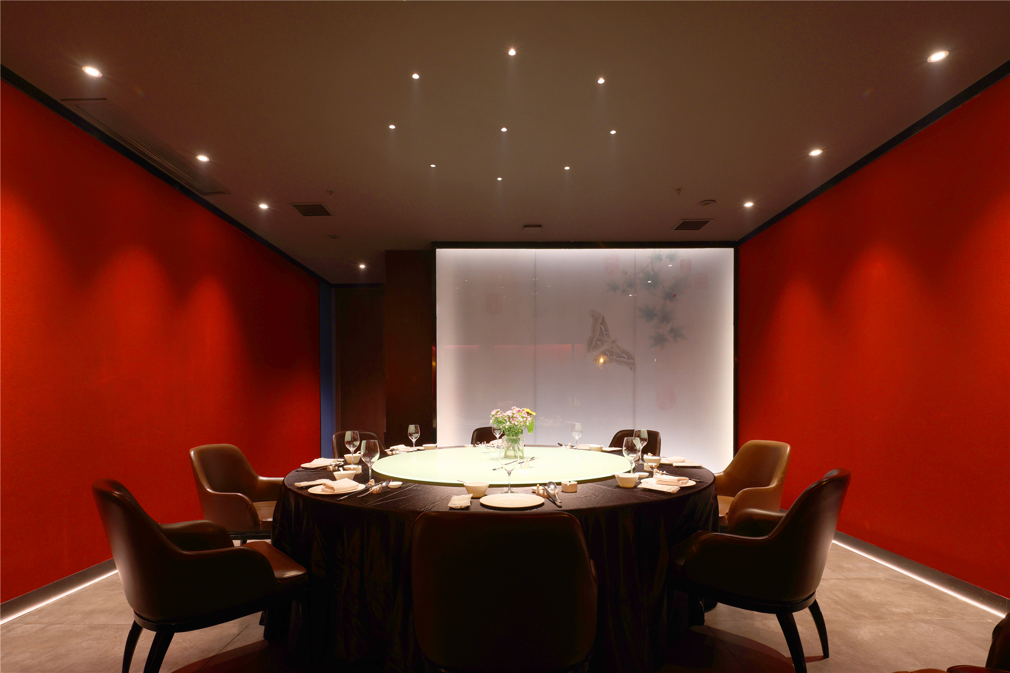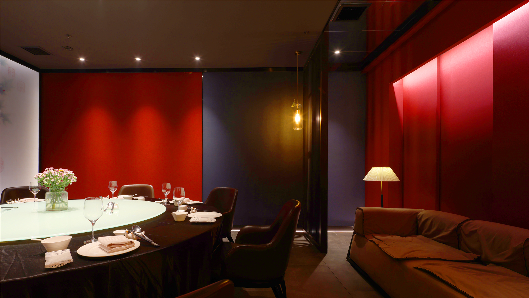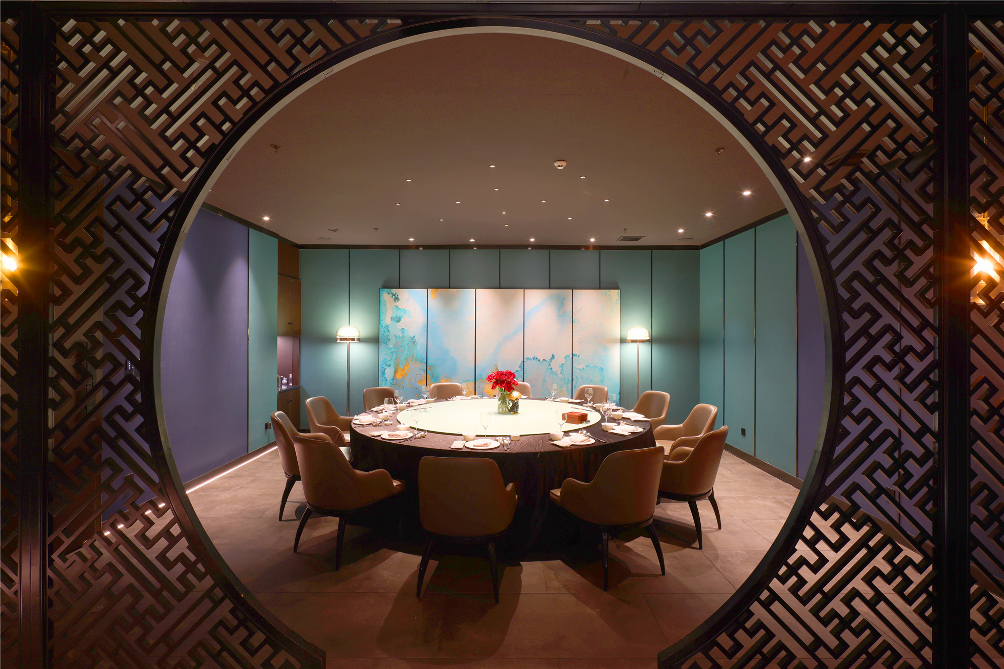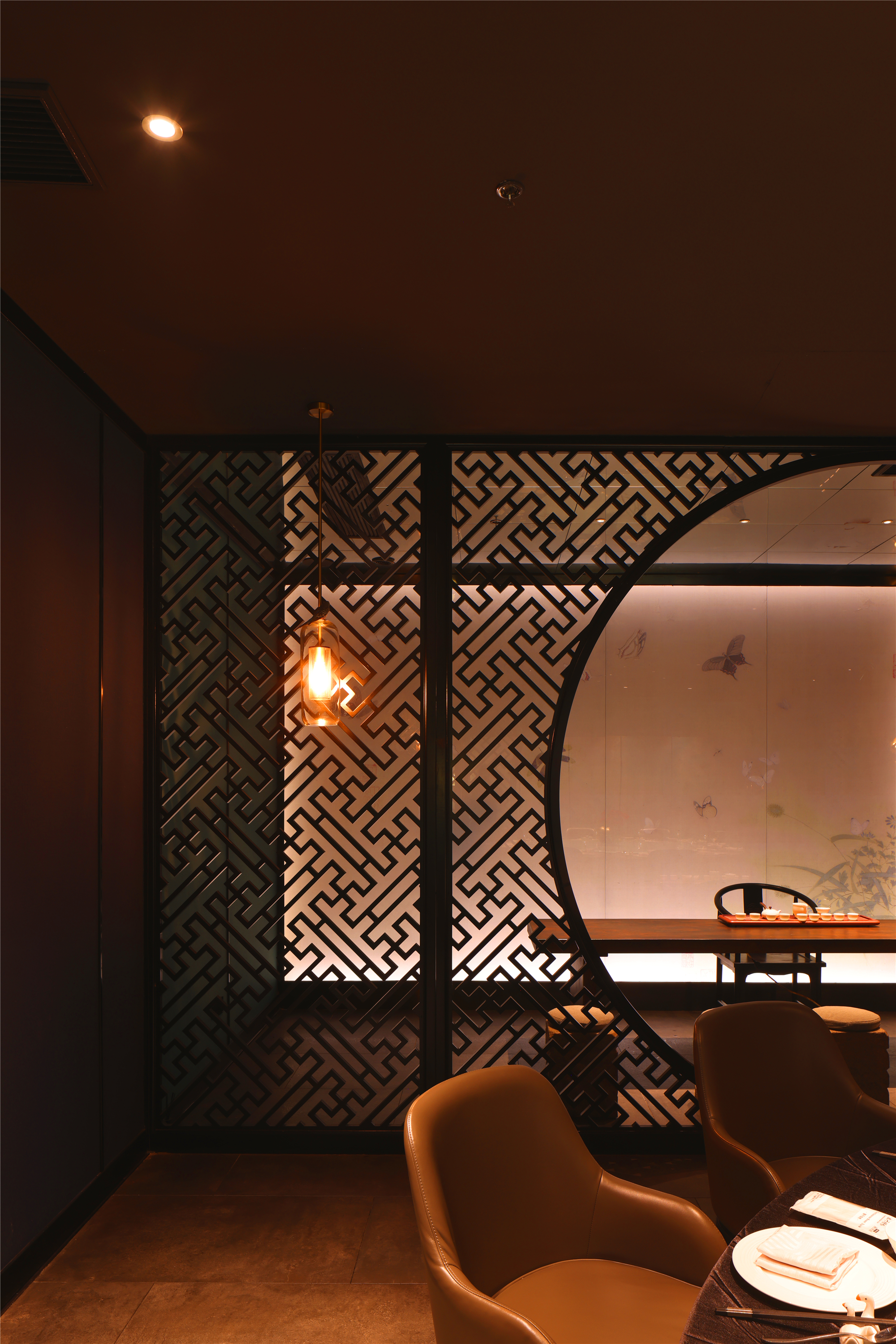 空间布局:区别于一般酒店包厢的富丽堂皇和明亮,我们刻意压暗了色调,让空间宁静雅致,灯光集中在餐桌中心,在就餐过程中形成一种烛光氛围,让菜品质感更好,通过智能化手段,餐厅灯光根据客人就餐的过程分区切换,让客人体验到一种被悉心款待的仪式感每个包厢都分成就餐和休闲2个功能区,特别是最大的包厢,更是具备了戏台的效果,休闲区可以品茶,鉴赏交流书画,扬州清曲評话弹词表演雅集,可以让闲雅懂生活的扬州人在享受美食的同时进行文化社交。