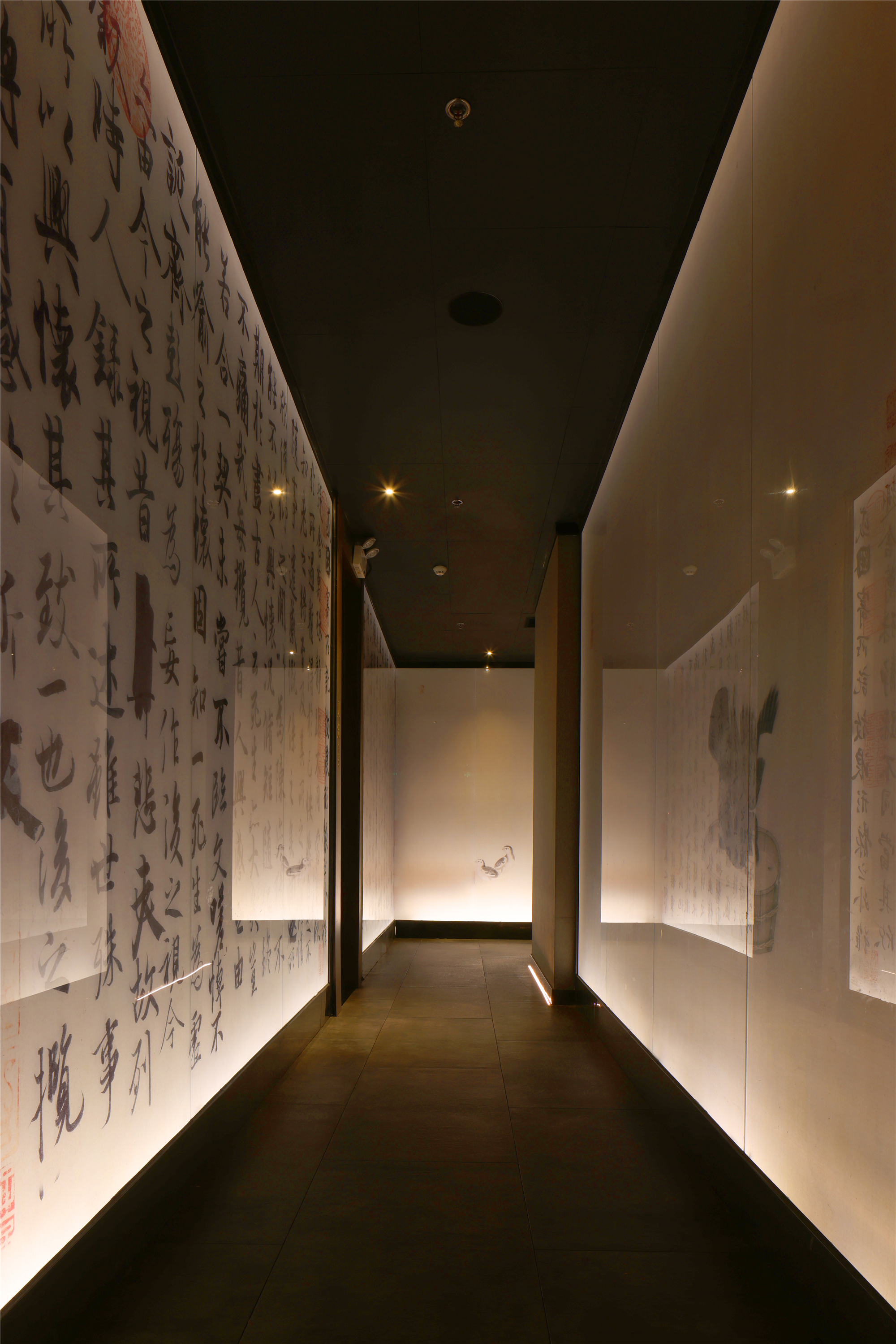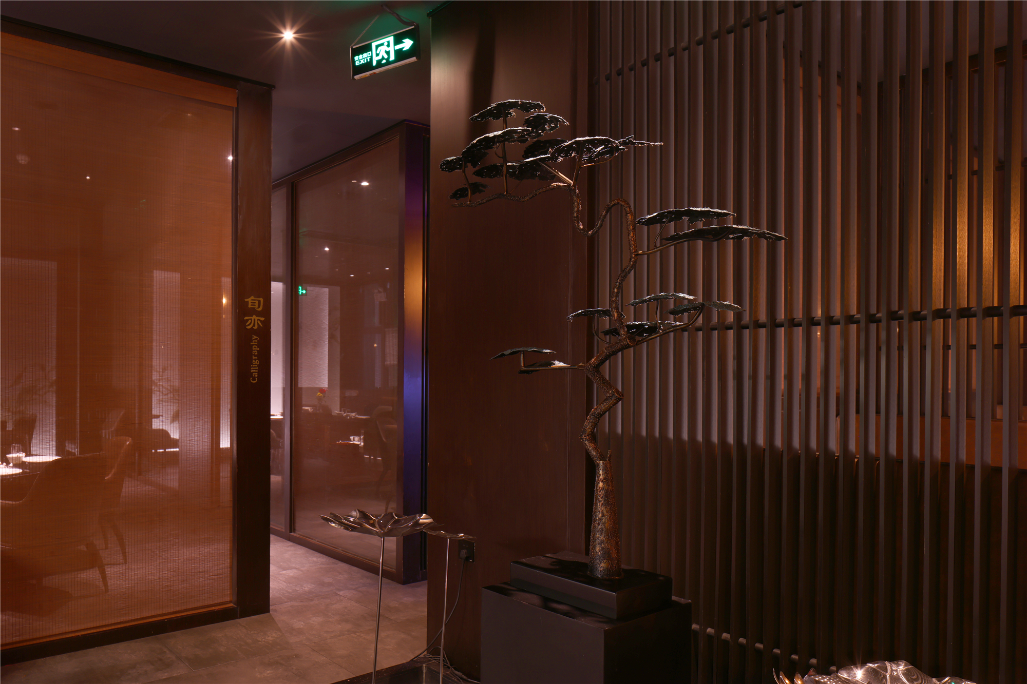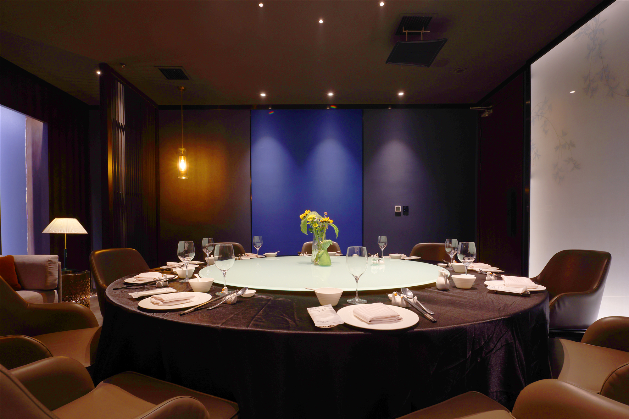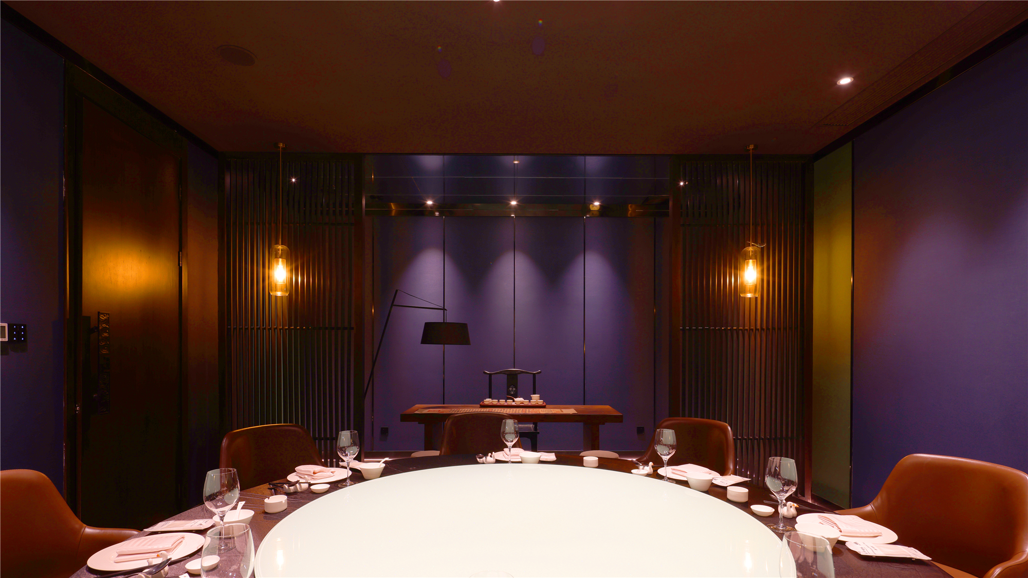 空间布局:区别于一般酒店包厢的富丽堂皇和明亮,我们刻意压暗了色调,让空间宁静雅致,灯光集中在餐桌中心,在就餐过程中形成一种烛光氛围,让菜品质感更好,通过智能化手段,餐厅灯光根据客人就餐的过程分区切换,让客人体验到一种被悉心款待的仪式感每个包厢都分成就餐和休闲2个功能区,特别是最大的包厢,更是具备了戏台的效果,休闲区可以品茶,鉴赏交流书画,扬州清曲評话弹词表演雅集,可以让闲雅懂生活的扬州人在享受美食的同时进行文化社交。