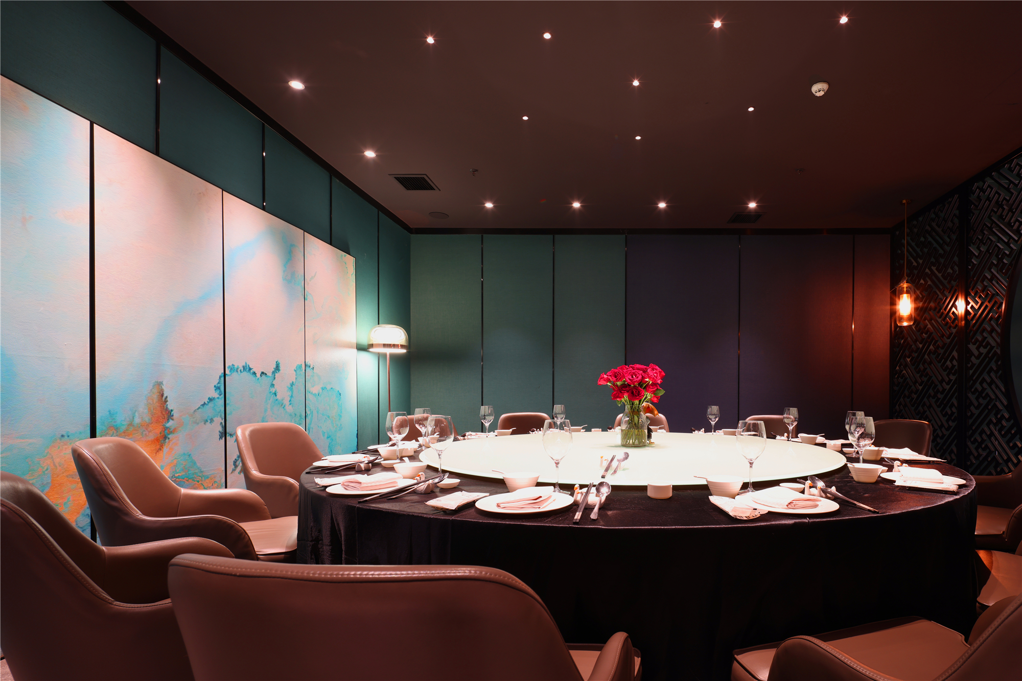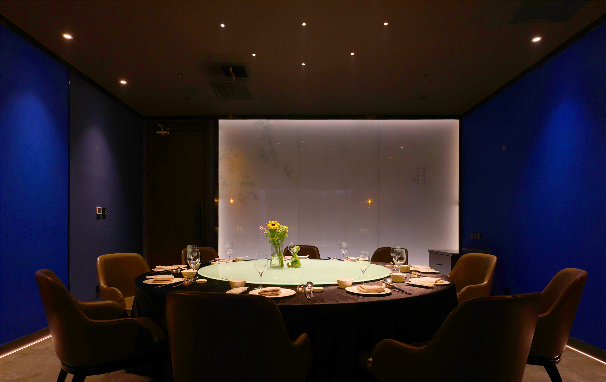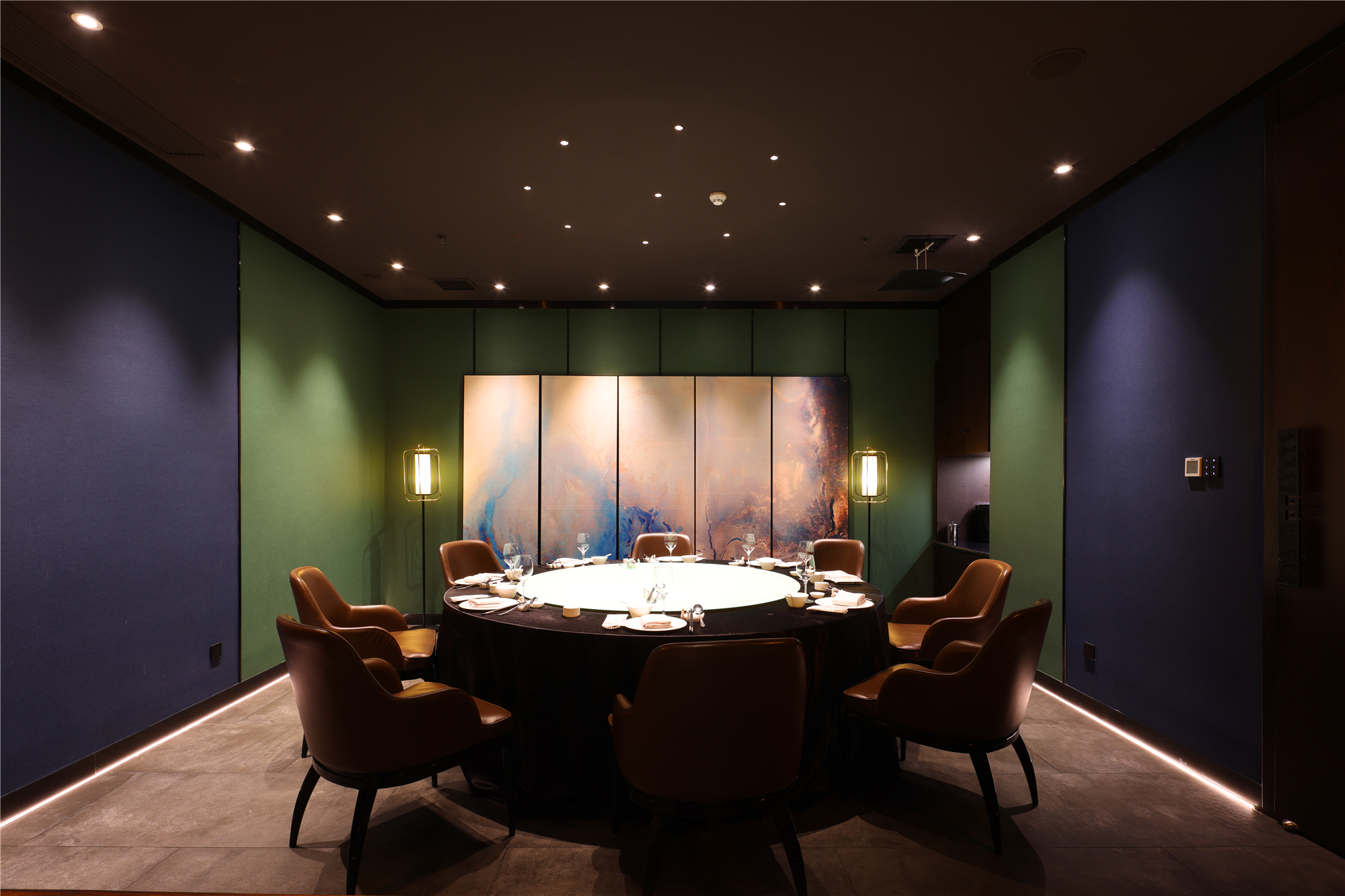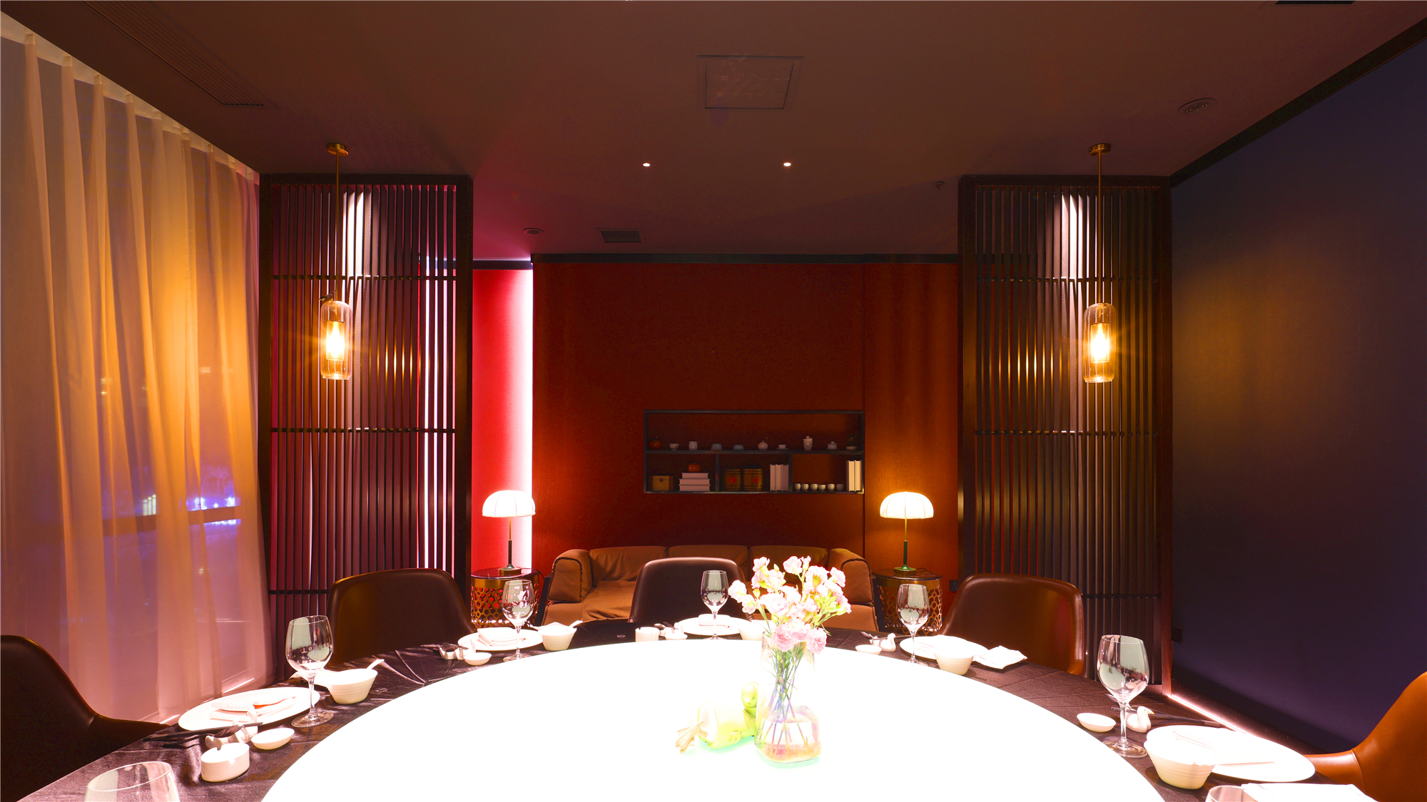空间布局:区别于一般酒店包厢的富丽堂皇和明亮,我们刻意压暗了色调,让空间宁静雅致,灯光集中在餐桌中心,在就餐过程中形成一种烛光氛围,让菜品质感更好,通过智能化手段,餐厅灯光根据客人就餐的过程分区切换,让客人体验到一种被悉心款待的仪式感每个包厢都分成就餐和休闲2个功能区,特别是最大的包厢,更是具备了戏台的效果,休闲区可以品茶,鉴赏交流书画,扬州清曲評话弹词表演雅集,可以让闲雅懂生活的扬州人在享受美食的同时进行文化社交。