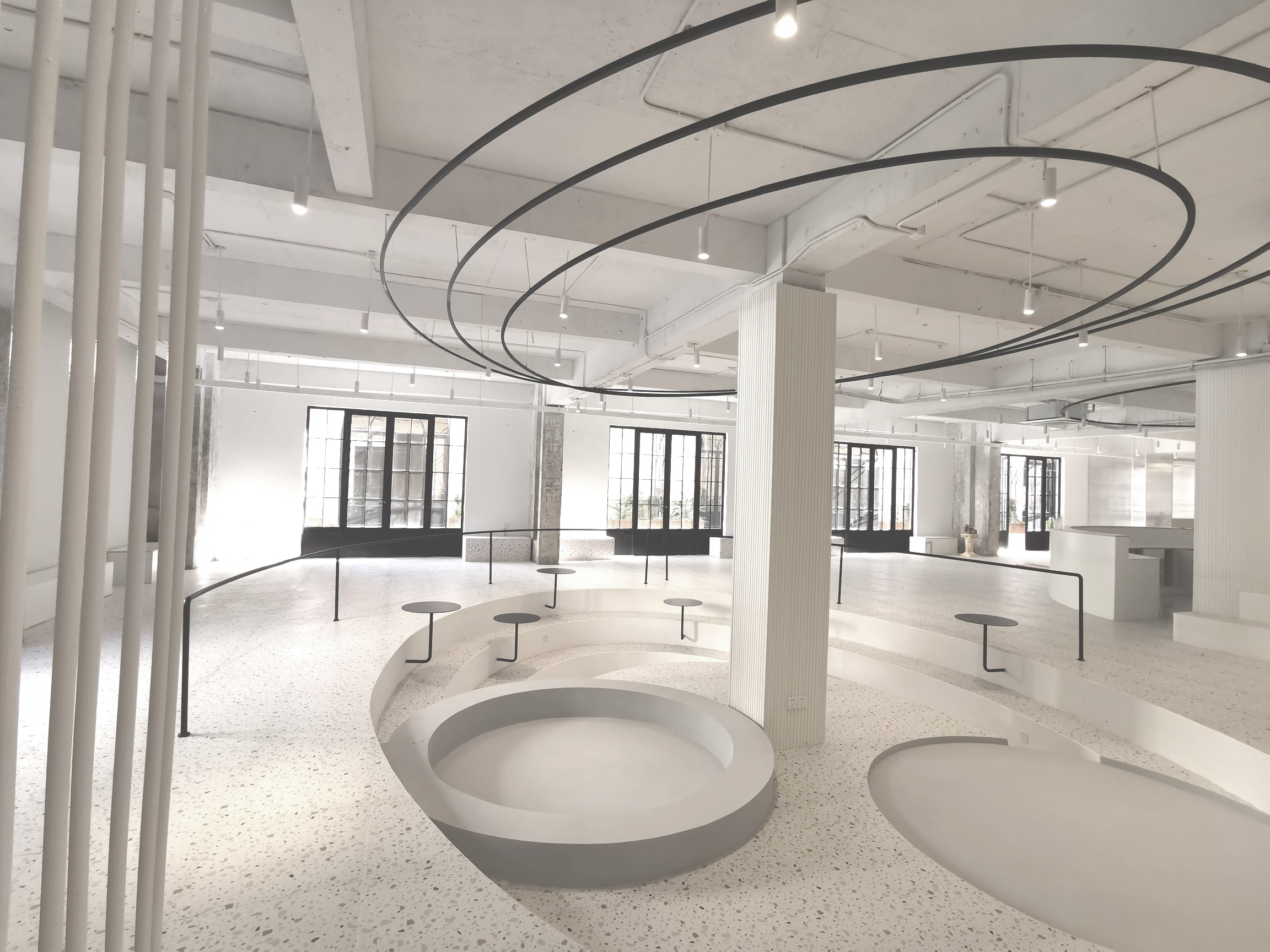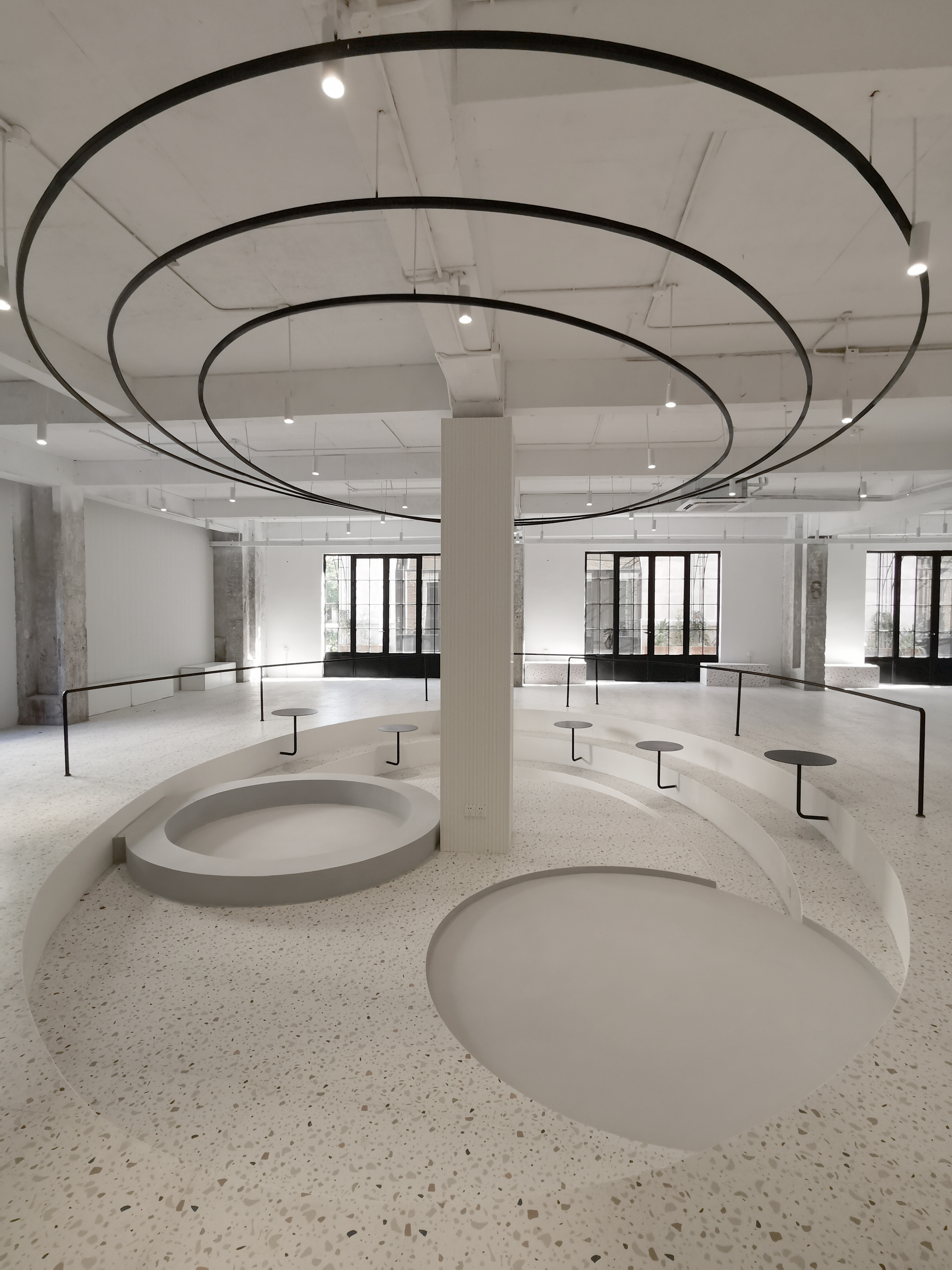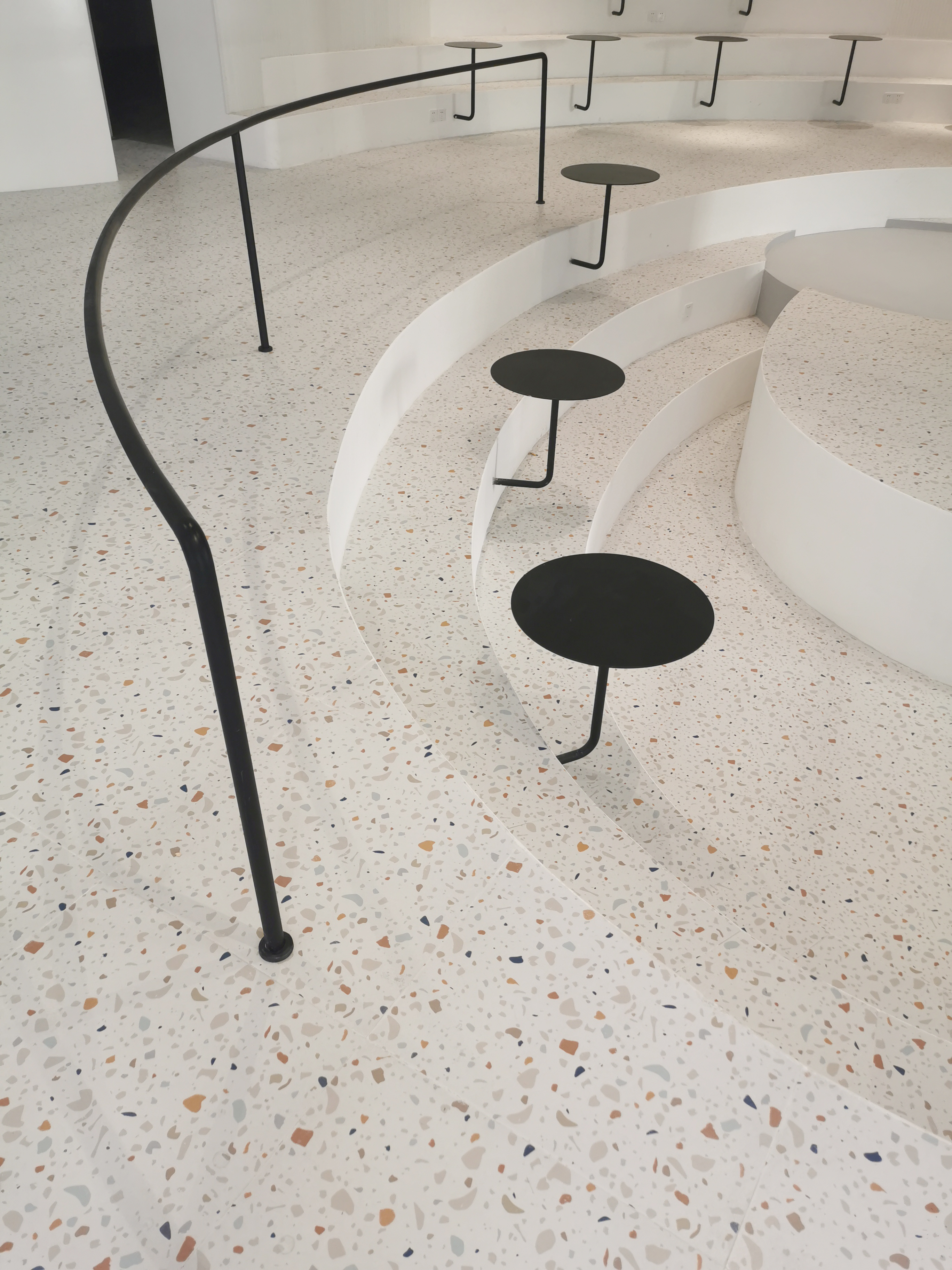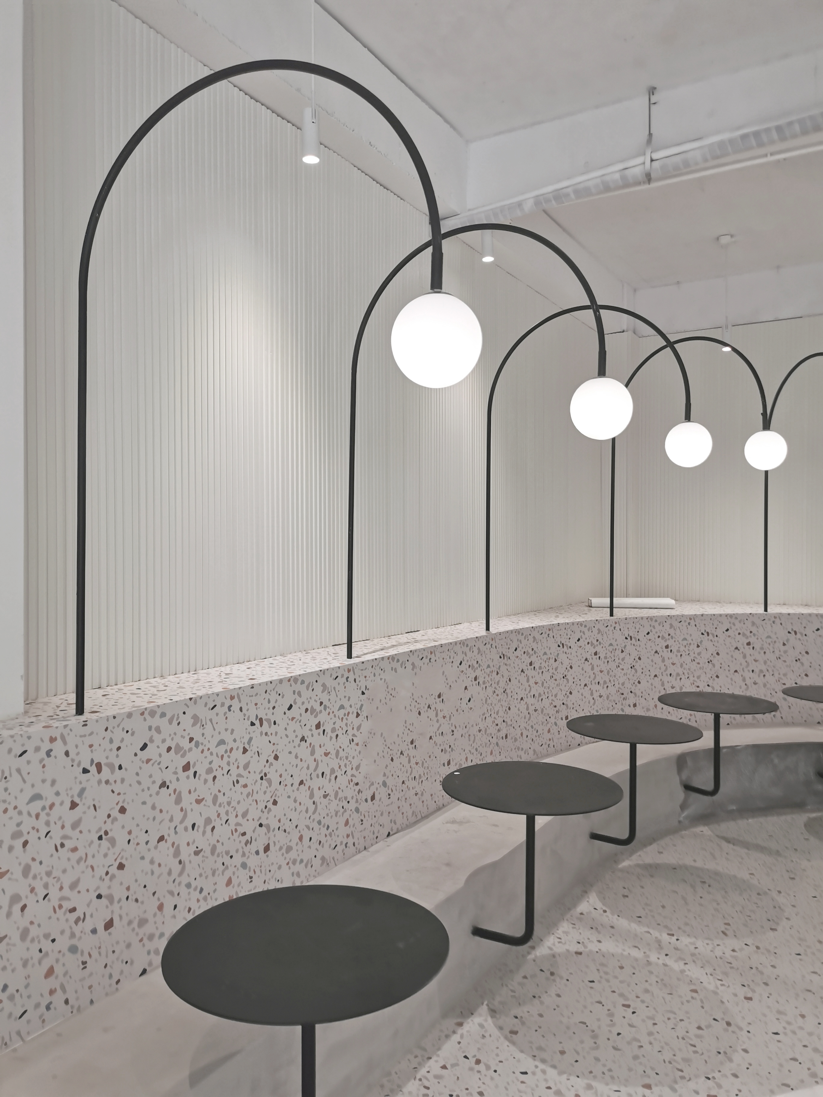 黑色圆管以曲线的方式,如同画笔在空间中流动,以灯具,护栏,台面等不同形式呈现。