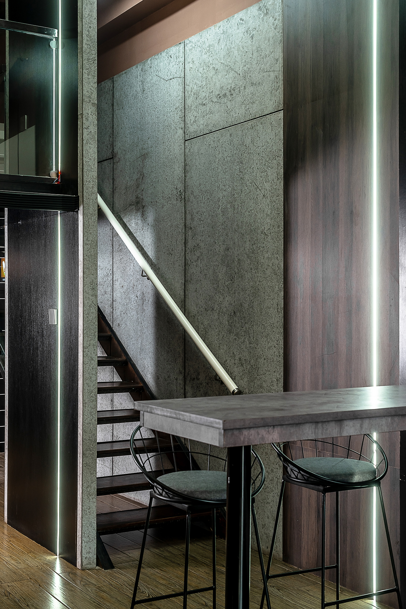 设计选材:以黑色木饰面来压住整体空间,再以灰色美岩板保证黑色木饰面的完美过度,大面积的白色减少深色所造成的压抑感,以线性灯、暖色乳胶漆和浅色木饰面增强空间的整体柔和度。