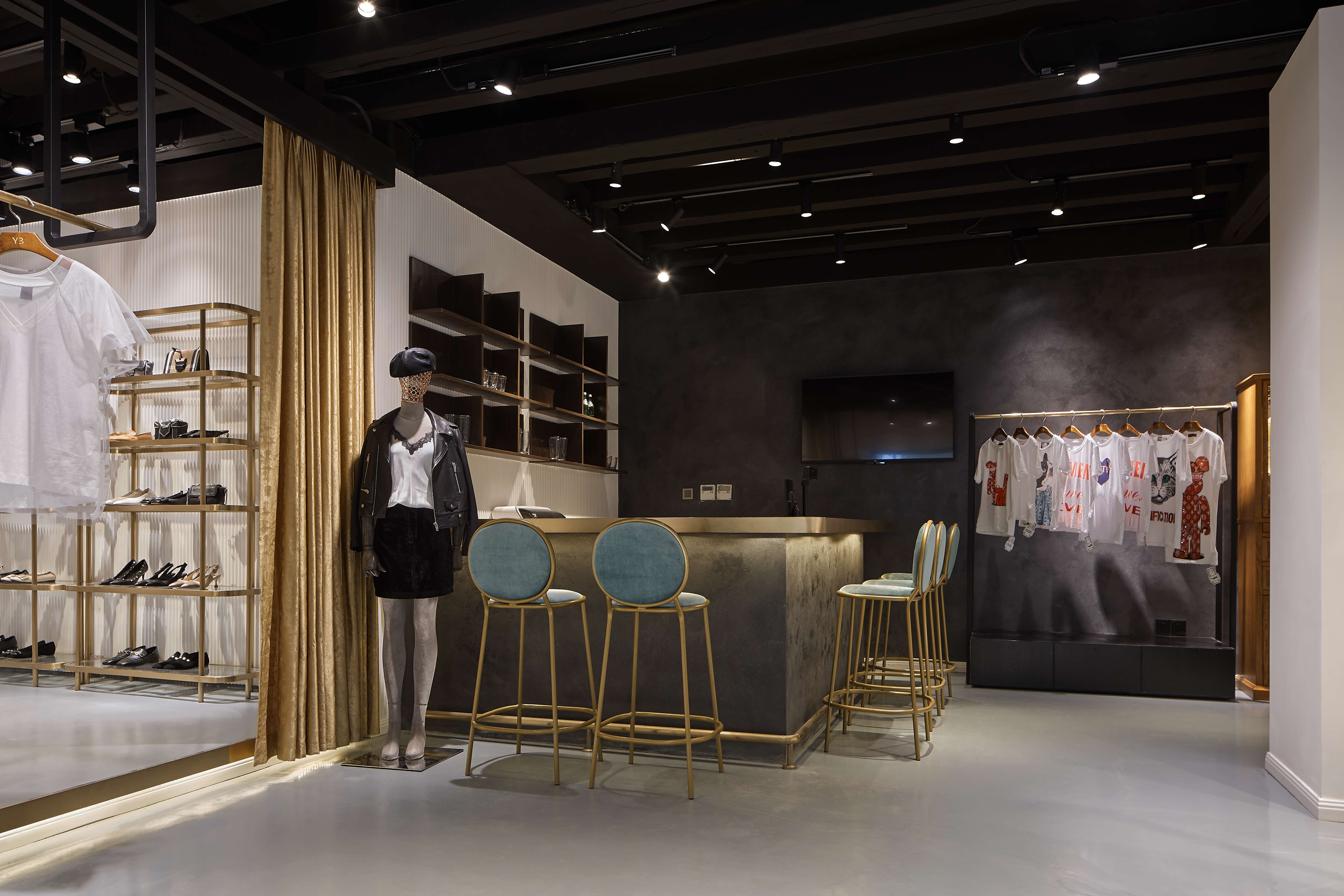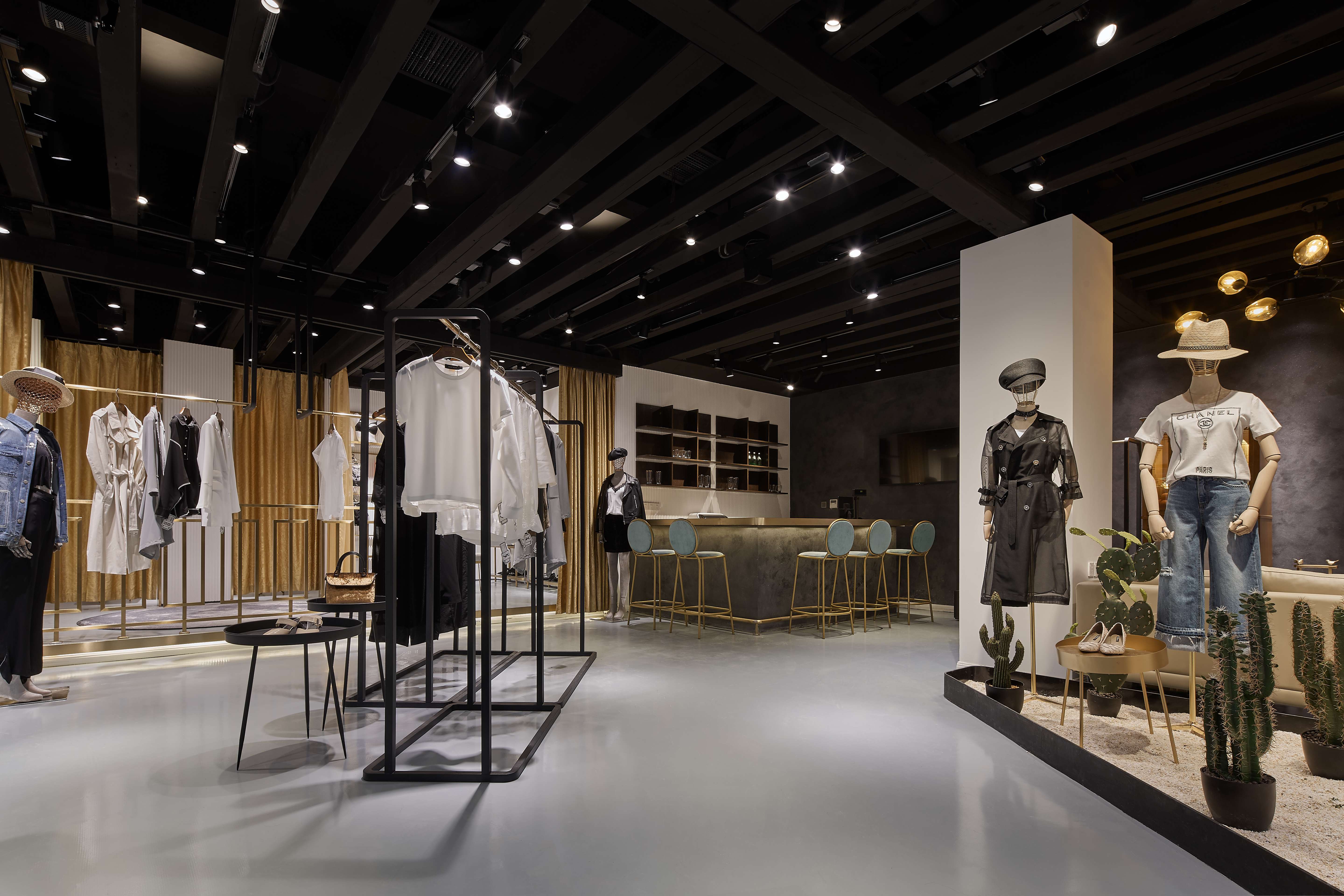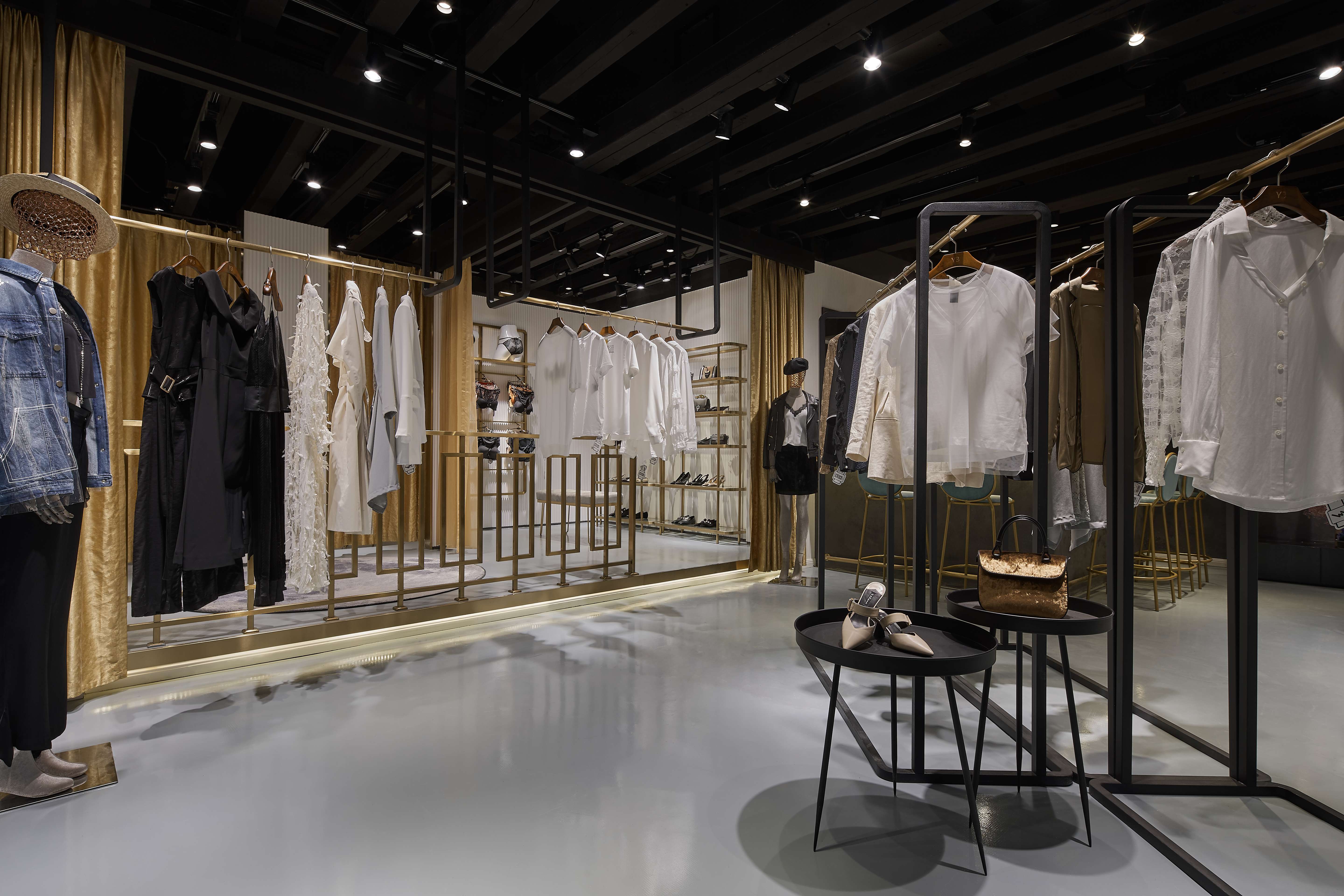 空间意境:混搭的购物空间承托了服饰本身的时尚与创新,也为顾客带来了一次轻松愉悦的购物体验,将不同风格的服饰有序排列。透过角度、结构和材质之间的碰撞,组合成具有品质感的购物空间。