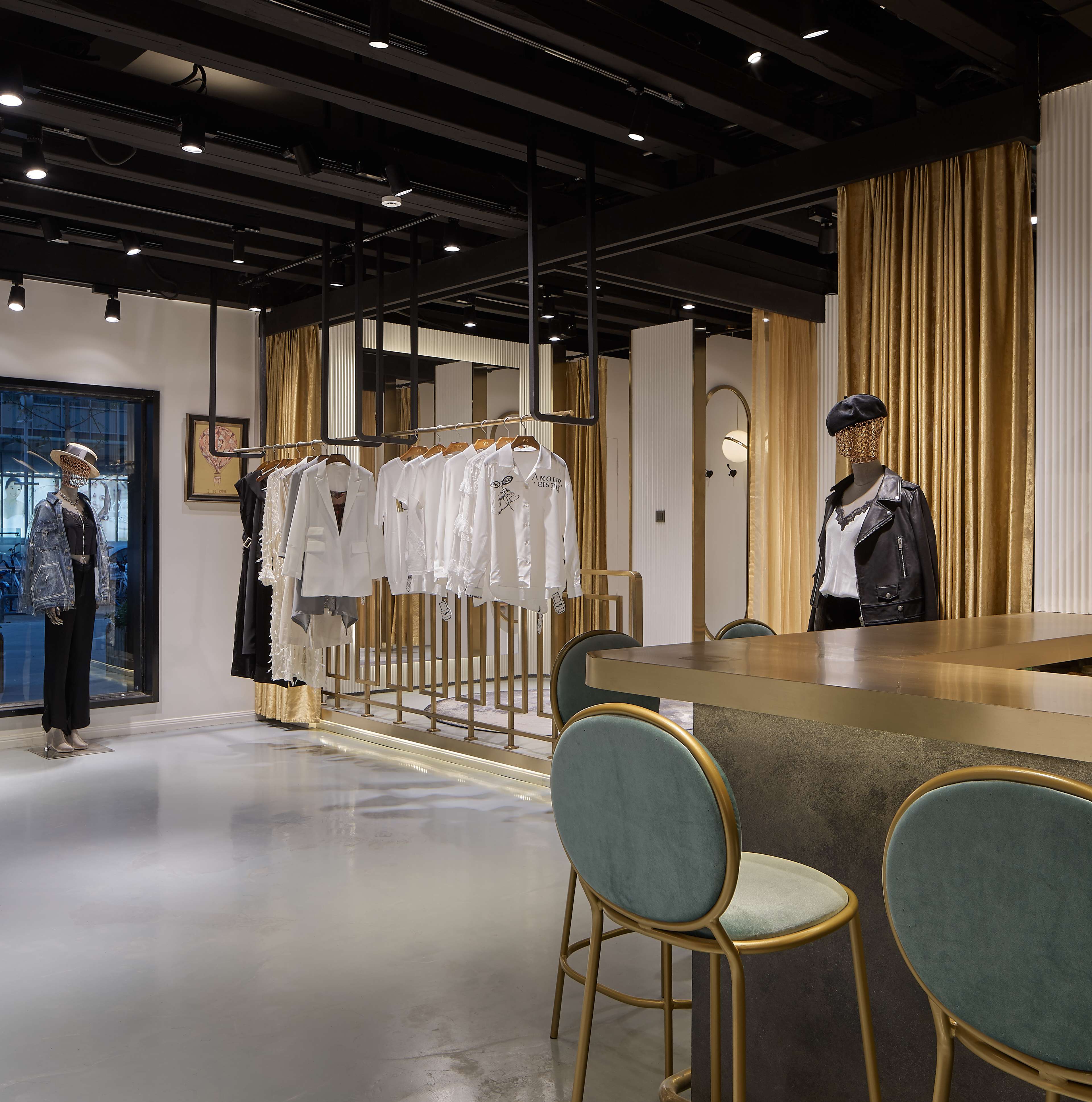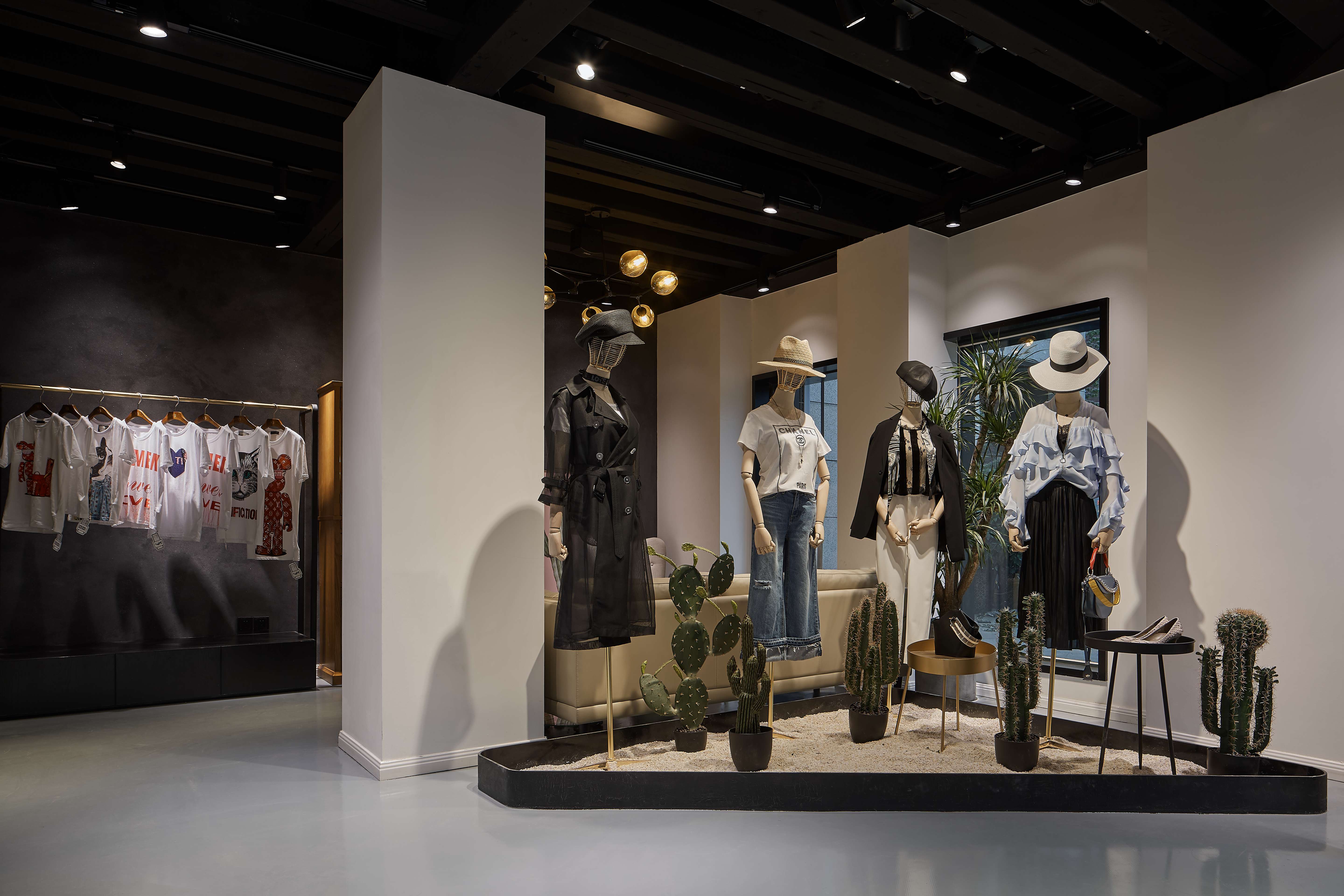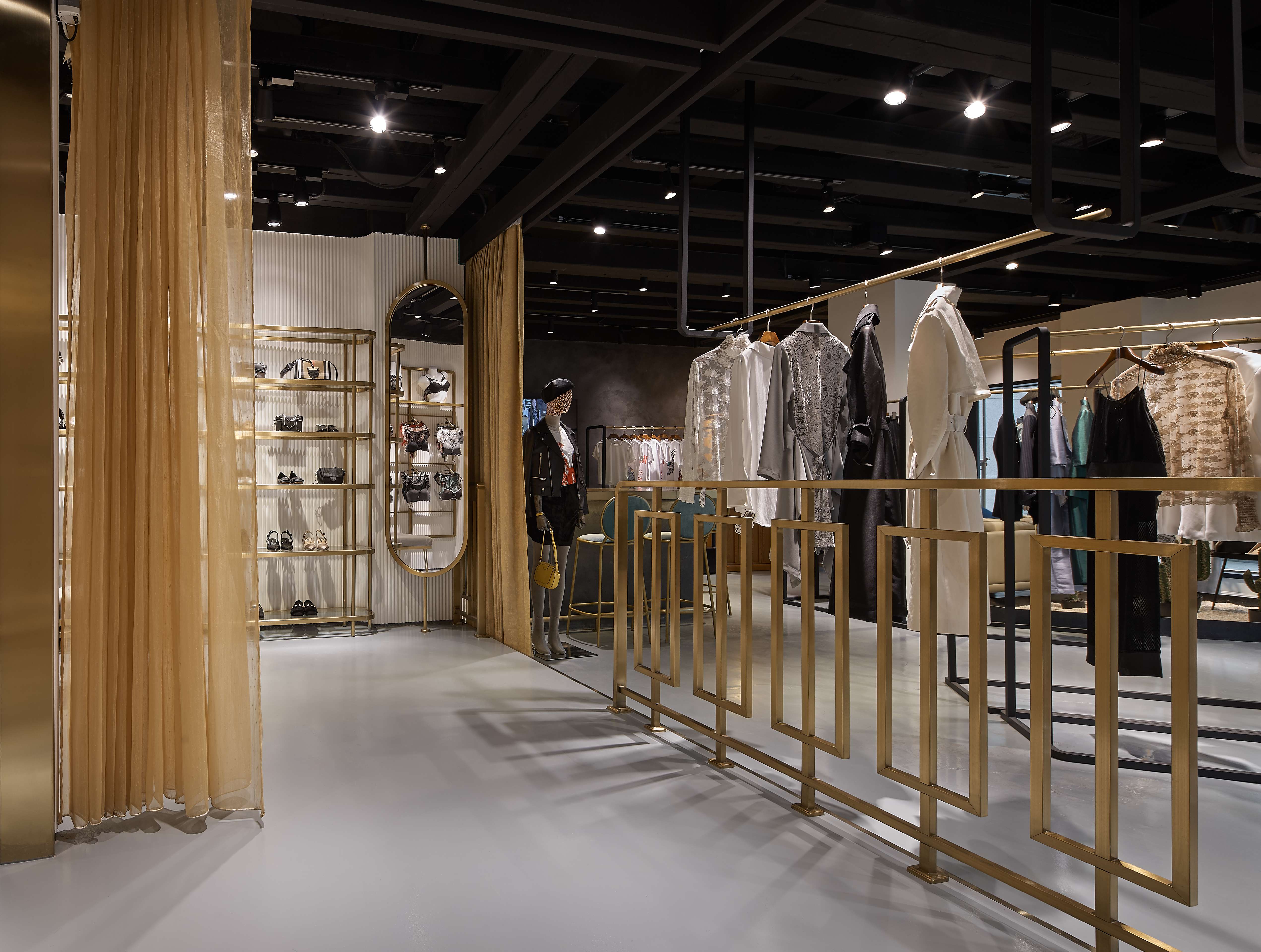 空间意境:混搭的购物空间承托了服饰本身的时尚与创新,也为顾客带来了一次轻松愉悦的购物体验,将不同风格的服饰有序排列。透过角度、结构和材质之间的碰撞,组合成具有品质感的购物空间。