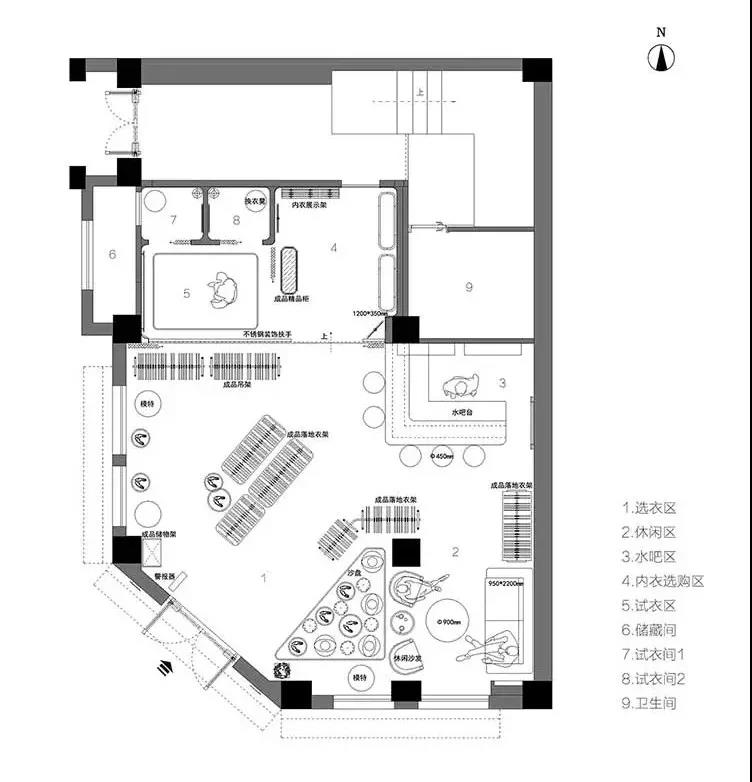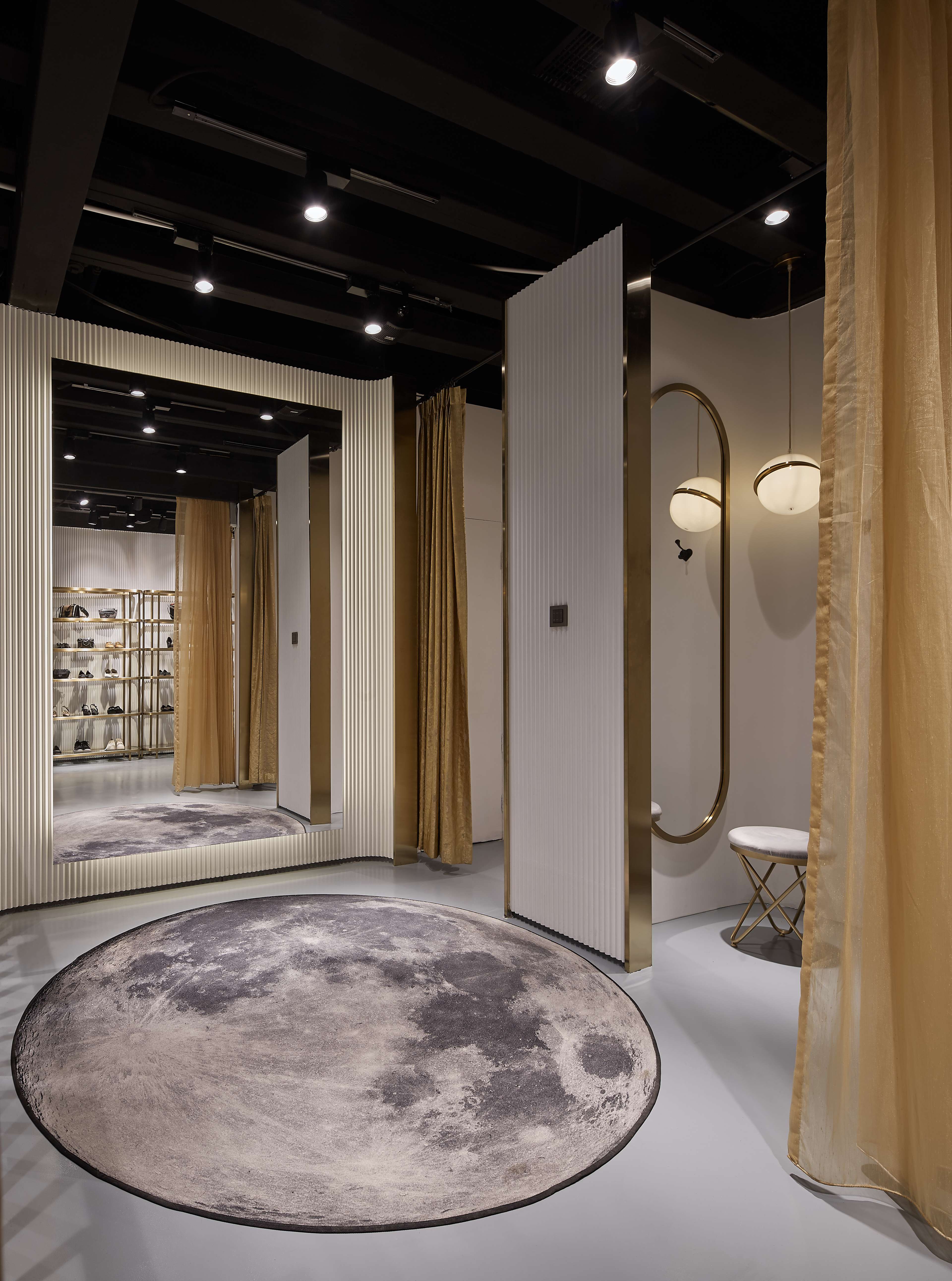 空间布局:总以为这样的珍贵,需要一个明亮透顶的环境来映衬它,但光芒太足反而被湮没其中。灰暗里的一丝丝光就足以让它绽放,成为周围唯一的闪耀。透过角度、结构和材质之间的碰撞,组合成具有品质感的购物空间。