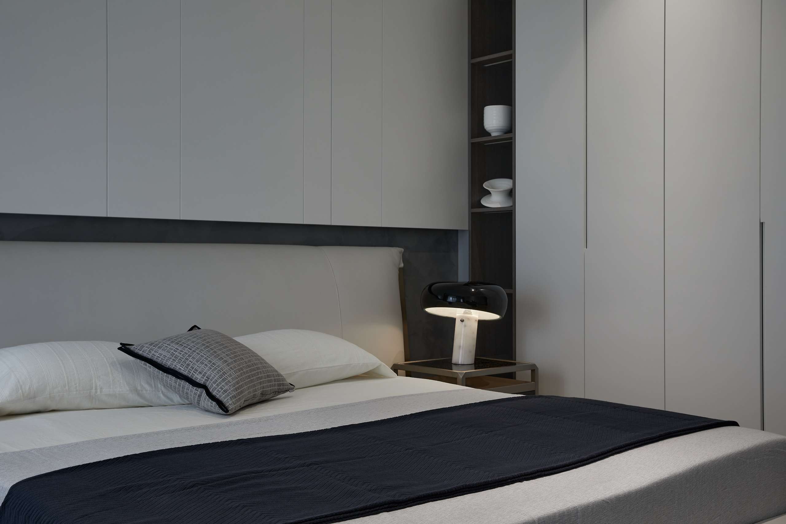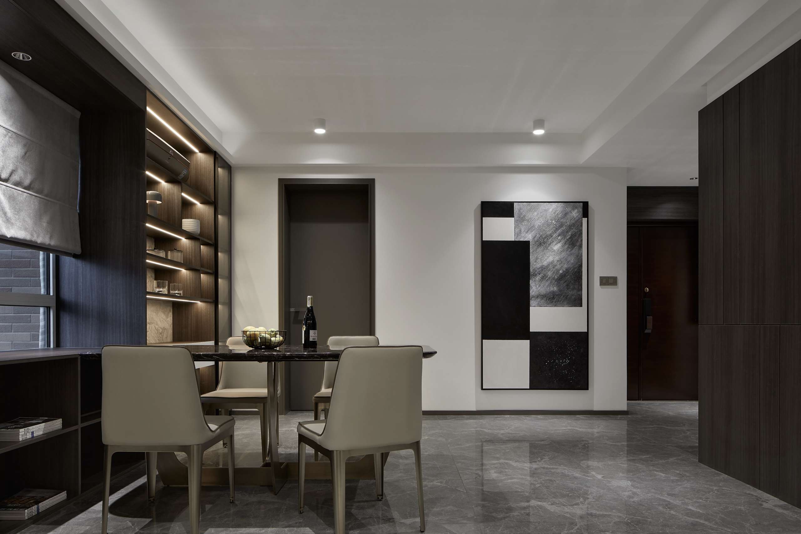 空间意境:拆除横亘在餐厅和多功能区的隔墙后,拆改后的空间使用起来更加合理,且增加了其纵深感,视觉感受得到了明显改善。整面的餐边柜为其提供了强大的收纳能力,低柜增加了餐桌的实际使用面积,深色木质柜体及大理石材的运用与客厅基调呼应。原结构中南边的整面墙体被拆除,次卧室面积得以大大增加。在满足其睡眠、阅读的需求基础上又增加了休闲区域。整个空间大量运用了木质增加其温暖自然的氛围,深色家具的存在使空间具有了沉淀感,而对于氛围光的克制使用给了空间恰到好处的静谧。