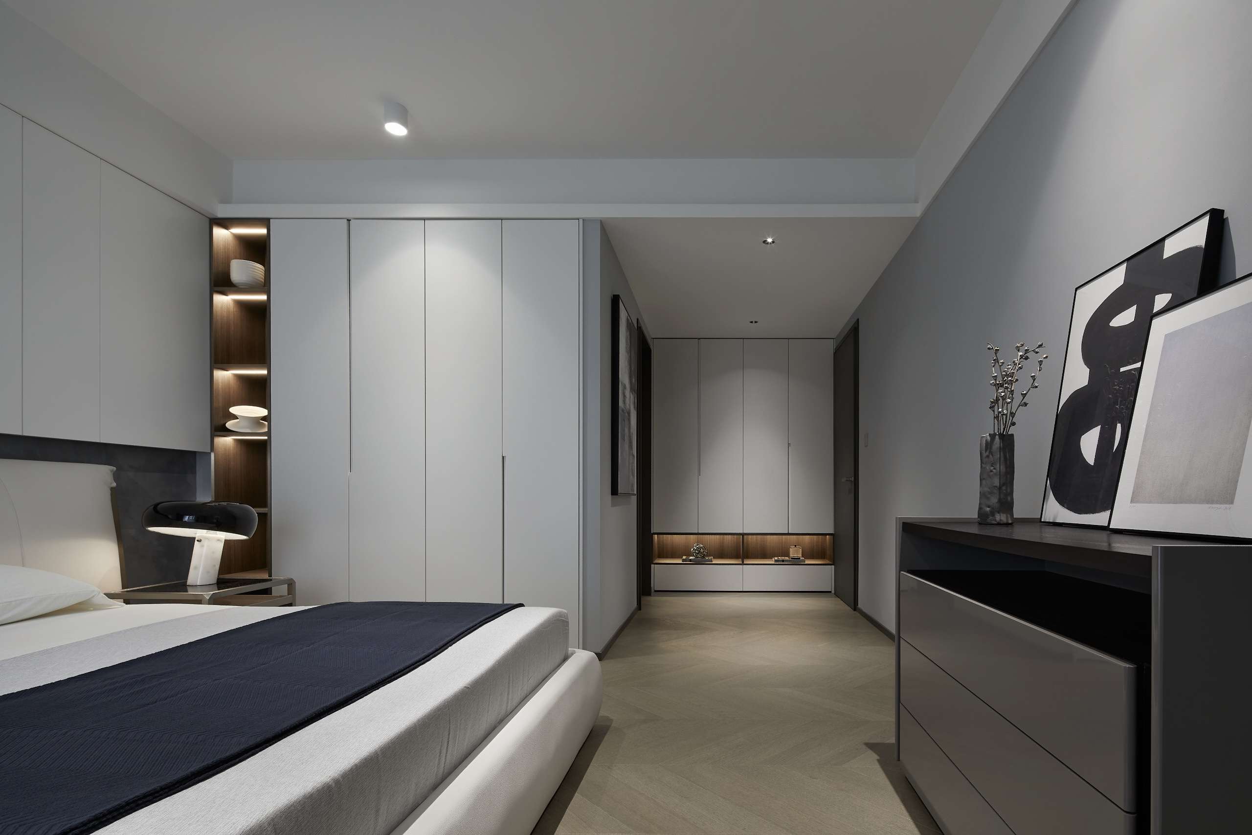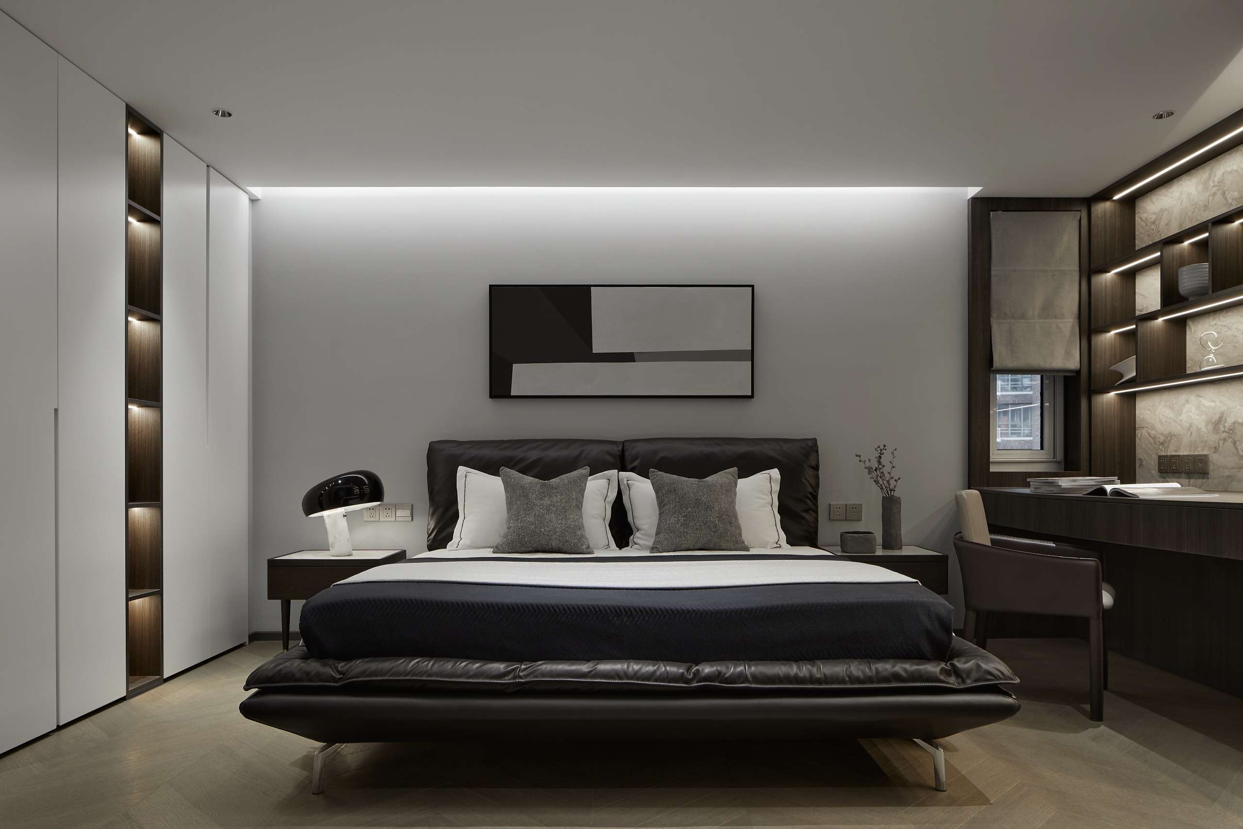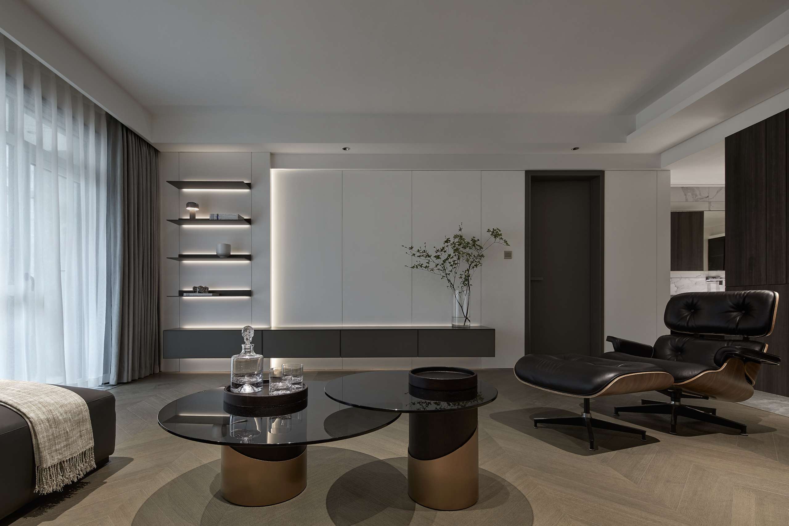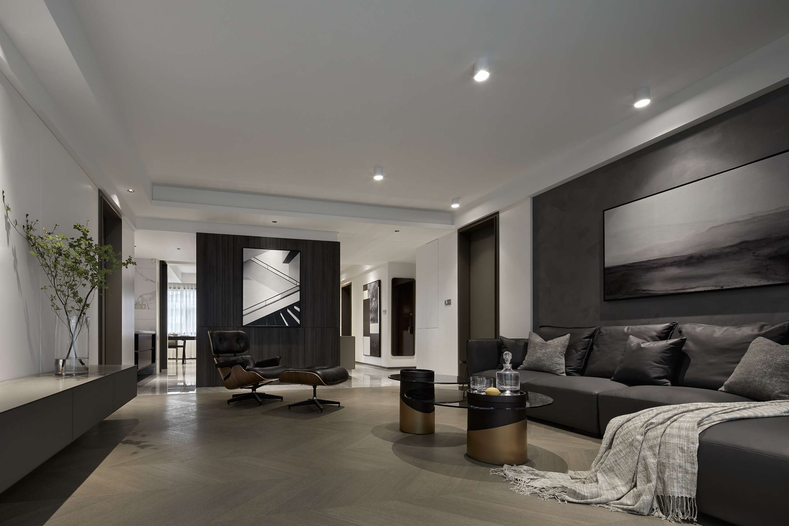 项目定位:以深色为主色调,给予空间沉静感,大面积的深色运用中保留顶面及部分立面的浅色,平衡空间不致阴暗。地面以原木色地板的人字拼贴方式延伸空间,玻璃和金属的加入提升了其精致感。而在光环境方面,取消了传统主光源的照明方式,采用氛围灯烘托出空间的沉稳质感。