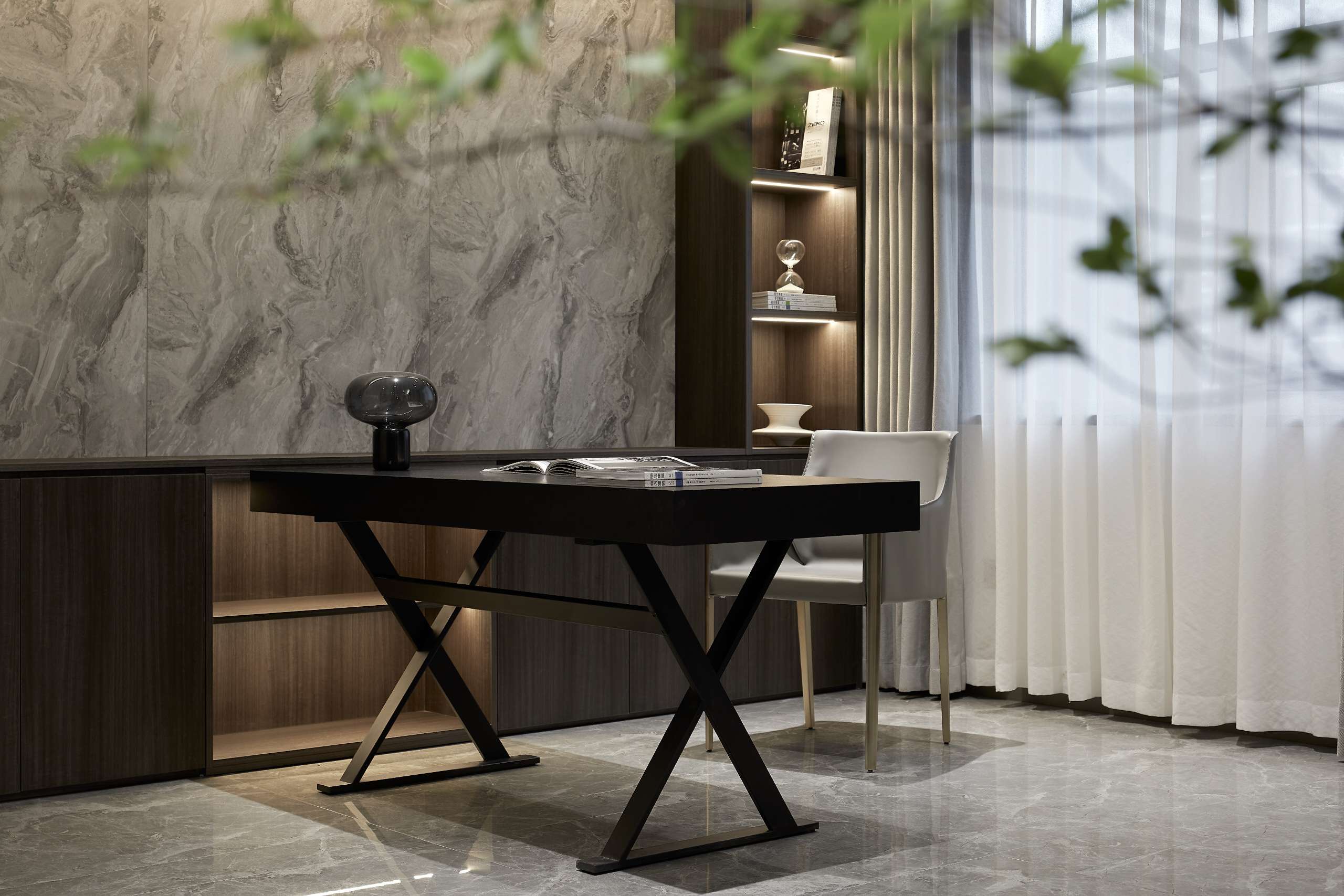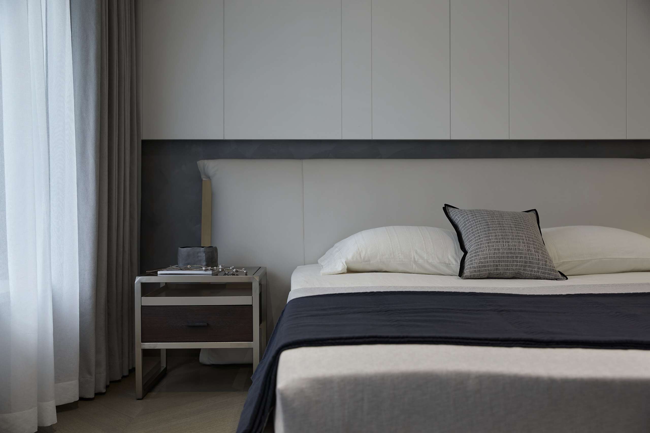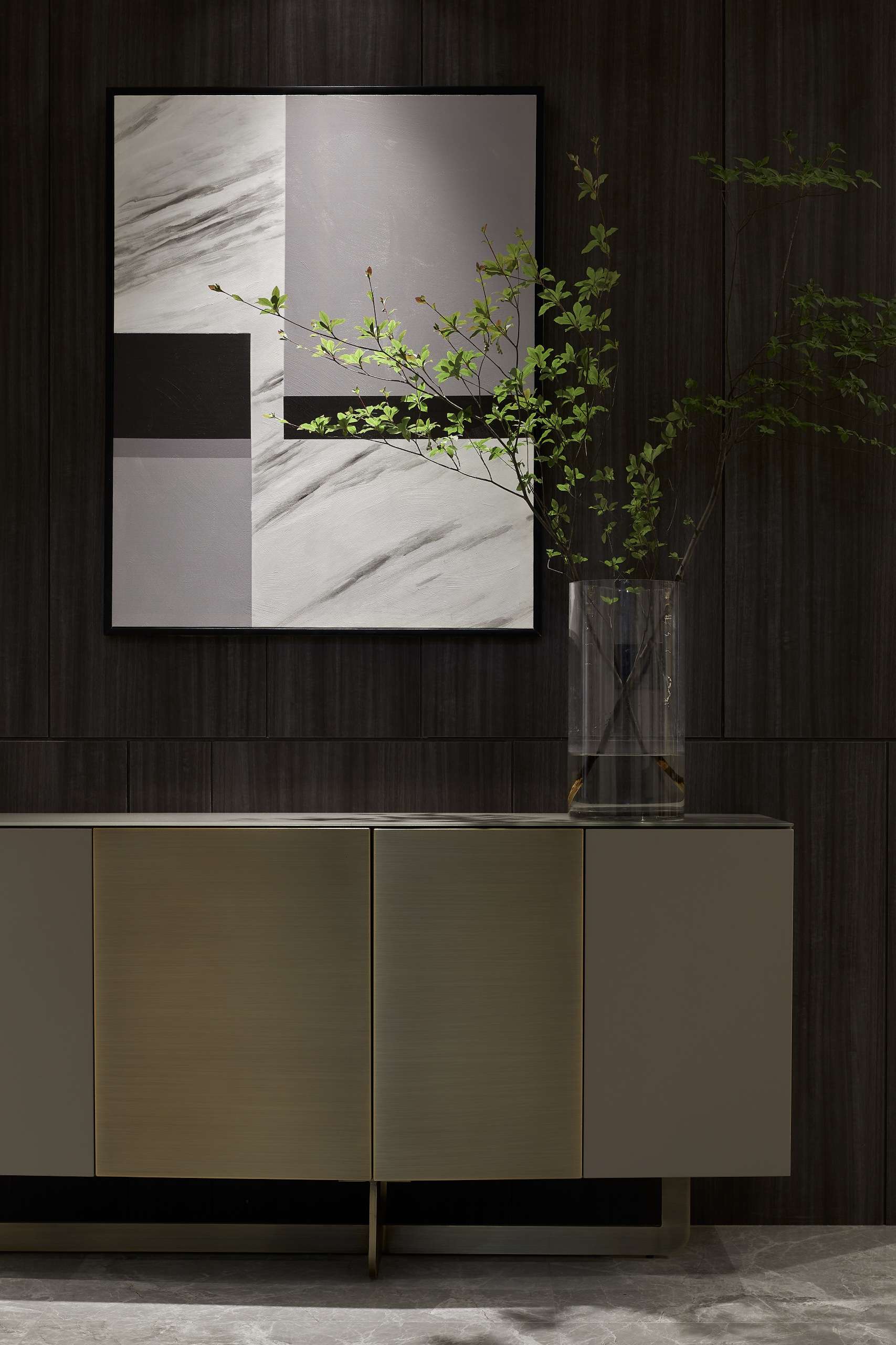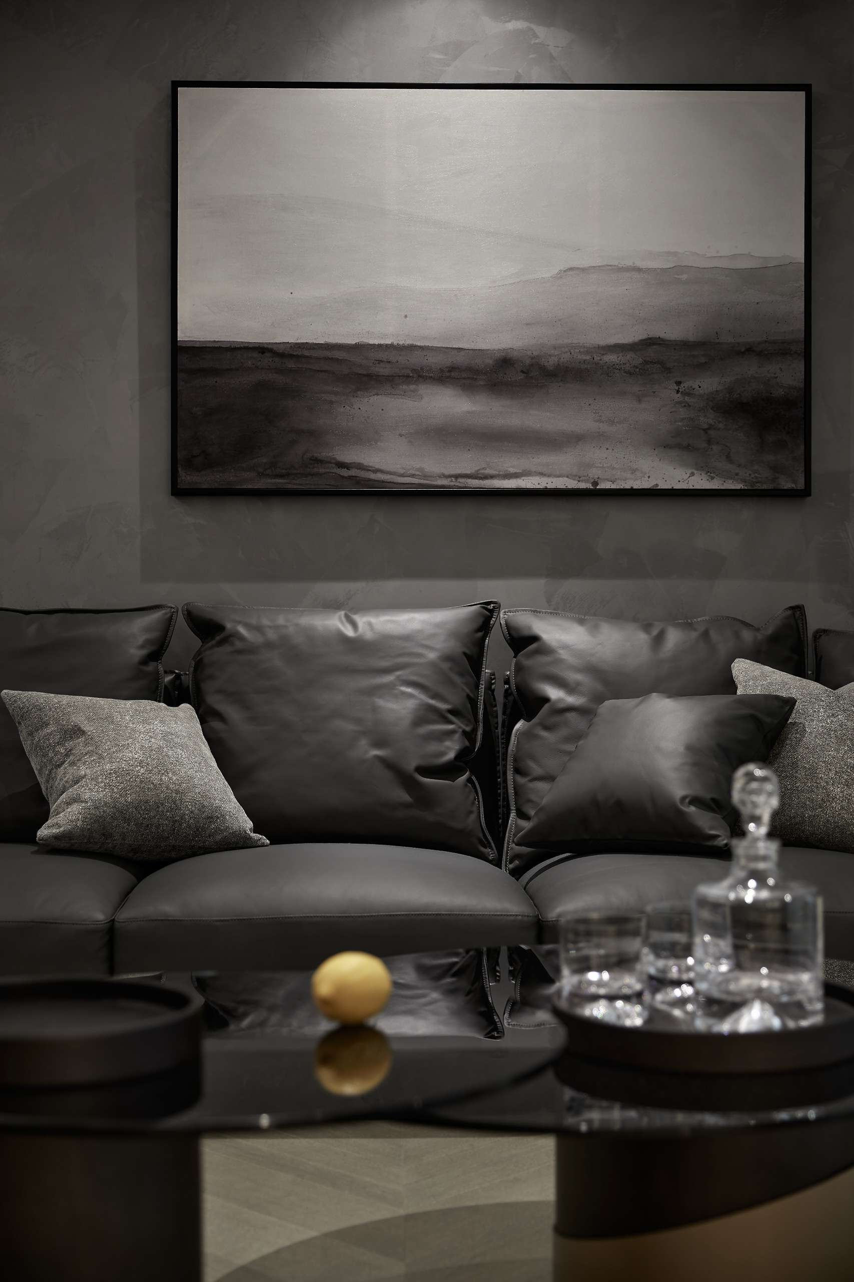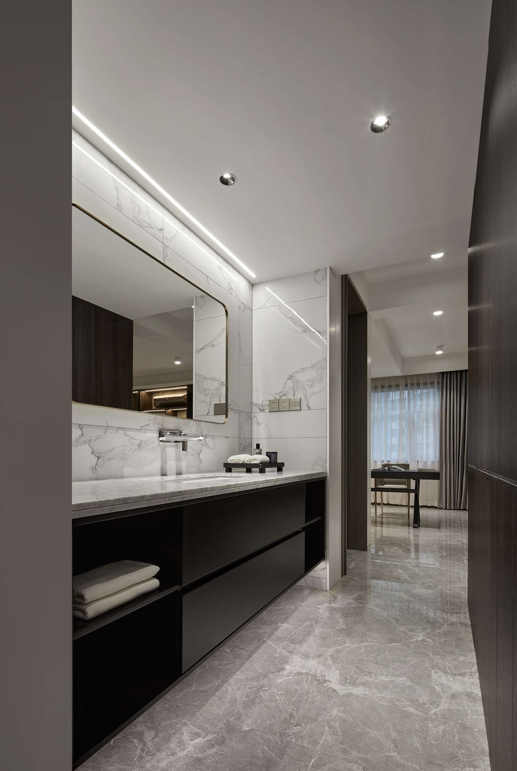 项目定位:以深色为主色调,给予空间沉静感,大面积的深色运用中保留顶面及部分立面的浅色,平衡空间不致阴暗。地面以原木色地板的人字拼贴方式延伸空间,玻璃和金属的加入提升了其精致感。而在光环境方面,取消了传统主光源的照明方式,采用氛围灯烘托出空间的沉稳质感。