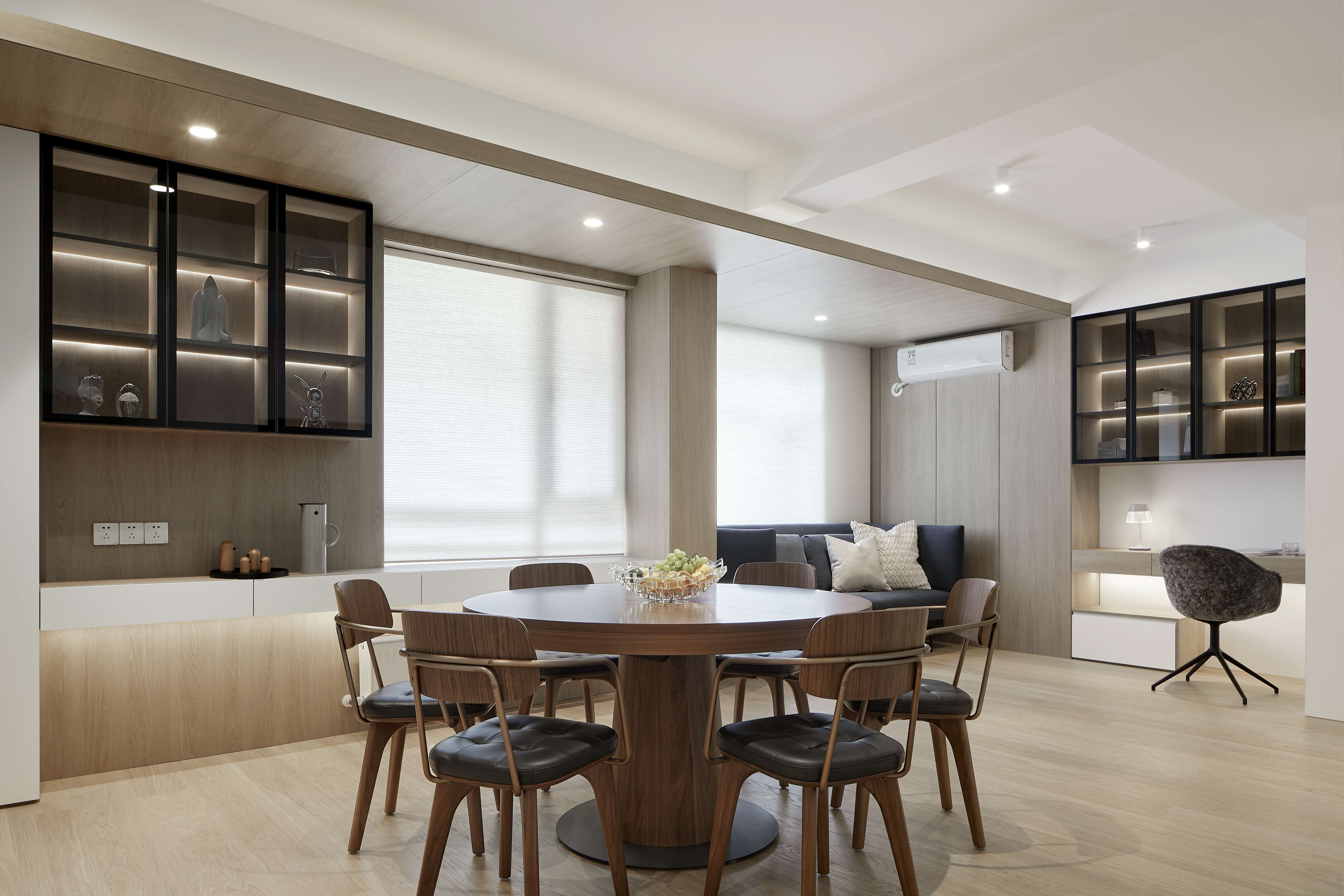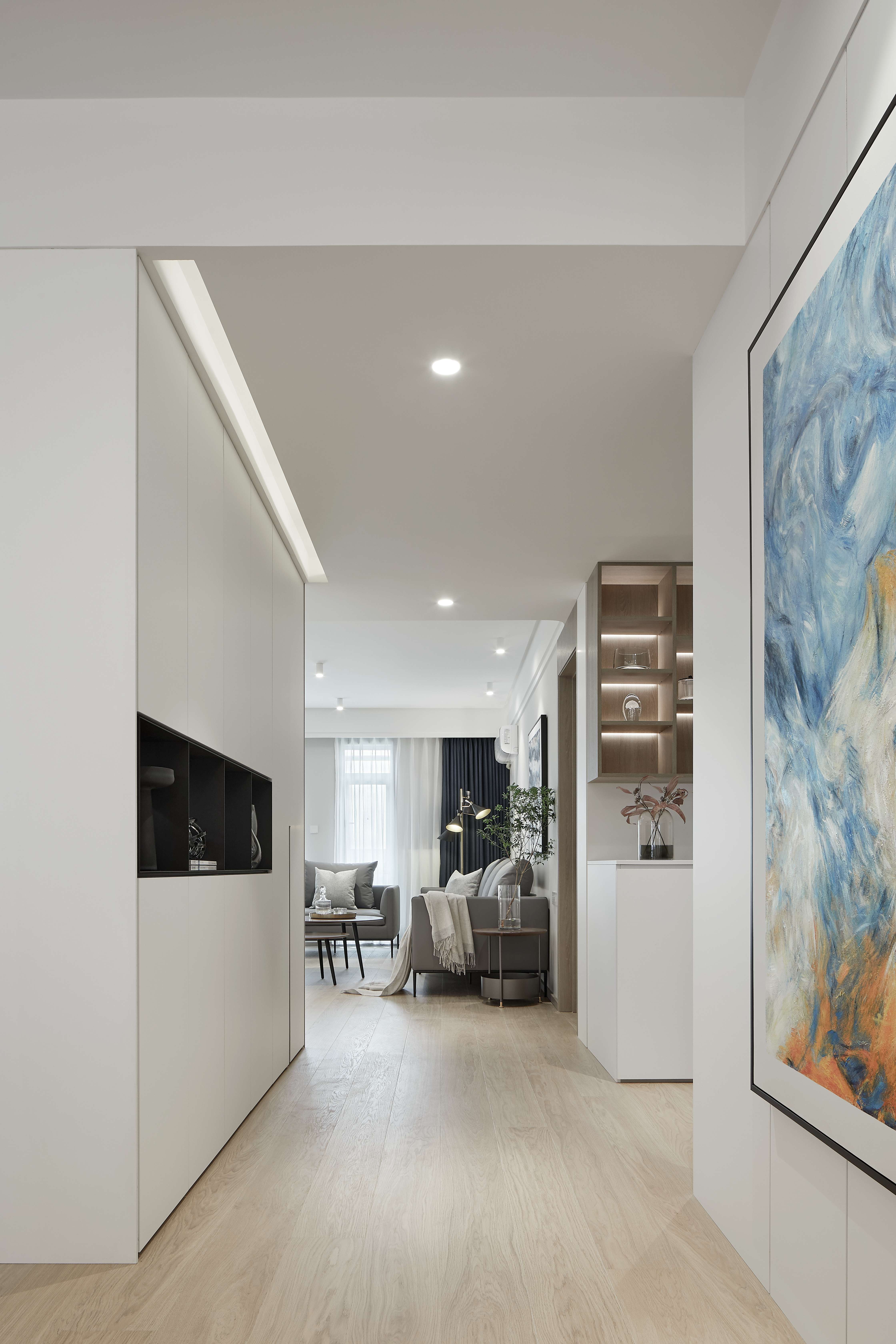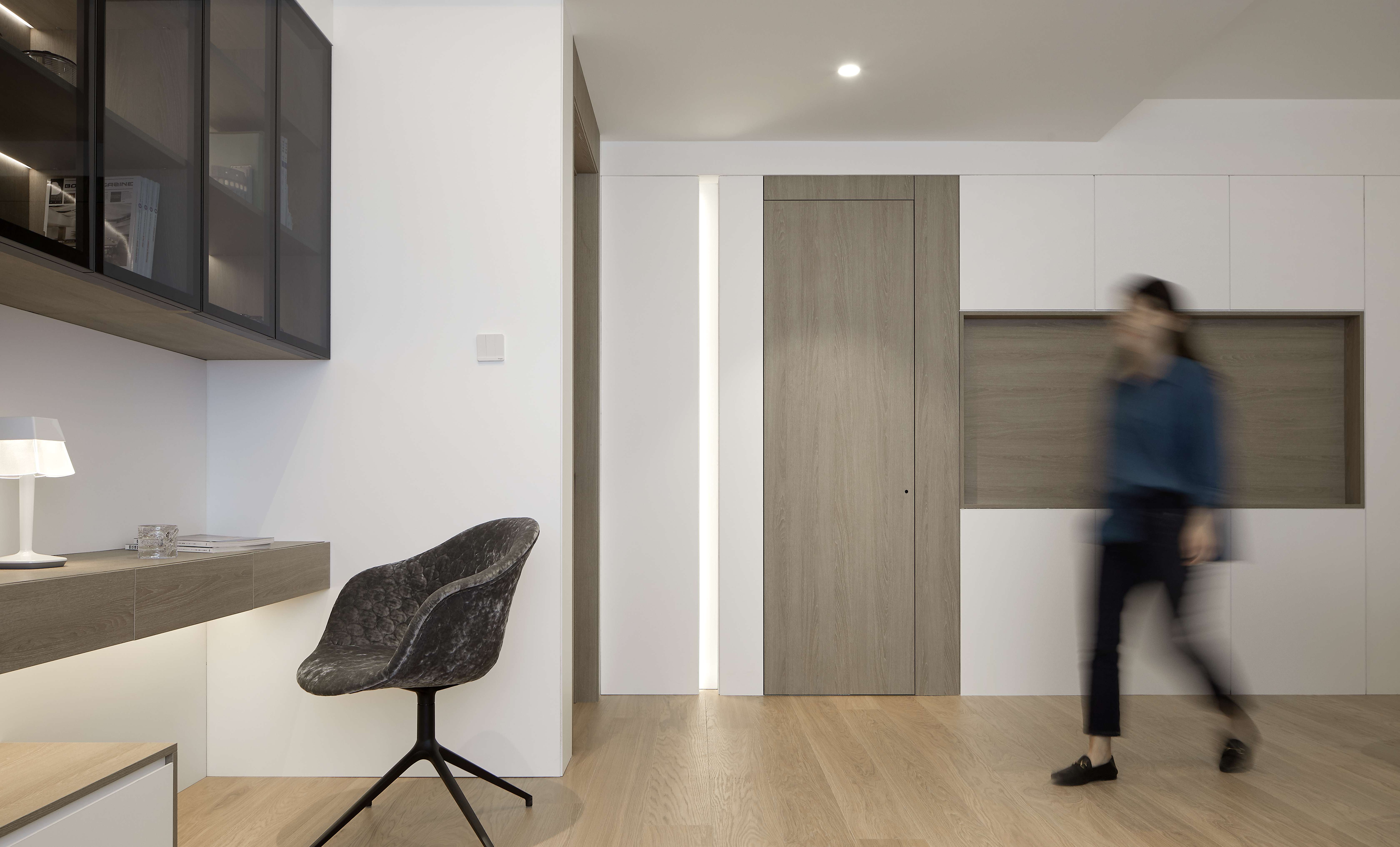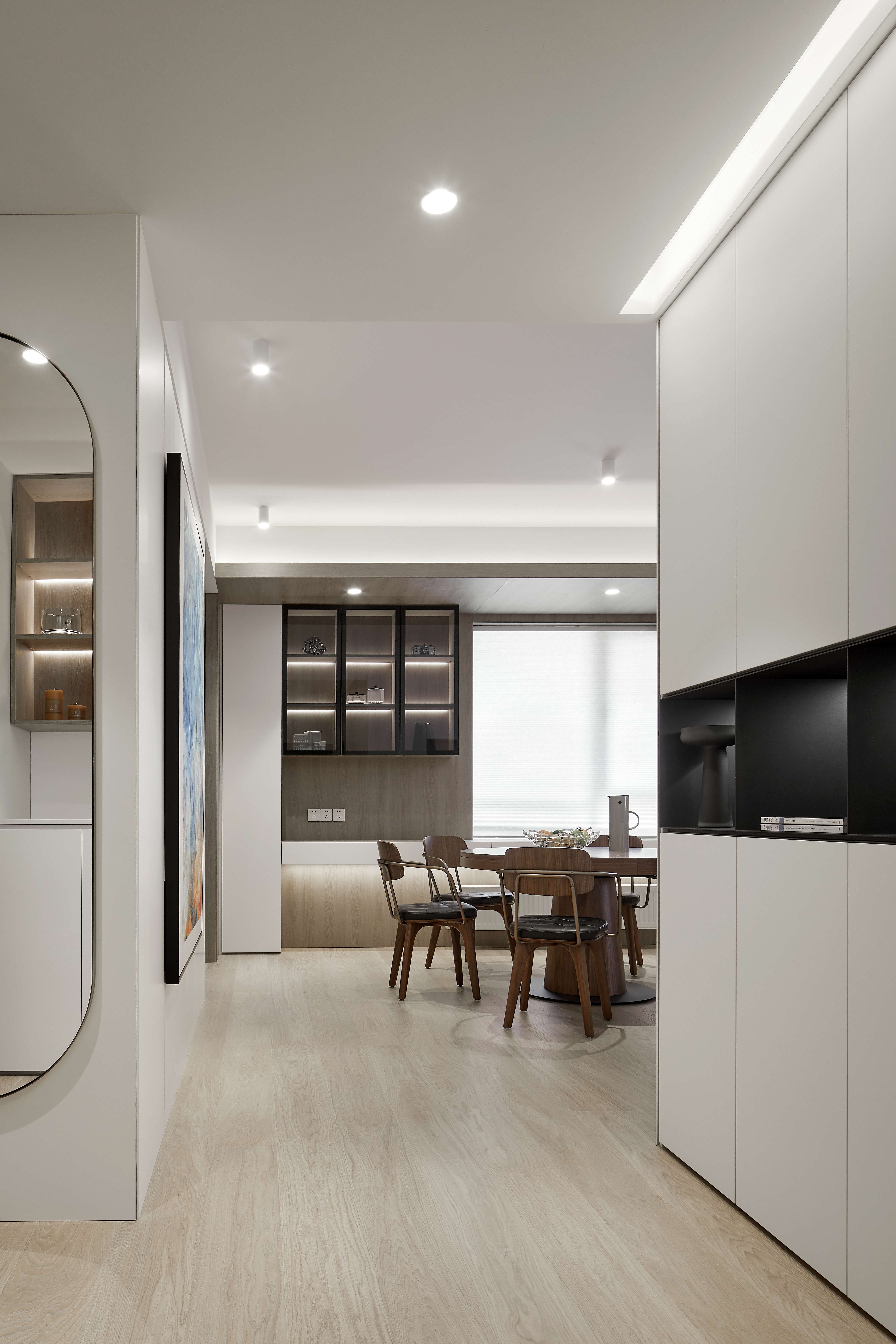 空间意境:从入户处延伸到客厅的木质使用既是对色调的延续,也是满足户主对归属感的需求。我们选择以白色为主调,给予了空间纯净感——大面积白色运用中使用偏深的温暖木质,简约柔和了空间;地面浅色系的木质地板增加了浅色的层次;高脚家具的使用进一步提升了空间的精致感。而在照明方面,我们取消了传统主光源的照明方式,选择氛围灯去烘托空间的简约质感——生活就在光影之间。