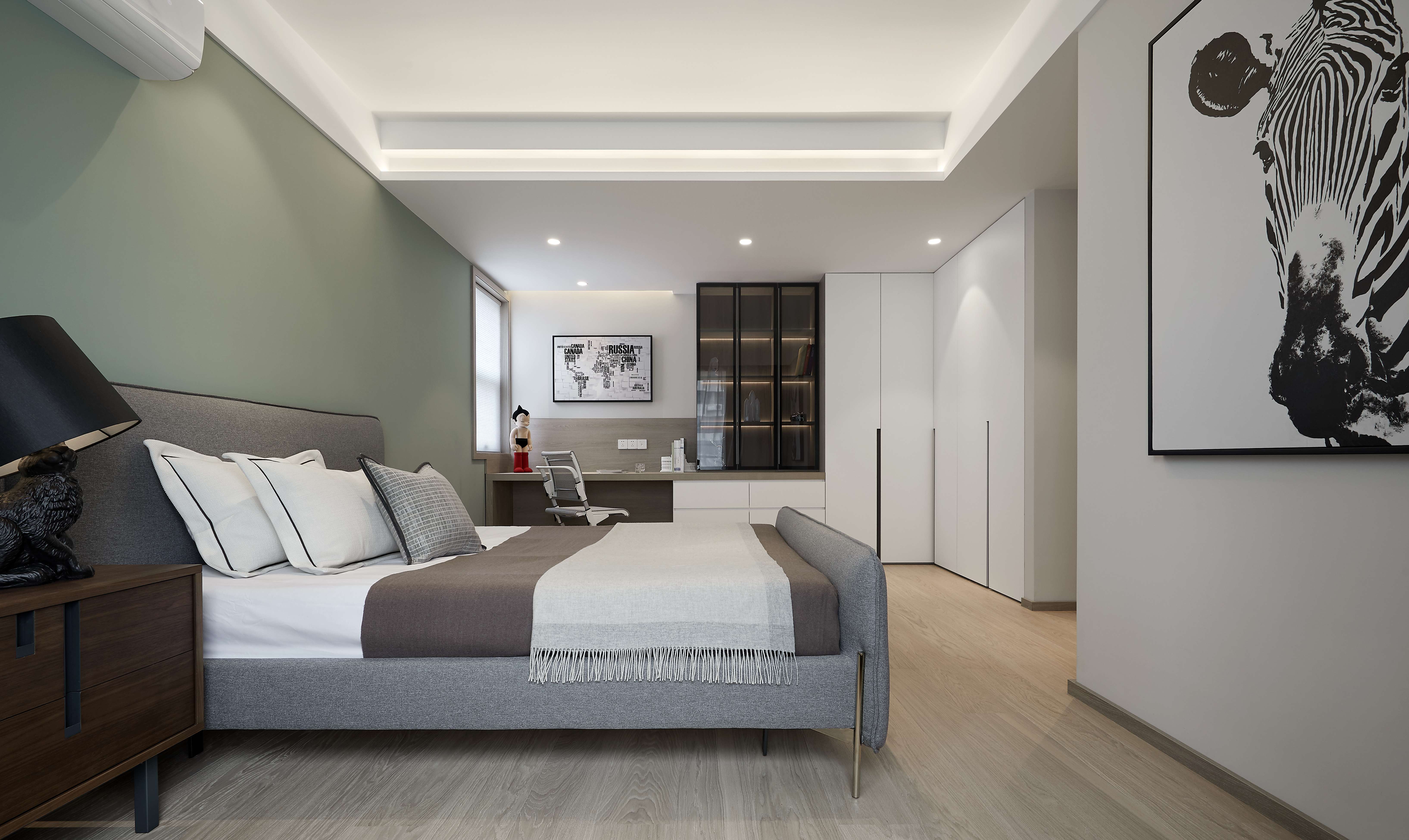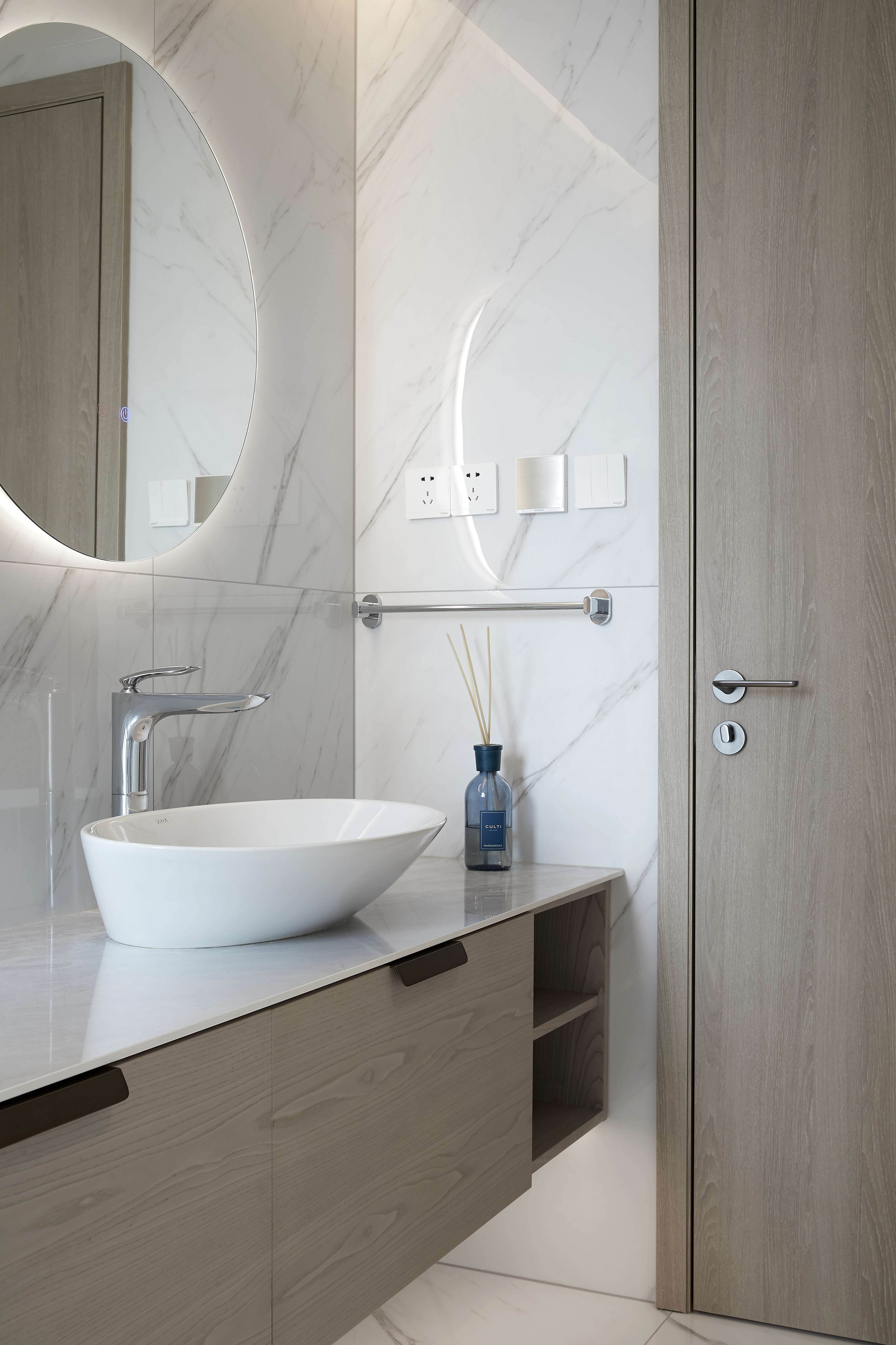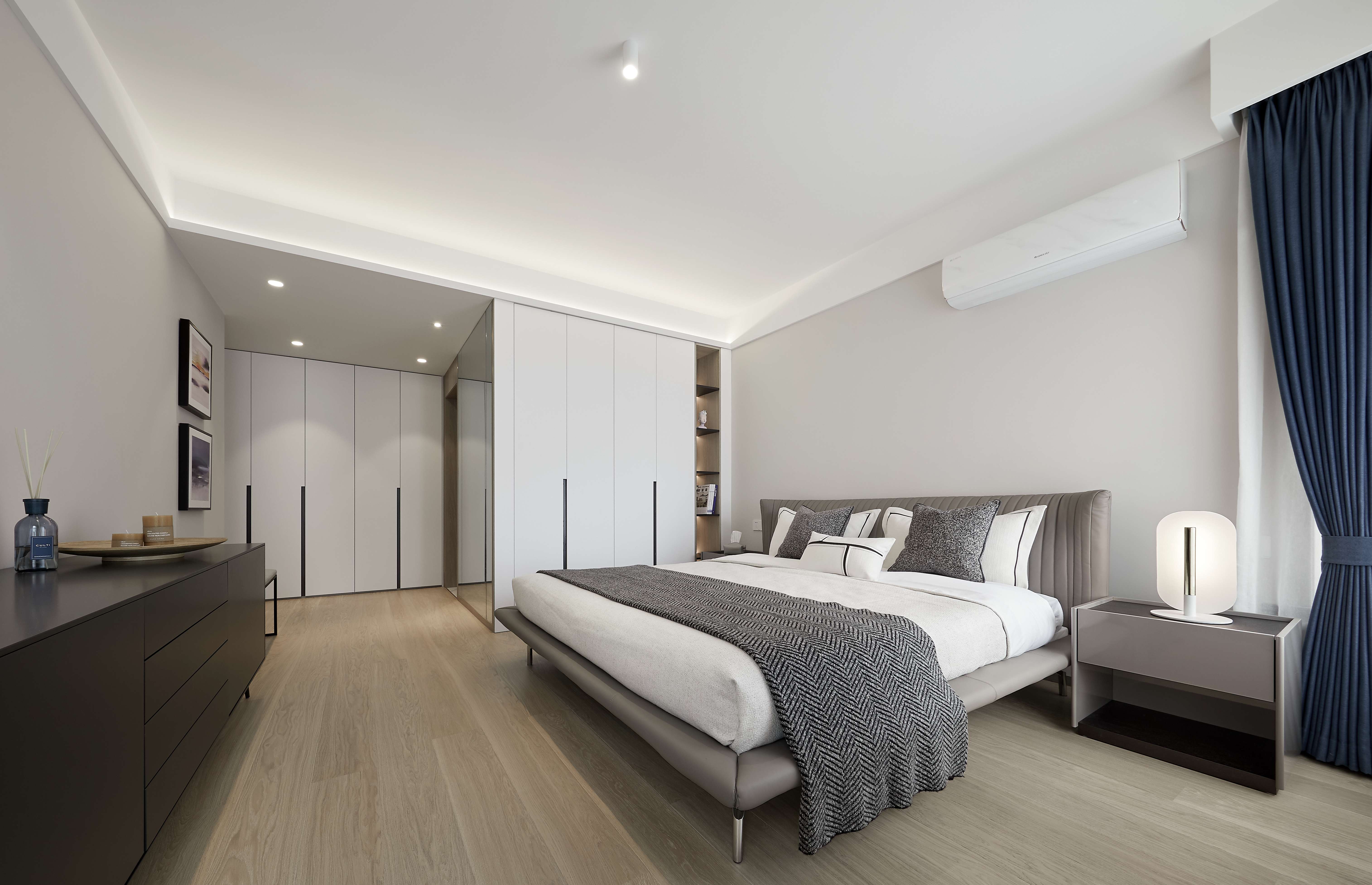 空间布局:餐厅与休闲区相邻,方便业主在用餐过后直接在休闲区歇息。休闲区内充足的阳光映着白帘透出朦胧的惬意,而柜体下低调的暖光既给了区域悠闲的氛围又增强了家具的质感。对向立面造型灯带的设置模拟了自然光源,仿佛是从窄窗外探入的一束光——我们希望业主即使在家里也能感受到户外气息。休闲区设置的座椅与餐厅家具同色系,深色的加入抑制了白色的轻飘,深与浅相和。在增加一道隔墙后,主卧区域内的功能分区布局变得合理起来。浅色系的明亮素朴携着皮质的冷静和丝绒的低奢打造着浅色独特的魅力——纯净是我们的主题。大面积的白配合着浅色的木质使空间在纯净中增加了温暖气氛,简单的线条和白色体块的相遇却有了黑白键的韵律——设计的美好就在抬眼间。