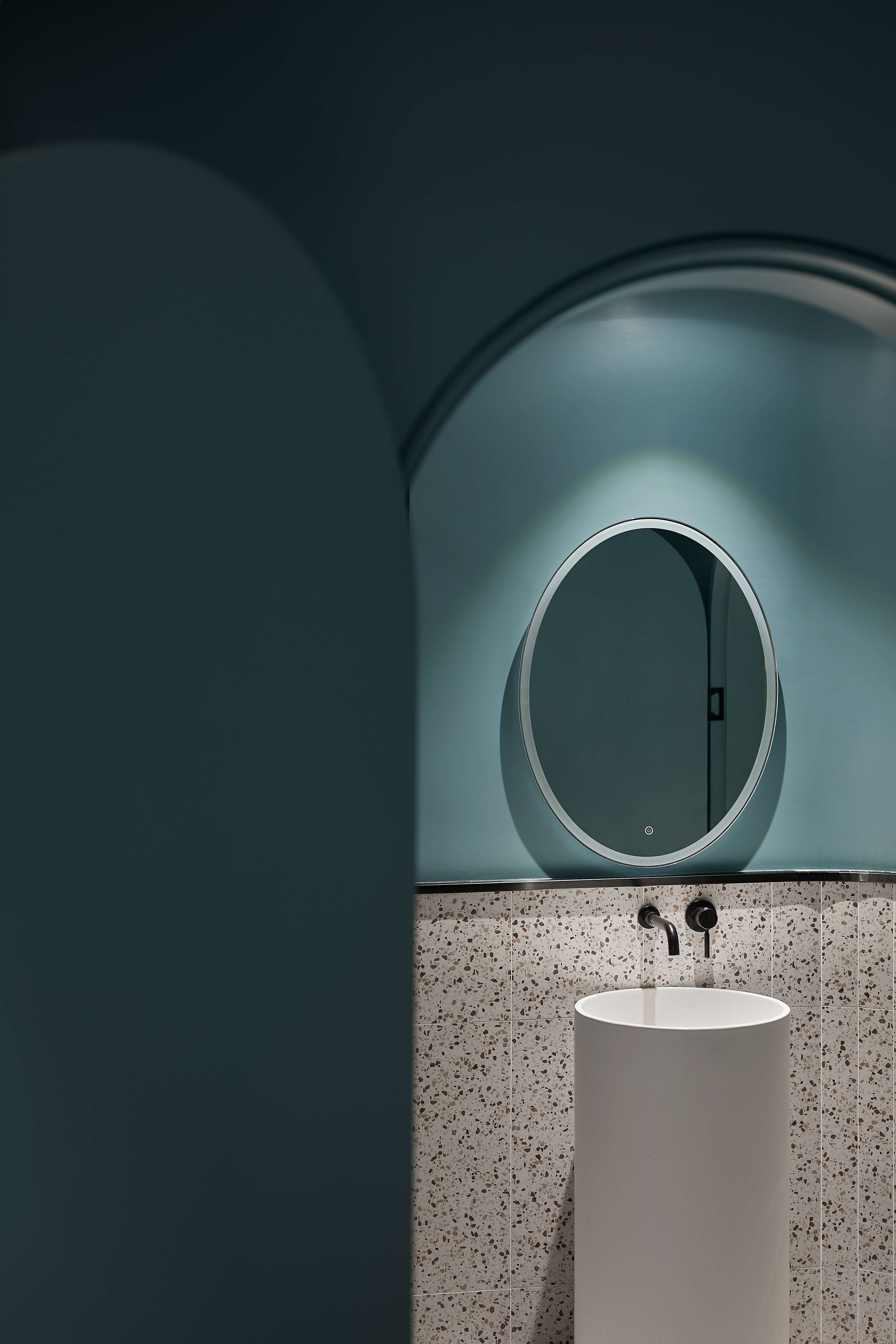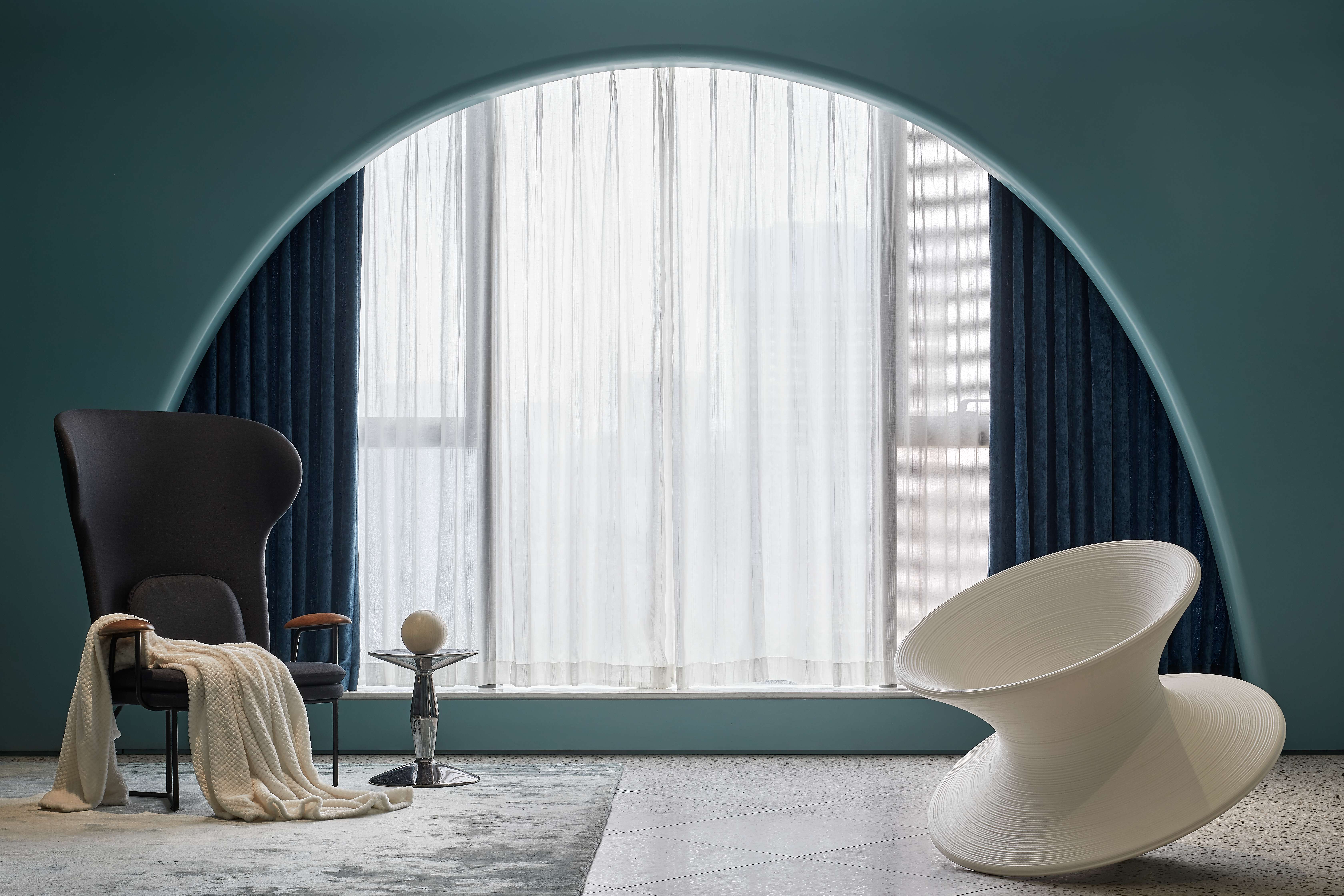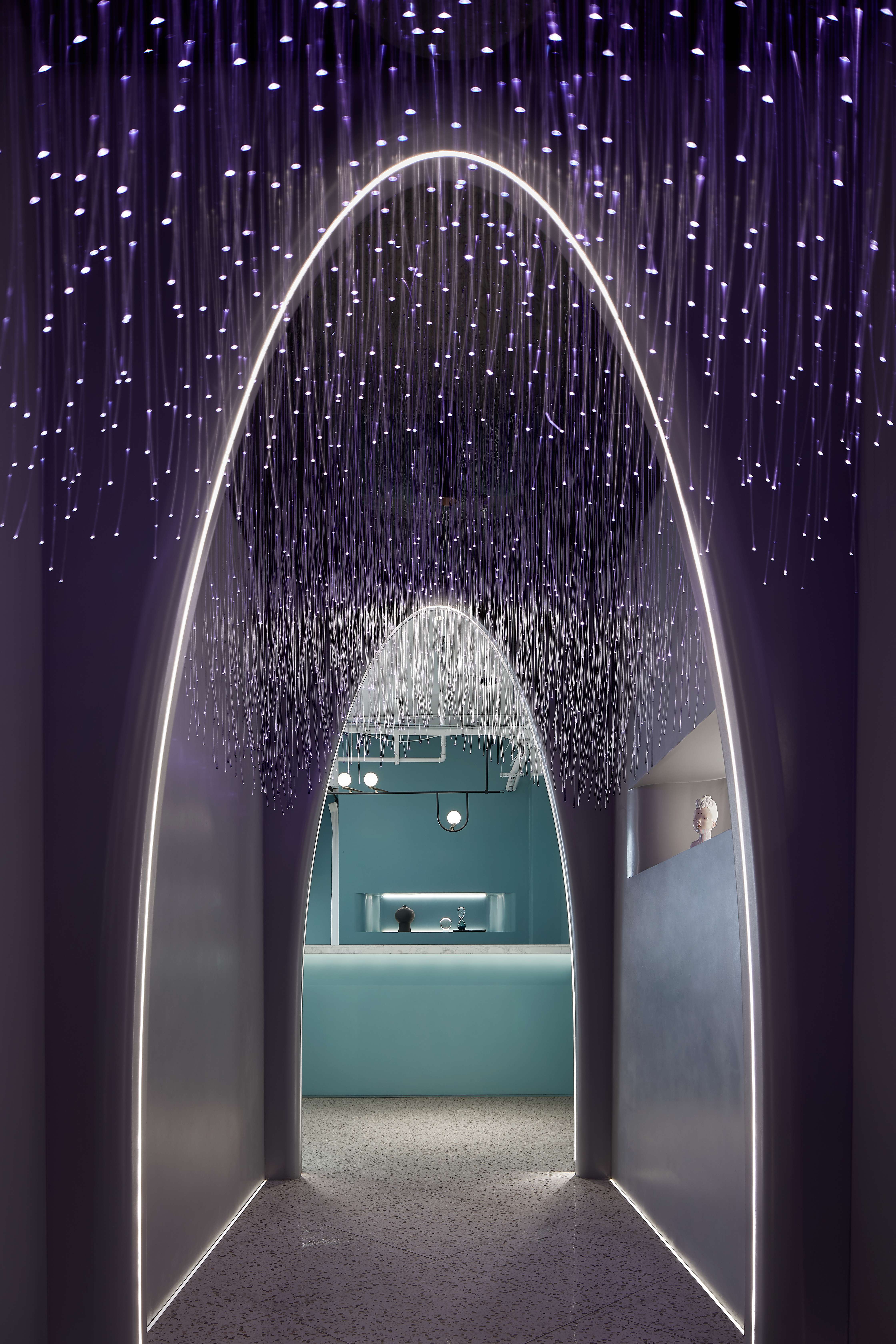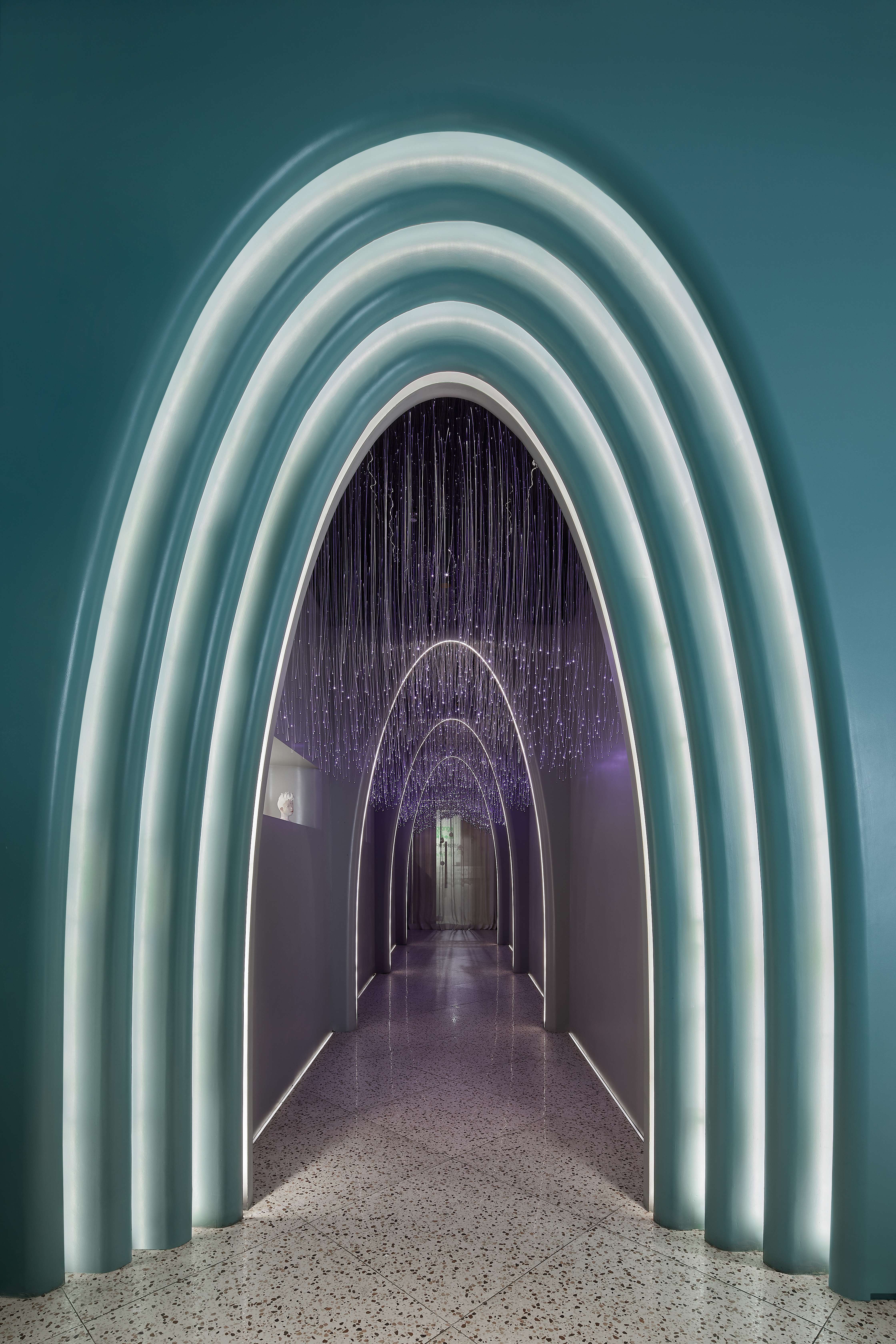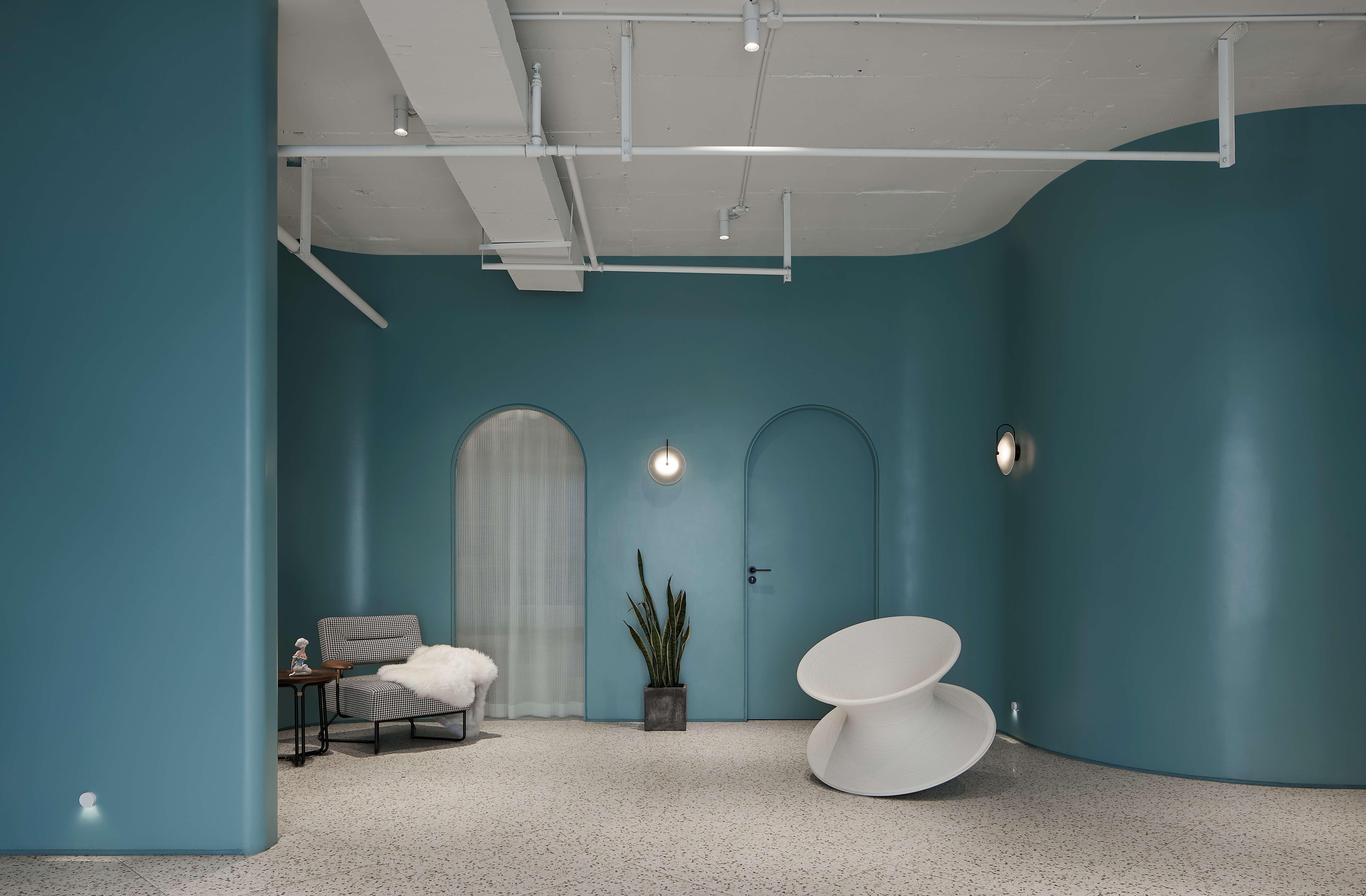 空间意境:入户走廊作为客户的第一视野感觉的核心点,必定需要出彩的设计来体现其重要性,所谓有了第一眼的‘一见钟情’才愿意深入了解这个空间,所以设计师使用降低饱和度的秋思灰色调来搭配浪漫氛围十足的光纤灯的代表着交融与互动,将原本枯燥乏味的美容过程通过一系列的梦幻视觉输出,彰显出来的柔和与温暖是为女性独有的象征。弧形灵感来源于女性曲线美,所以在固化造型的创作中从入户走廊开始我们加入各种拱形门洞和弧边弧角来做空间处理,这让空间看上去更加''圆润'',传达Queenhoo(谦和国际)对于大环境的包容性,实则是让客户感受到轻柔与舒适的环境尤为重要,客户一踏进这个空间就会自然而然的地放松下来,通过清新舒缓的空间环境营造的氛围来缓解紧张和心理压力。空间用弧线与直线的结合,使空间更加具有趣味性,人在空间中走动时,好奇心油然而生。纱帘和波纹状玻璃的存在,使空间中添加了一丝神秘的感觉,整个空间多了若隐若现的小乐趣,由近至远的视角变化不仅体现了细节的精致,还能展现空间、光影与人的互动。